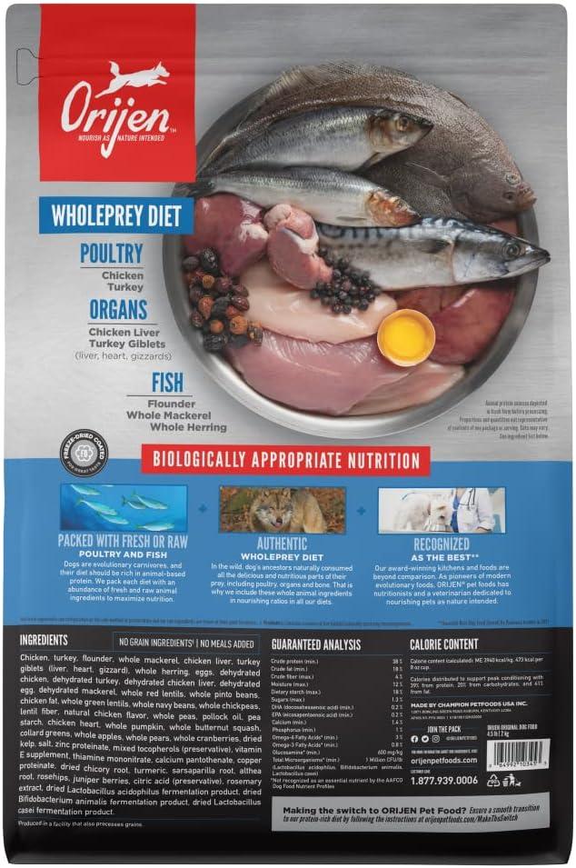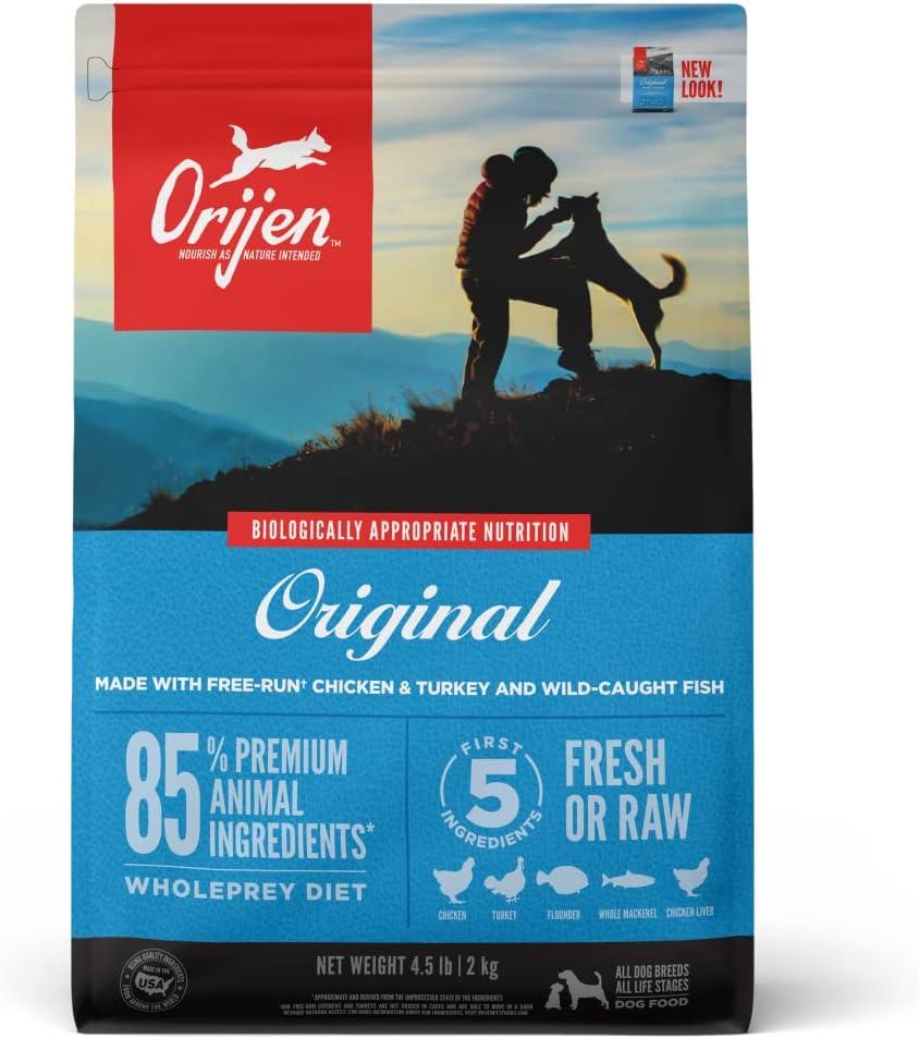 ORIJEN Original dog food delivers a diet rich and varied in fresh, whole animal ingredients from free-run chicken and turkey, wild-caught fish, and cage-free eggs