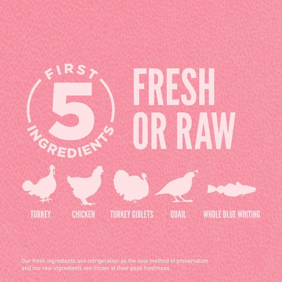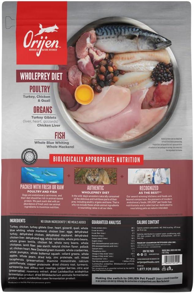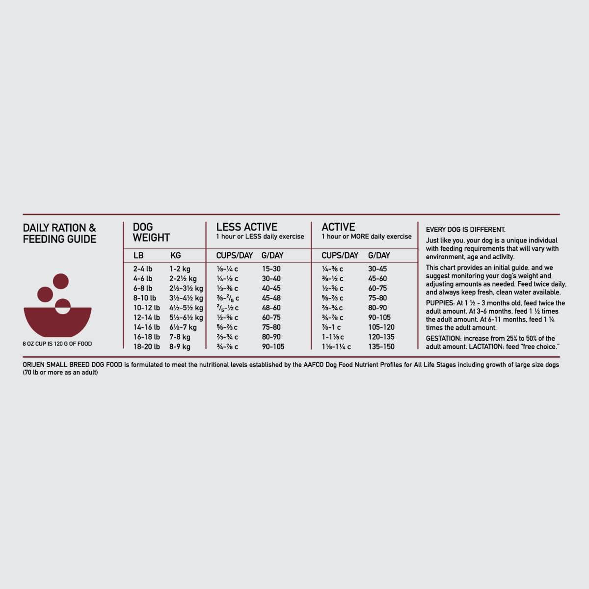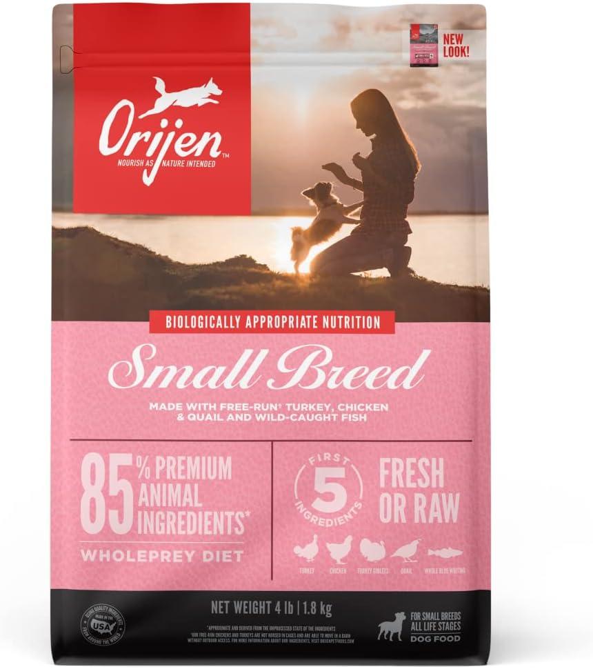 Introducing ORIJEN Dog Small Breed Recipe, a premium kibble designed specifically for smaller dogs with high energy needs. This balanced nutrition formula is packed with protein-rich turkey, chicken, wild-caught fish, cage-free eggs, and quail, all in a unique kibble shape that's easy for small breeds to eat. The ORIJEN Small Breed recipe supports eye health with lutein-enriched eggs and comes with an OXO Good Grips Pet POP Container for convenient, fresh storage. The airtight seal keeps food fresh and pests out, while the detachable -cup scoop ensures easy serving. This 4-pound bag of dog food is perfect for small breeds of all life stages, providing a balanced diet to maintain energy levels. Store at room temperature, away from direct sunlight.