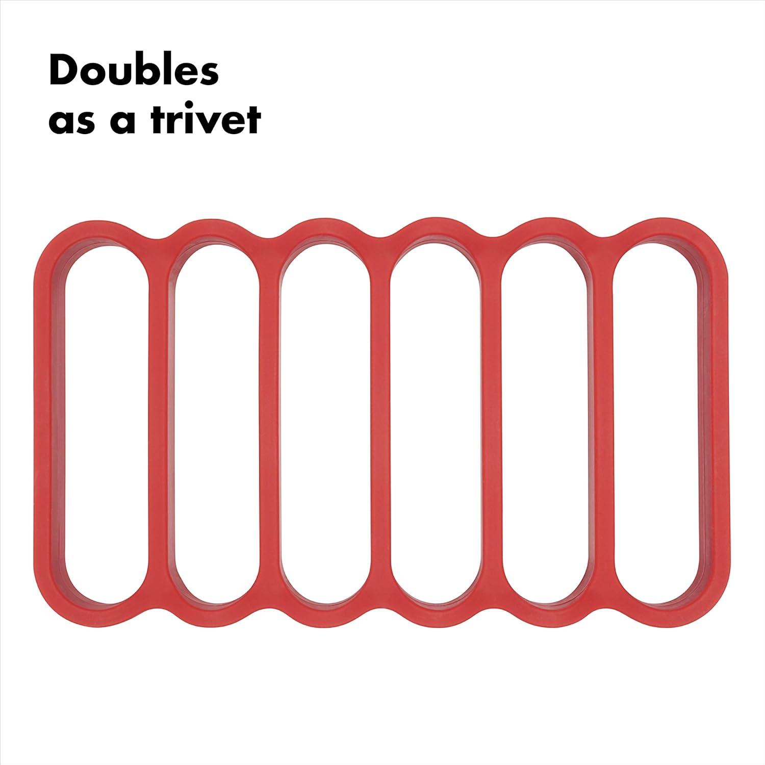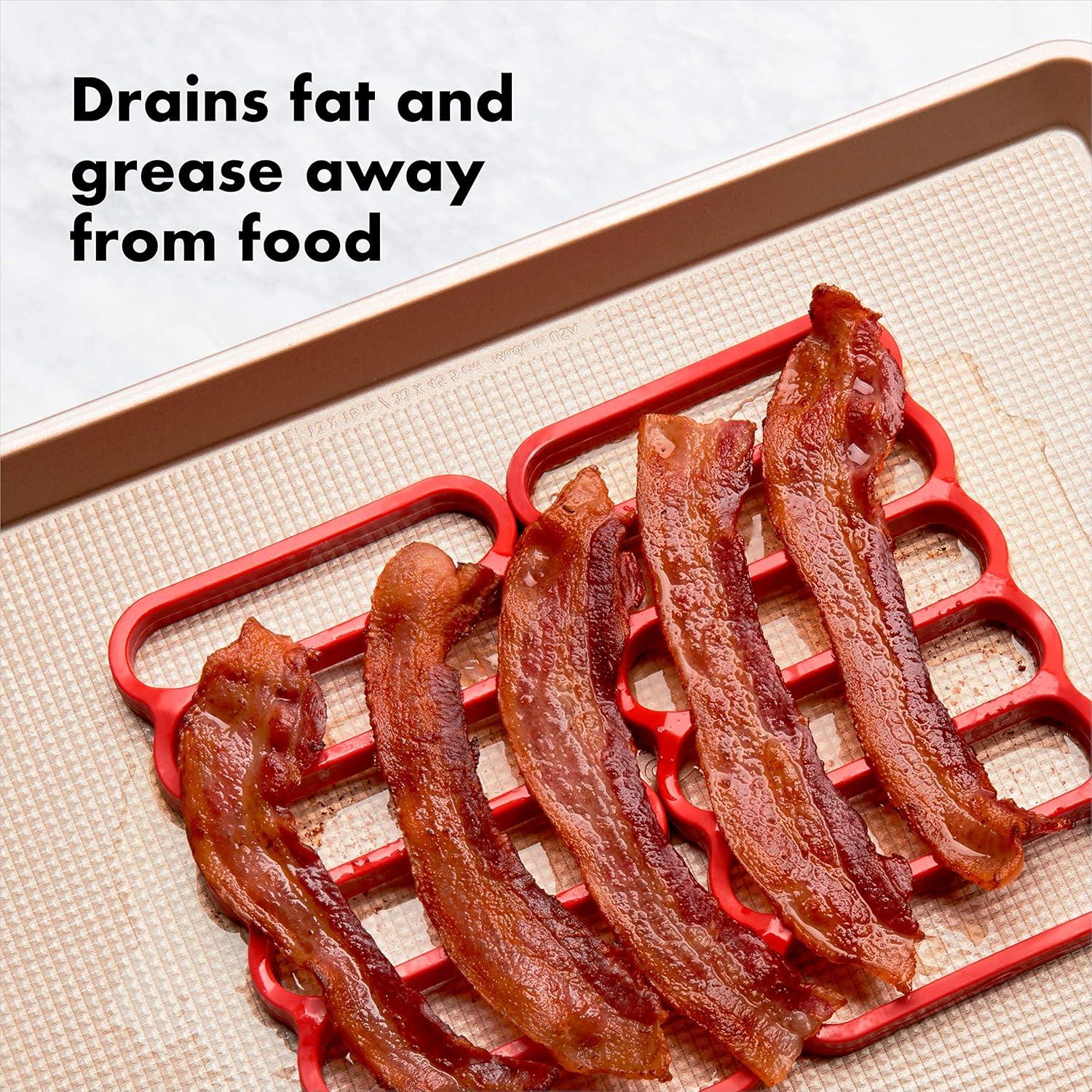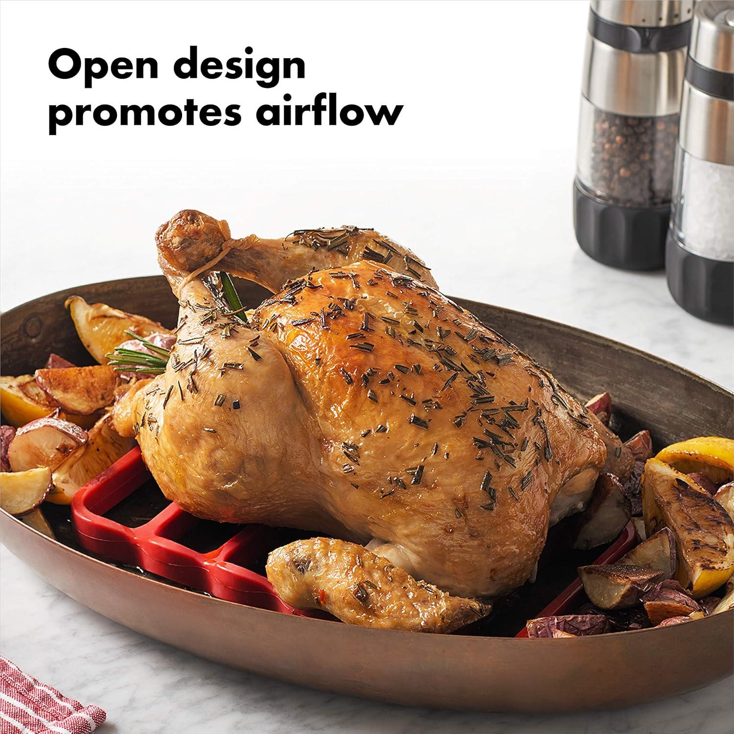 Elevate your cooking experience with the OXO good grips roasting rack. The rack lifts food above the bottom of the pan to help prevent sticking and burning, and allows fat and grease to drain for healthier cooking (no more soggy bottoms!). the open design promotes air circulation for fast, even roasting of roasts, poultry, fish, bacon and vegetables. The silicone construction also makes it perfect for use as a trivet, while also being a breeze to clean. Use this set of two separately, side by side in the same pan, or stacked for extra elevation.
