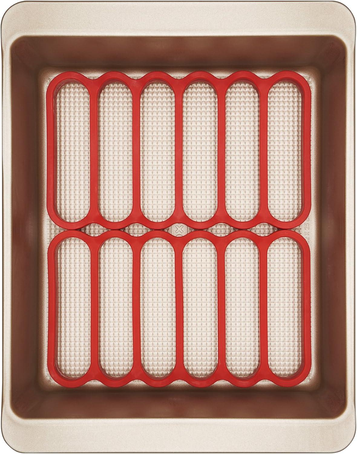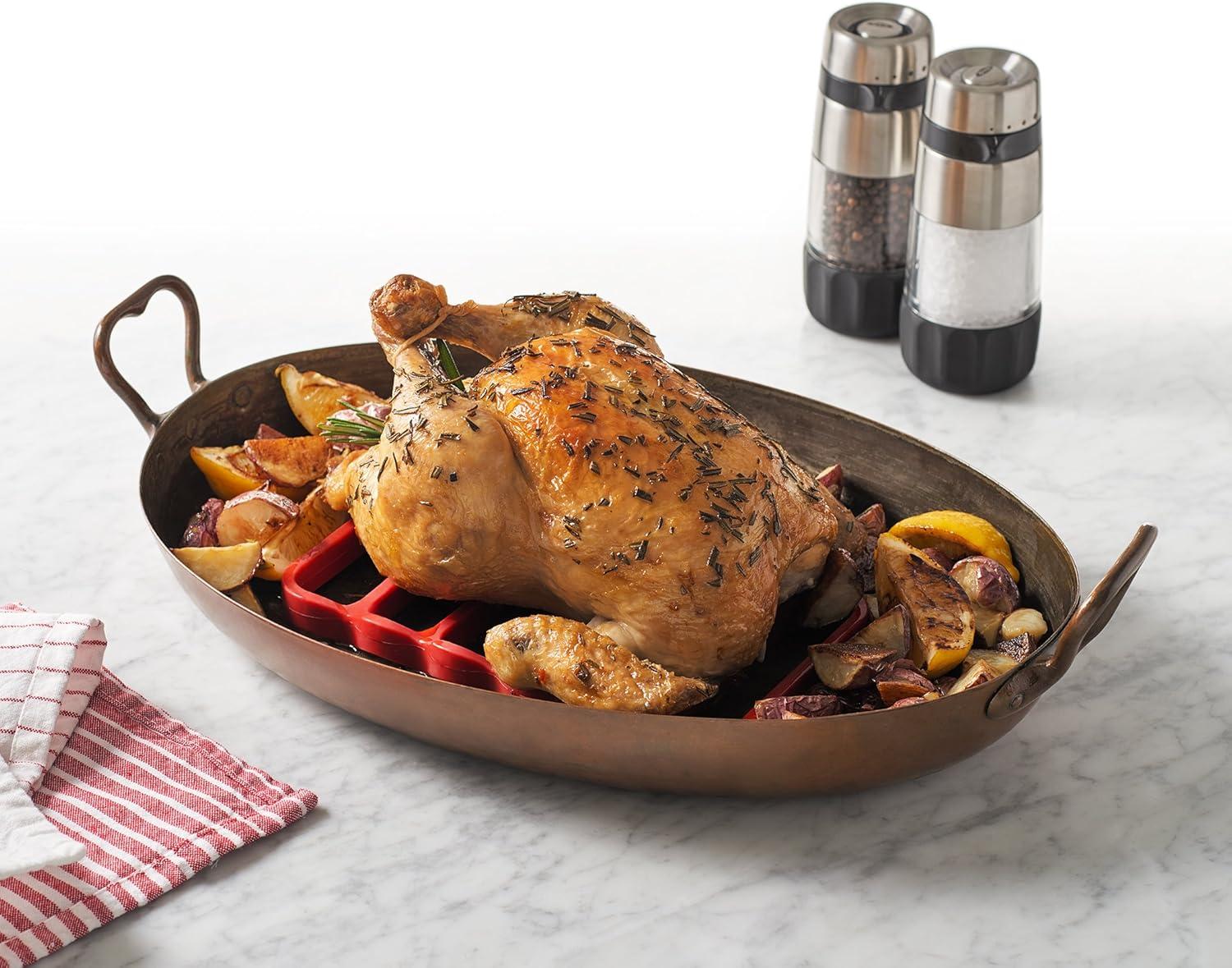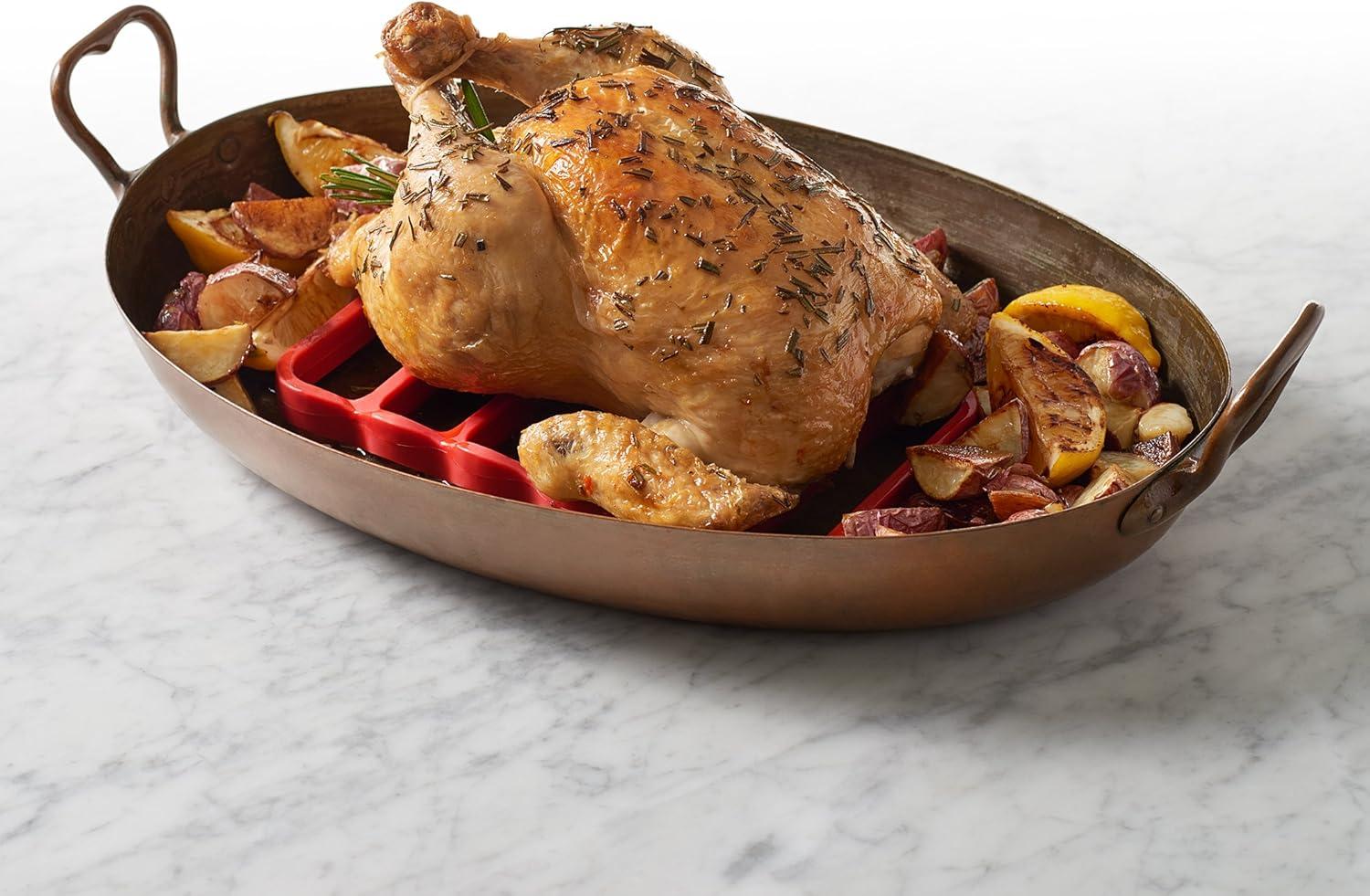 Elevate your cooking experience with the OXO good grips roasting rack. The rack lifts food above the bottom of the pan to help prevent sticking and burning, and allows fat and grease to drain for healthier cooking (no more soggy bottoms!). the open design promotes air circulation for fast, even roasting of roasts, poultry, fish, bacon and vegetables. The silicone construction also makes it perfect for use as a trivet, while also being a breeze to clean. Use this set of two separately, side by side in the same pan, or stacked for extra elevation.