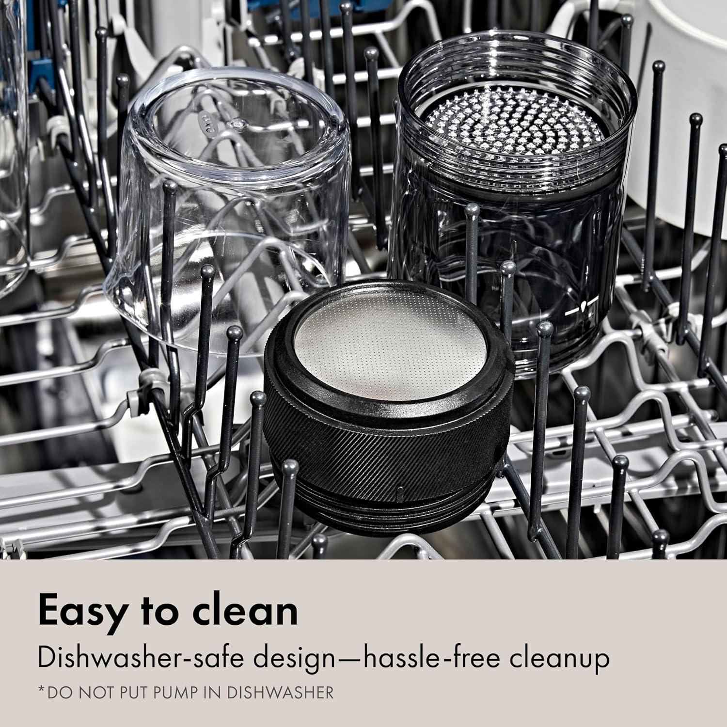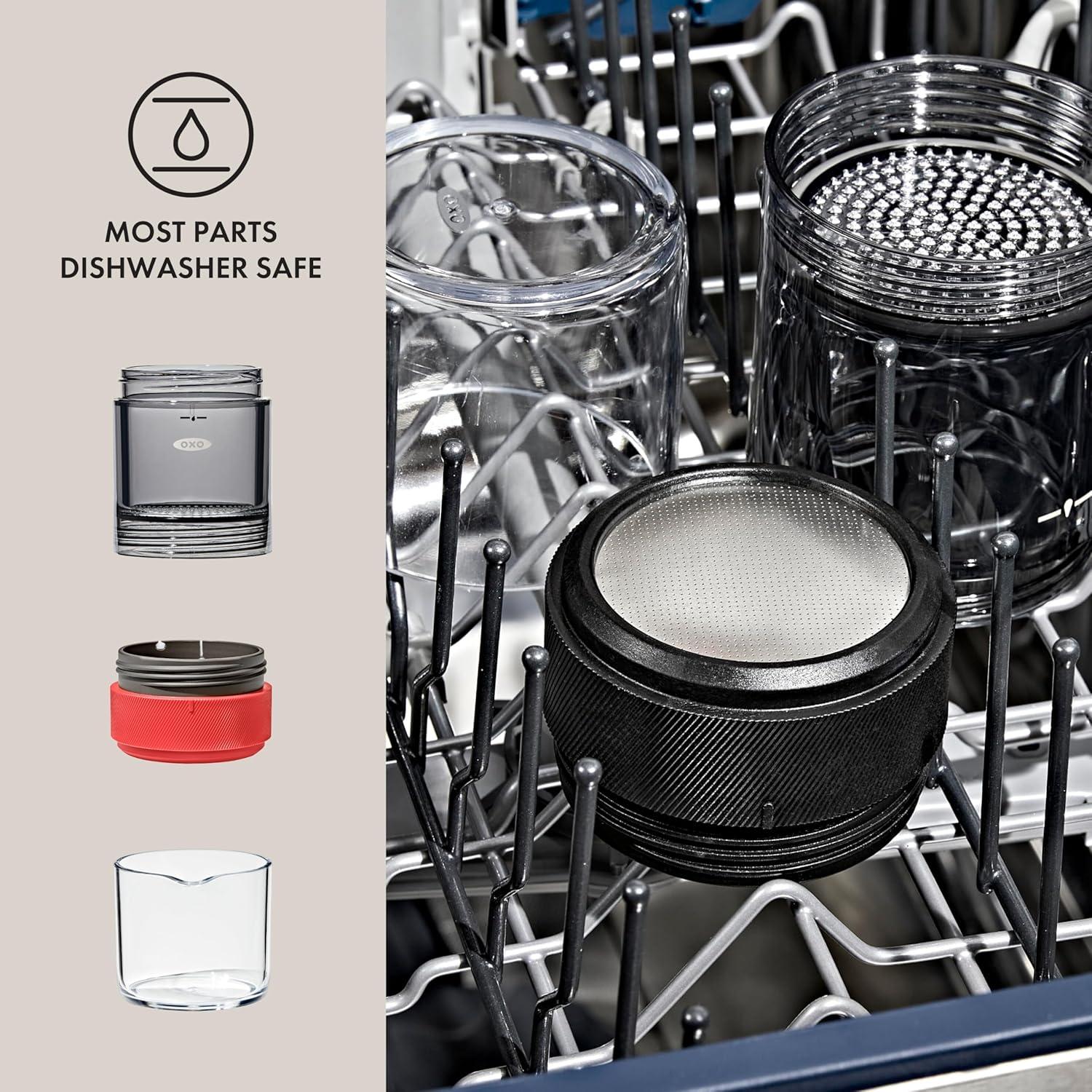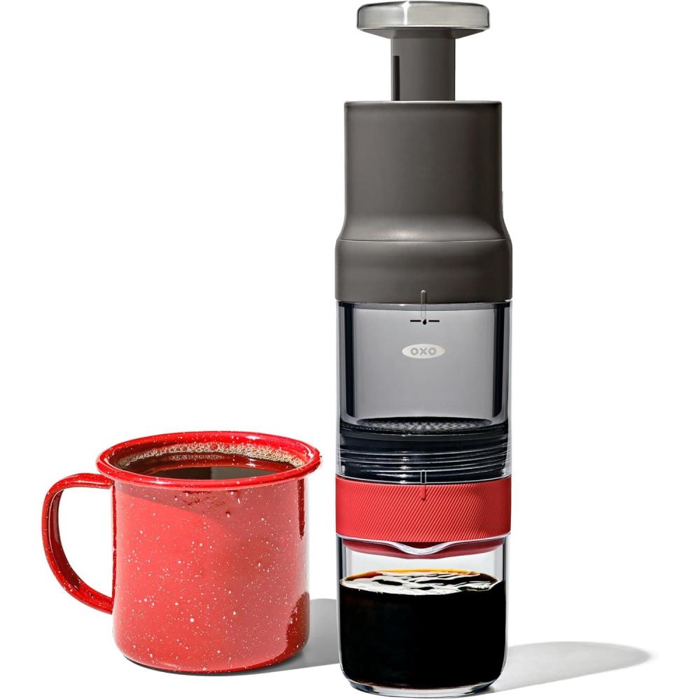 Your perfectly crafted cup of coffee isn’t stuck behind a counter or at the end of a long line—it’s in the palm of your hand. The OXO Rapid Brewer is a compact, manual coffee maker that brews rich, espresso-style concentrated coffee on demand. Just dilute with hot or cold water or milk in a 1:2 or 1:3 ratio to create your perfect café-style cup. No plugs, no charging, no fuss. This portable coffee maker is roughly the size of a travel mug or thermos, and fits easily in your backpack, purse, or carry-on. It’s a truly travel-ready, cordless coffee machine—ideal for commutes, hotels, or your next unplugged morning. Forget expensive pods and wasteful paper filters—this small coffee maker features a built-in stainless steel filter and a tamper to level your grounds for even extraction and bold, barista-worthy flavor. To use, just add finely ground coffee to the fill line, tamp firmly, and add hot or cold water. Wait two minutes for hot coffee or five for cold brew. Then unlock the pump with a quick quarter turn and press your concentrate into the included carafe. The pump also locks securely for safe travel and storage. Pour your concentrate into a mug, cup, or glass, then dilute with your choice of water, milk, or ice to your taste. Customize the strength, temperature, and volume to create anything from an Americano to a Vietnamese-style cold brew—or even an affogato. This compact coffee maker puts the power of the café in your hands. Say goodbye to microwaved mugs, overnight waits, and overpriced barista brews. The OXO Rapid Brewer is your go-to portable single-serve coffee maker—perfect for traveling, camping, or daily use. It’s also easy to clean: everything but the pump is dishwasher safe. The carafe and water chamber are made from durable Tritan Renew, which contains 50% certified recycled content.