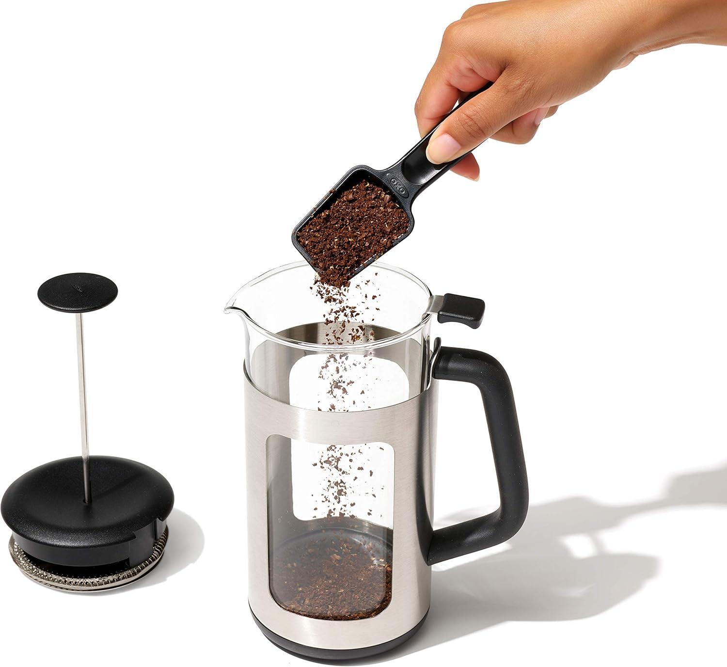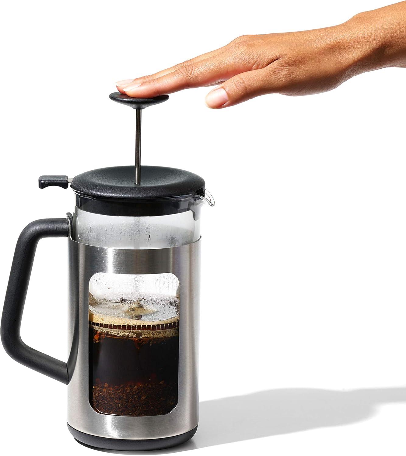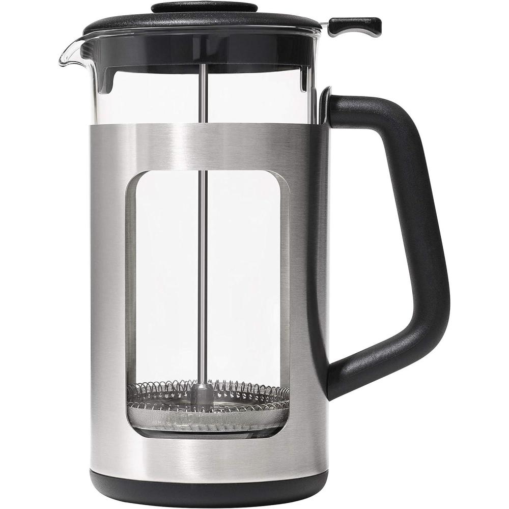 The OXO Brew 8-Cup French Press with GroundsLifter makes brewing the perfect cup of coffee a pleasure. Even cleanup is better, thanks to the innovative GroundsLifter. Just lift the handle and the stainless steel and silicone GroundsLifter acts like a squeegee, clearing out used grounds in one move – no digging or dealing with wet, clumpy grounds required. The fine mesh stainless steel filter keeps stray grounds out of your brew, while the soft, non-slip handle is designed for comfort while pouring. Stainless steel housing protects and insulates the borosilicate glass carafe. Hand wash only.
