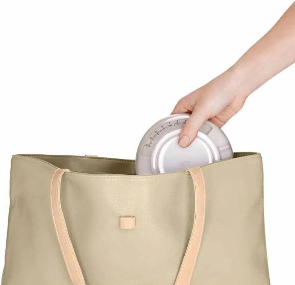 Slim, compact shape fits into bags or purses with bowl securely snapped onto the base