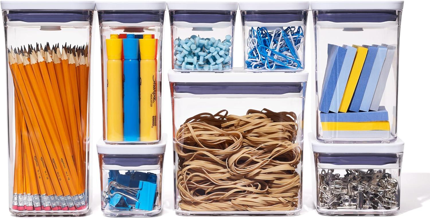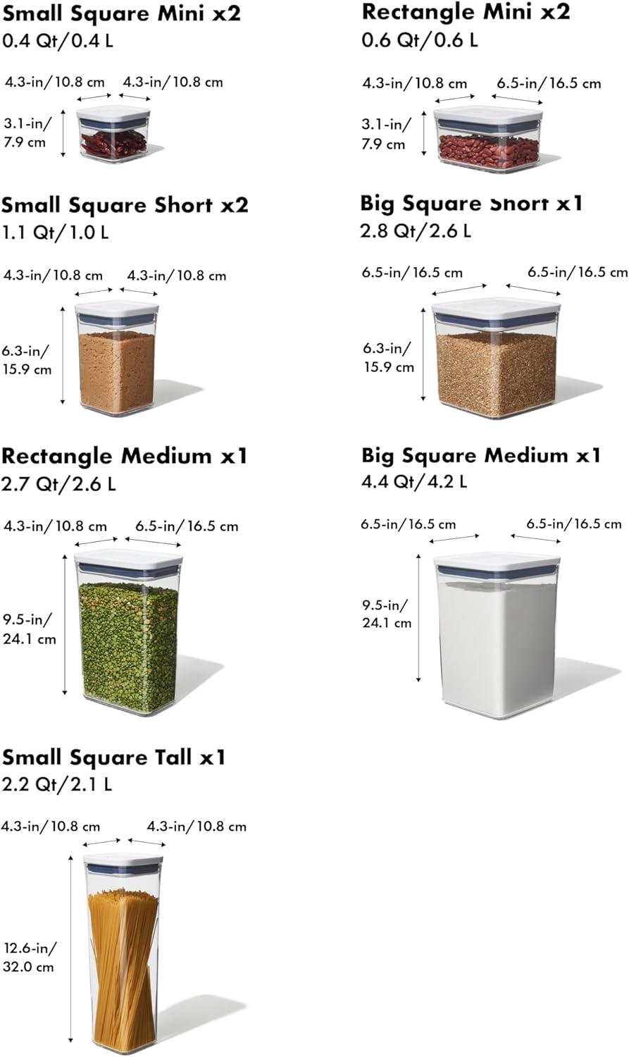 The OXO Good Grips 10-Piece POP Container Set is designed to keep dried goods fresh and household essentials organized. Airtight, stackable, space-efficient and completely dishwasher safe, OXO POP food storage containers come in a variety of stackable sizes. Each container has a push-button lid that creates an airtight seal—and doubles as a handle for easy, one-handed opening. POP Containers are perfectly calibrated to store common household staples. New shapes, sizes and colors provide new possibilities for storing everyday must-haves like flour, sugar, coffee, cereal, oatmeal, coffee, grains, pasta and spices. With a handy fill line to guide you, curved corners for smooth dispensing and sturdy, BPA-free construction, these airtight food storage containers take tidying to the next level. Push the button to engage the airtight seal. The button doubles as a handle for the lid. For best results, always use the button to open and close. Do not carry POP Containers by the lid. POP Containers aren’t just for kitchens: use them any place you want more organization. OXO expanded the possibilities of POP with a line of eight solution-based accessories that conveniently attach to lids. Accessories sold separately. Set includes: one (1) 2.8 Qt container, one (1) 2.7 Qt container, one (1) 2.2 Qt container, one (1) 4.4 Qt container, two (2) 1.1 Qt containers, two (2) 0.6 Qt containers and two (2) 0.4 Qt containers.