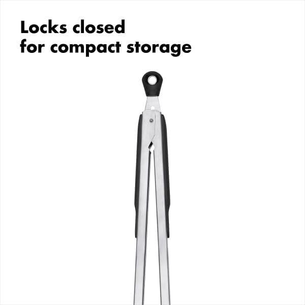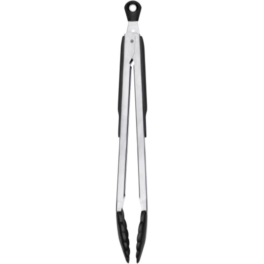 A kitchen essential, a good pair of tongs will see you through the toughest cooking tasks while protecting your busy hands from the heat of the oven or stovetop. The OXO Good Grips 12-inch Tongs with Nylon Heads are constructed with sturdy, high-heat resistant nylon, so they’ll stand up to hot grills while being safe for your non-stick skillets. Our Tongs feature scalloped edges for a secure grip whether you're rotating thin asparagus or flipping a thick steak. The handles provide a non-slip grip and absorb pressure so you can grip, toss, turn and flip with comfort and control. The Tongs lock closed for compact storage when hanging or in a drawer. Dishwasher safe. 12 in/30.48 cm. Also available in 9-inch size.