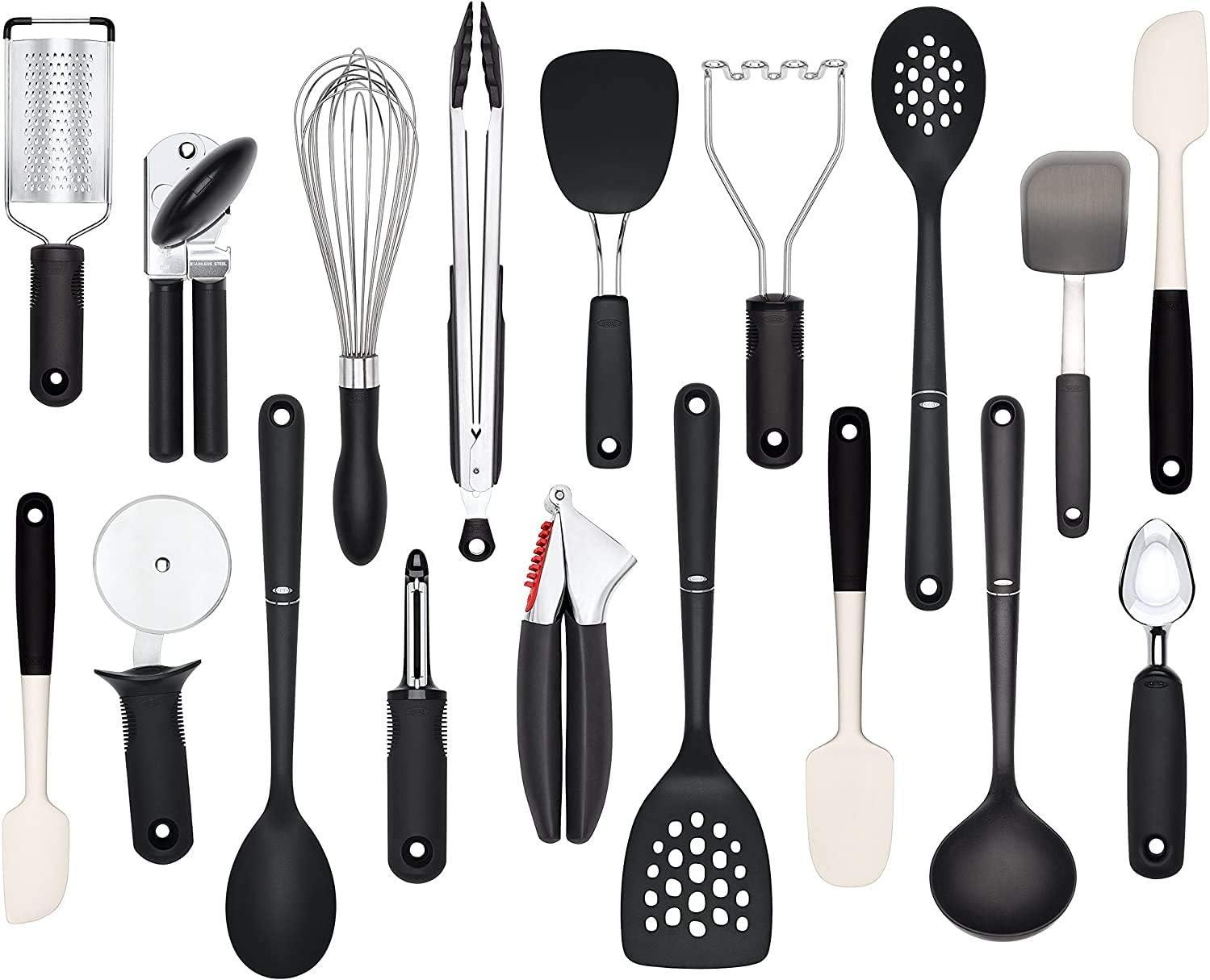 Whisk and stir. Lift, flip and transfer. Scoop, mash, peel and more. With the OXO Good Grips 15-Piece Everyday Kitchen Tool Set, you can accomplish any kitchen task with ease. This well-rounded collection makes a great gift and includes OXO's most useful utensils for whipping up a meal – plus a sleek stainless steel holder with removable drip tray to keep them organized. The nylon and silicone tools are heat-resistant and safe for non-stick cookware, and each utensil has a soft, non-slip grip for comfort. Set includes: Grater, Swivel Peeler, Ice Cream Scoop, Potato Masher, Soft-Handled Can Opener, 11-in Balloon Whisk, Silicone Spatula, Meat Tenderizer, 4-in Pizza Wheel, Flexible Turner, Square Turner, Spoon, Slotted Spoon and 12-in Tongs with Nylon Heads. Silicone and nylon tools are dishwasher safe, hand wash other items.
