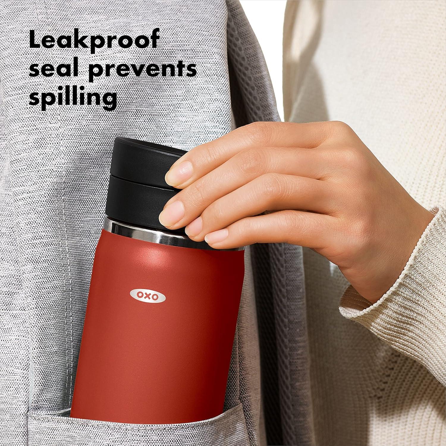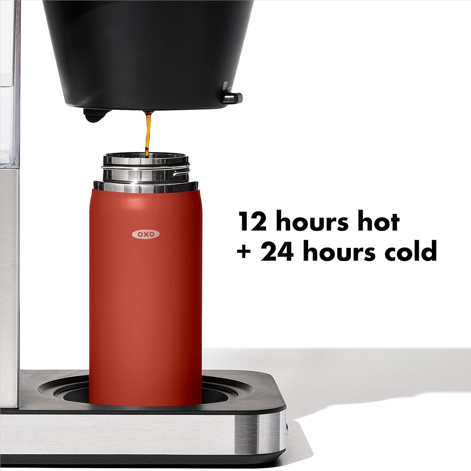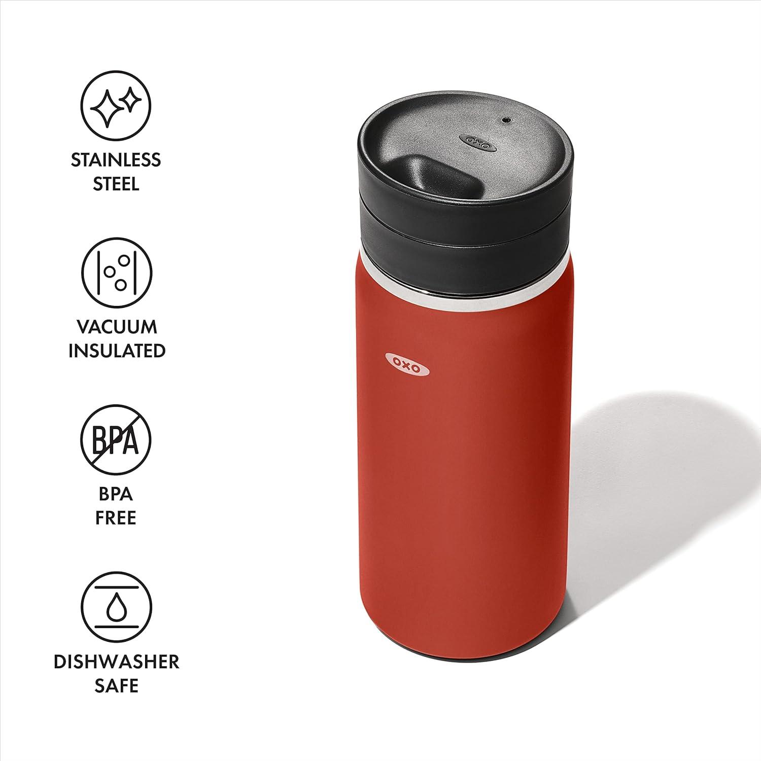 Whether your first sip is at the kitchen counter, in the car or on a walk with the dog, with the OXO Thermal Mug with SimplyClean™ Lid, you can enjoy your favorite brew without missing a beat. Professional-grade stainless steel allows the flavor of your drink to shine through, while the BetterTemp™ vacuum insulation keeps liquids hot for 12 hours or cold for 24 hours. The SimplyClean™ lid twists open for sipping and fully disassembles for thorough cleaning. A sweatproof coating provides a secure grip no matter where the day takes you. This travel mug is sized to fit most coffee makers and cup holders for easy brewing and stowing. Dishwasher safe.