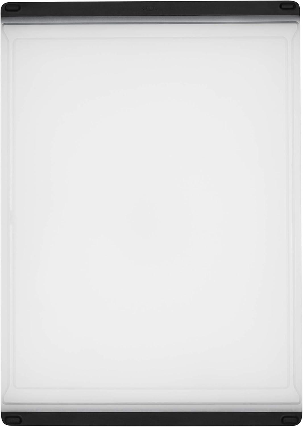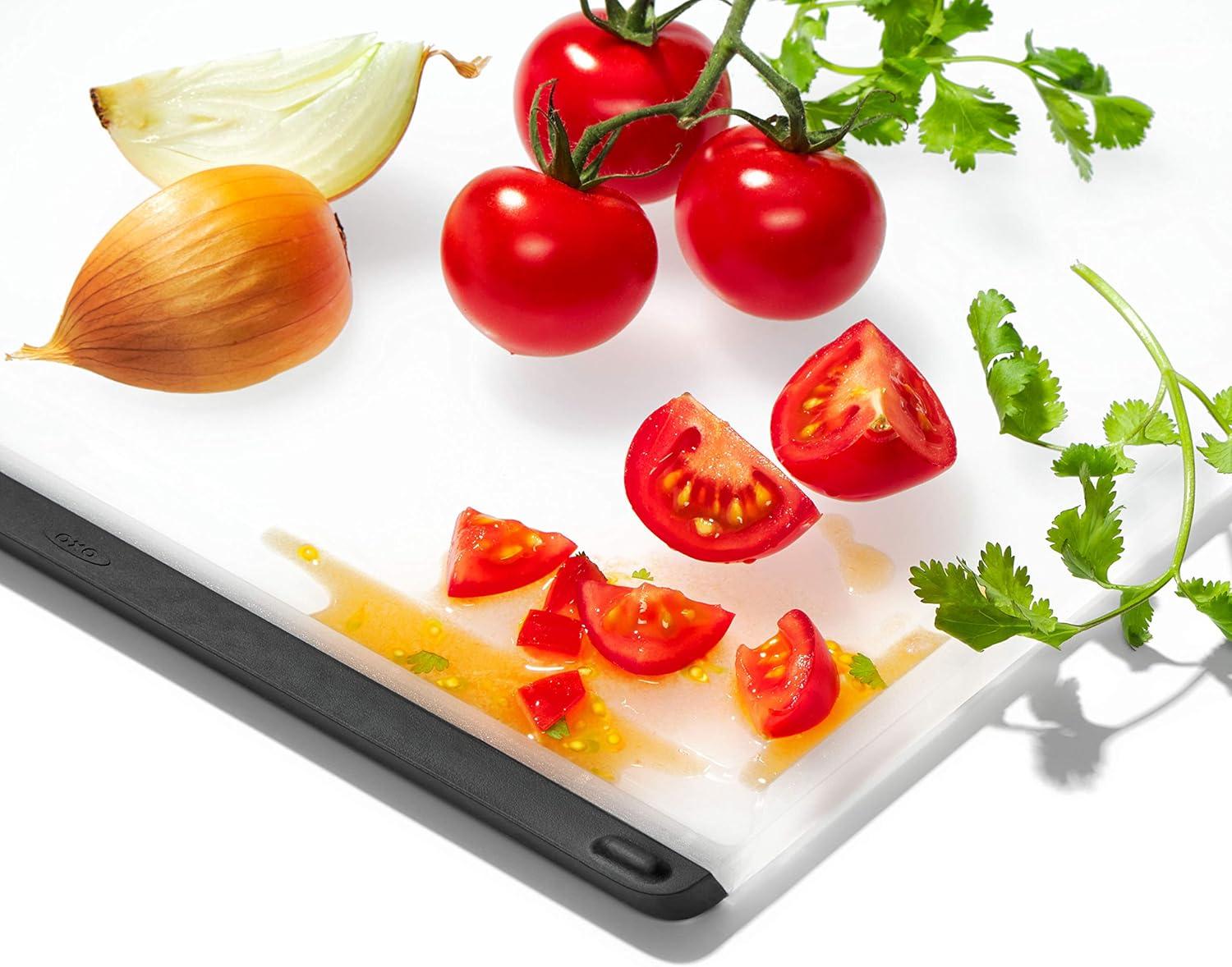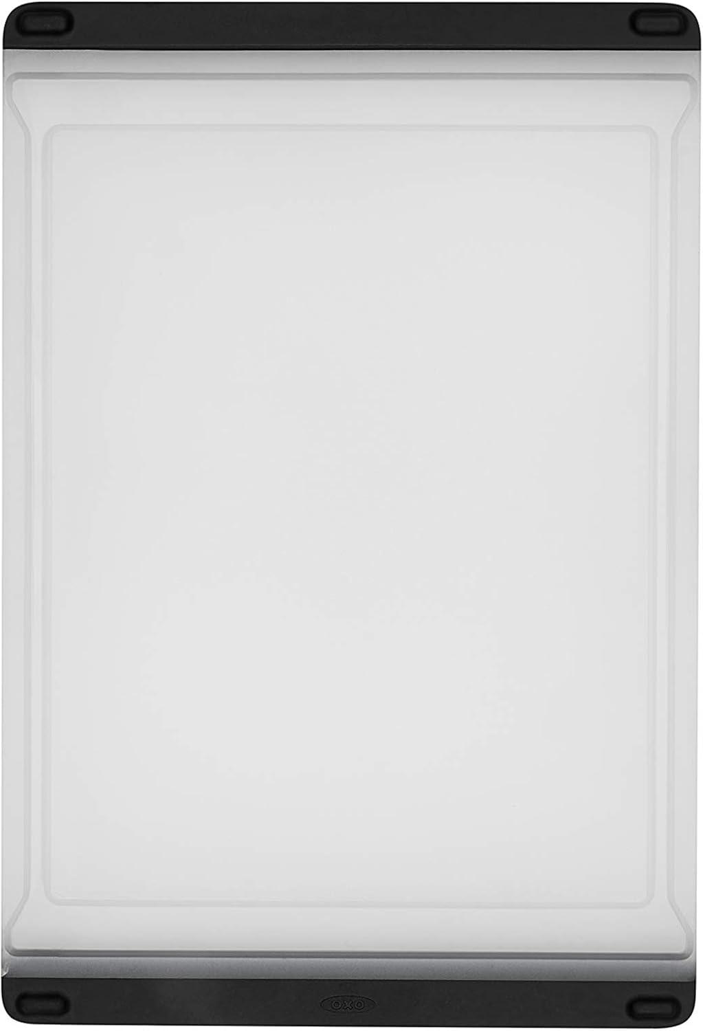 Streamline your slicing, dicing and chopping tasks with the OXO 2-Piece Cutting Board Set. Non-porous construction locks out liquids and odors for a fresh cutting surface every time, while clever, double-sided design keeps cross-contamination at bay. Use the grooved side for meats and the smooth side for produce to keep flavors from mingling as you work. Soft, tapered edges double as handles for comfortable lifting and carrying, and the cutting surface goes easy on your knives. Non-slip feet keep the cutting board in place for safety as you slice. The smaller Prep Board is perfect for trimming veggies or slicing cheese, while the Everyday Board is ideal for making meals. Both boards feature an integrated drip-catcher to keep even the juiciest foods contained. When you're done, pour away excess liquid easily from any corner. These durable boards are dishwasher safe for everyone who loves cooking more than cleaning up afterward.
