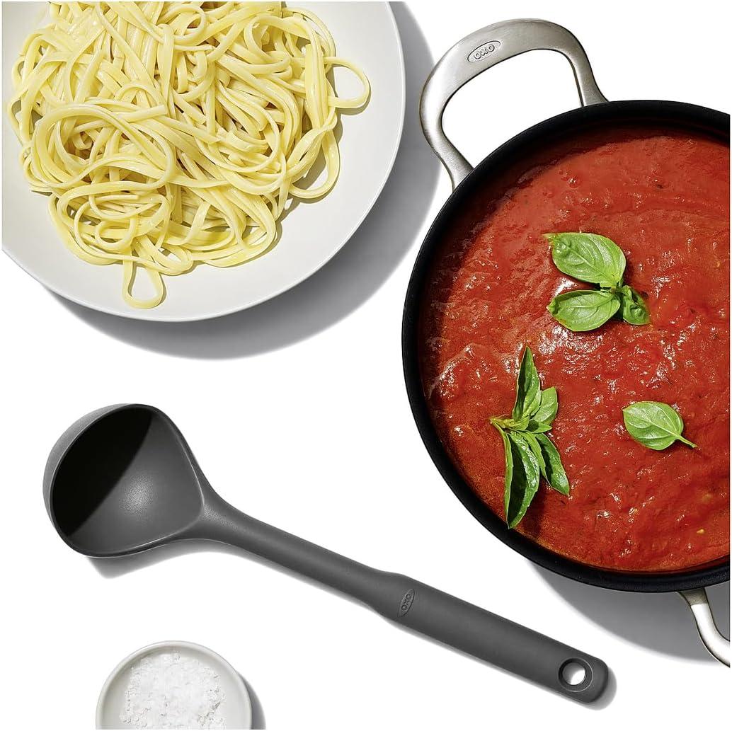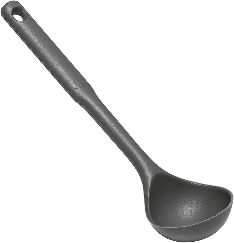 We studied hundreds of home cooks to create the OXO Good Grips 3-Piece Silicone Utensil Set. The durable, flexible heat-safe design is optimized to make everyday cooking tasks feel effortless. Chop, stir, flip, scoop and serve; unique polished edges glide around pans and bowls, meaning you’ll get every last bit. The Ladle conforms to corners for scooping and has a flat edge for spill-free serving. The Cooking Spoon is a chef’s best friend: use it to break apart ground meat, stir a sauce or sneak a taste. The Turner’s tapered design slides under food to flip with ease. Non-slip handles provide a comfortable grip while you cook. The one-piece silicone construction is easy to handwash and is dishwasher safe.