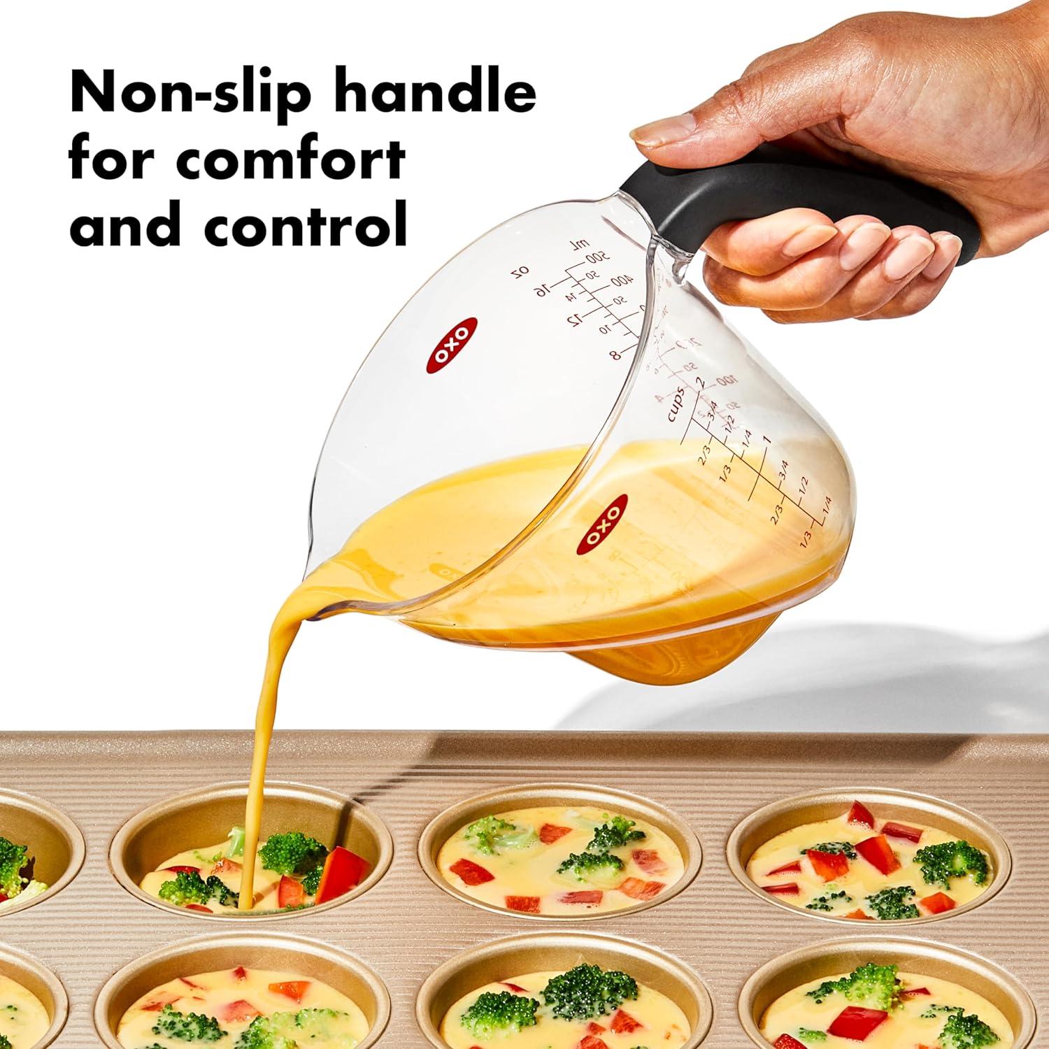 Say goodbye to bending to check your liquid measurements. The OXO Good Grips 4-Cup Angled Measuring Cup makes everything from crafting cocktails to whipping up vinaigrettes easier, thanks to our revolutionary design that allows you to read the measurement by simply looking down into the Cup. Our Cup is a favorite with Good Housekeeping magazine editors because the patented angled surface inside lets you easily read cup, ounce and milliliter markings from above. The lightweight, BPA-free Cup body is made of Tritan Renew plastic, which is made from certified recycled content through a mass balance allocation process that transforms plastics destined for landfills into high-performance, food-safe materials. It has a non-slip handle and a generous spout that let you pour with comfort and control. Also available in 1-Cup and 2-Cup versions. Top-rack dishwasher safe.