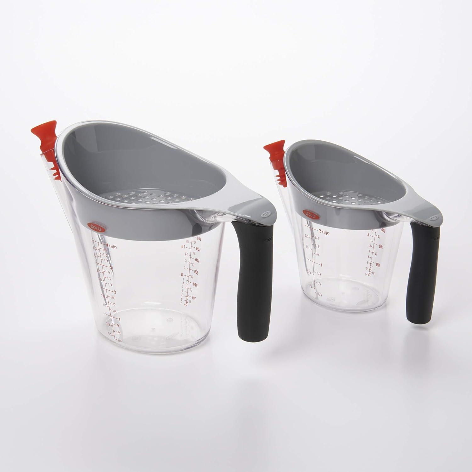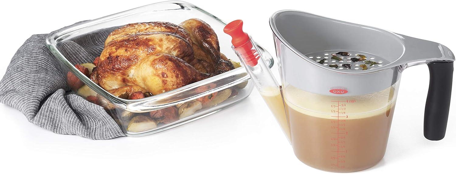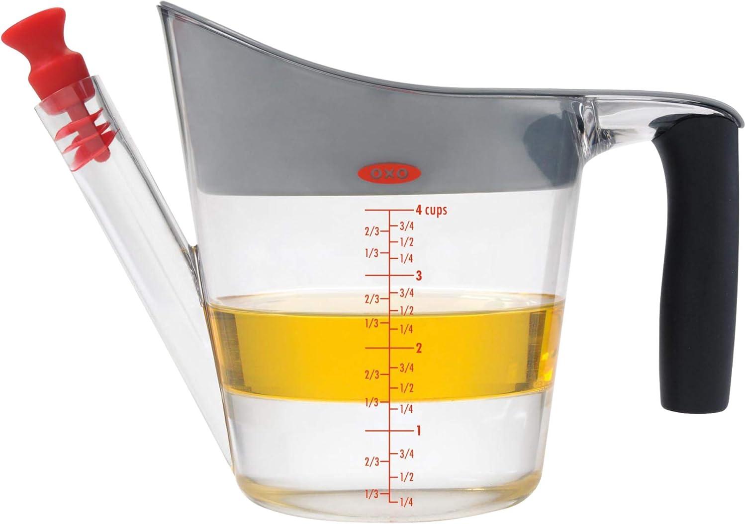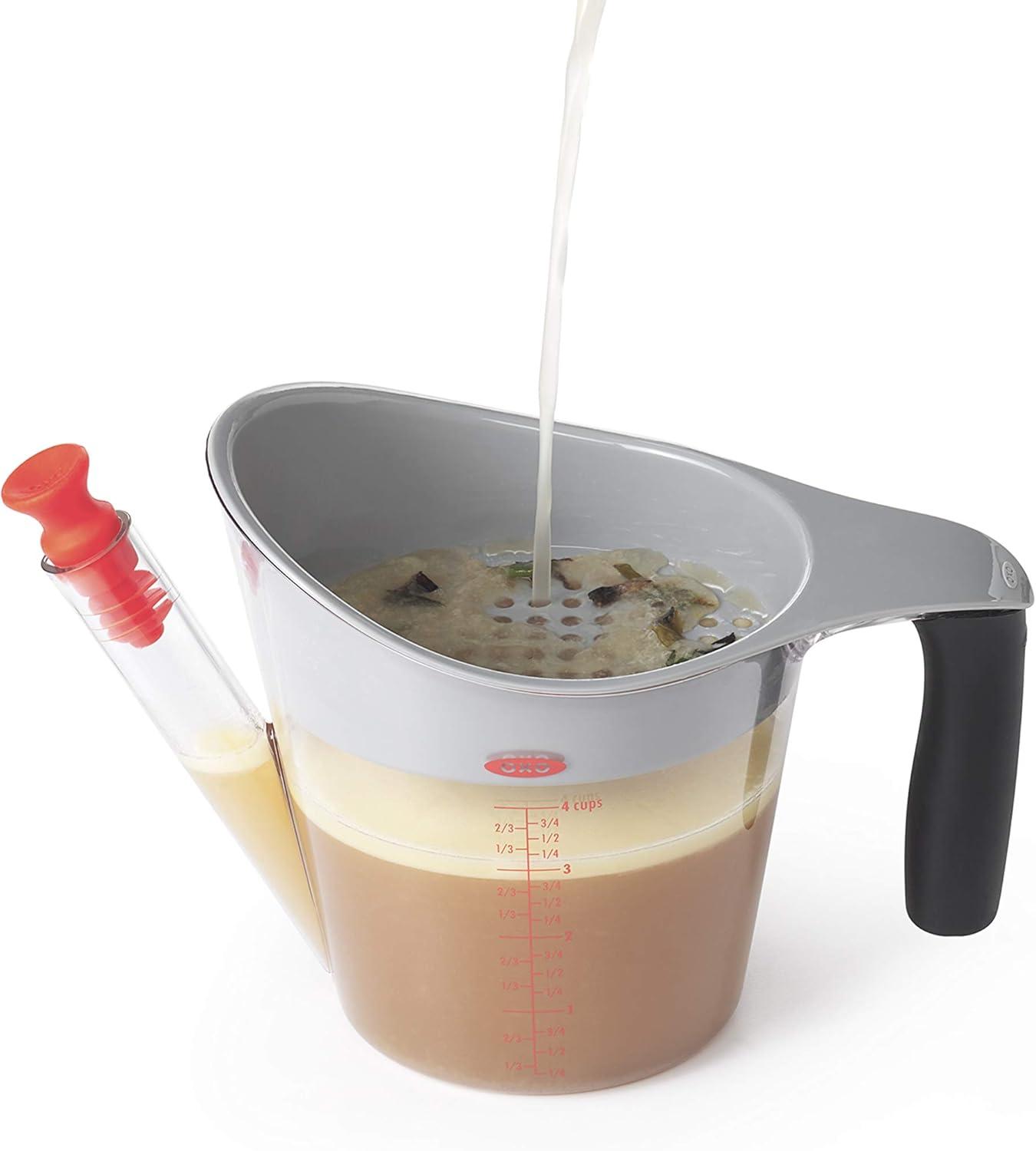 Cut the fat with the OXO Good Grips 4-Cup Fat Separator. Pour pan juices or stock through the included strainer attachment and watch the fat rise to the top. The BPA-free, heat-resistant strainer catches unwanted bits while the stopper keeps fat from entering the spout. Once the fat and lean juices have fully separated, remove the strainer and the stopper, and pour. The Separator features a comfortable non-slip handle and bold measurement markings for added convenience.