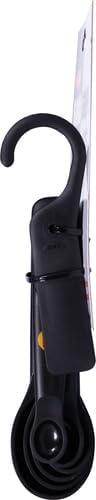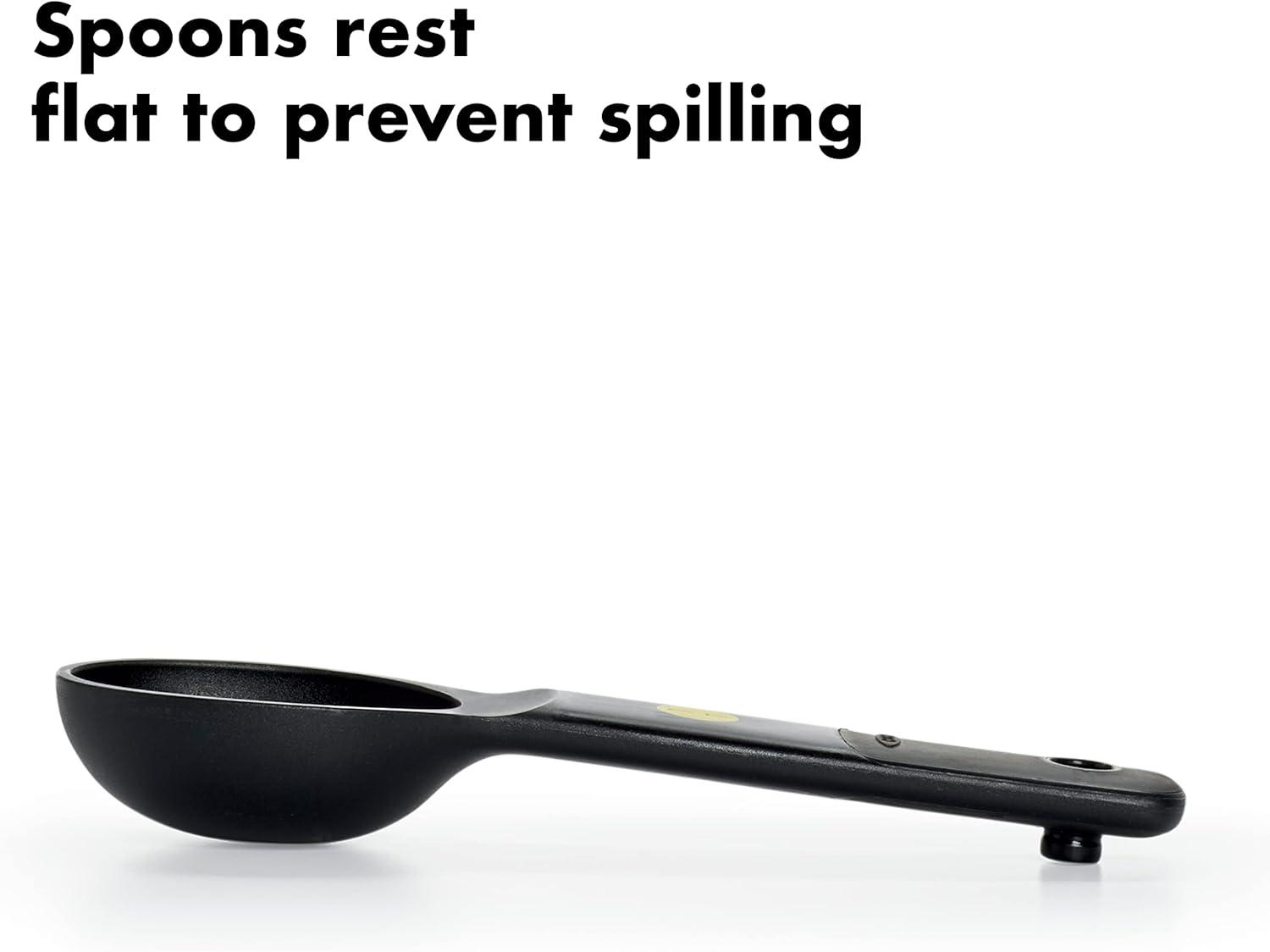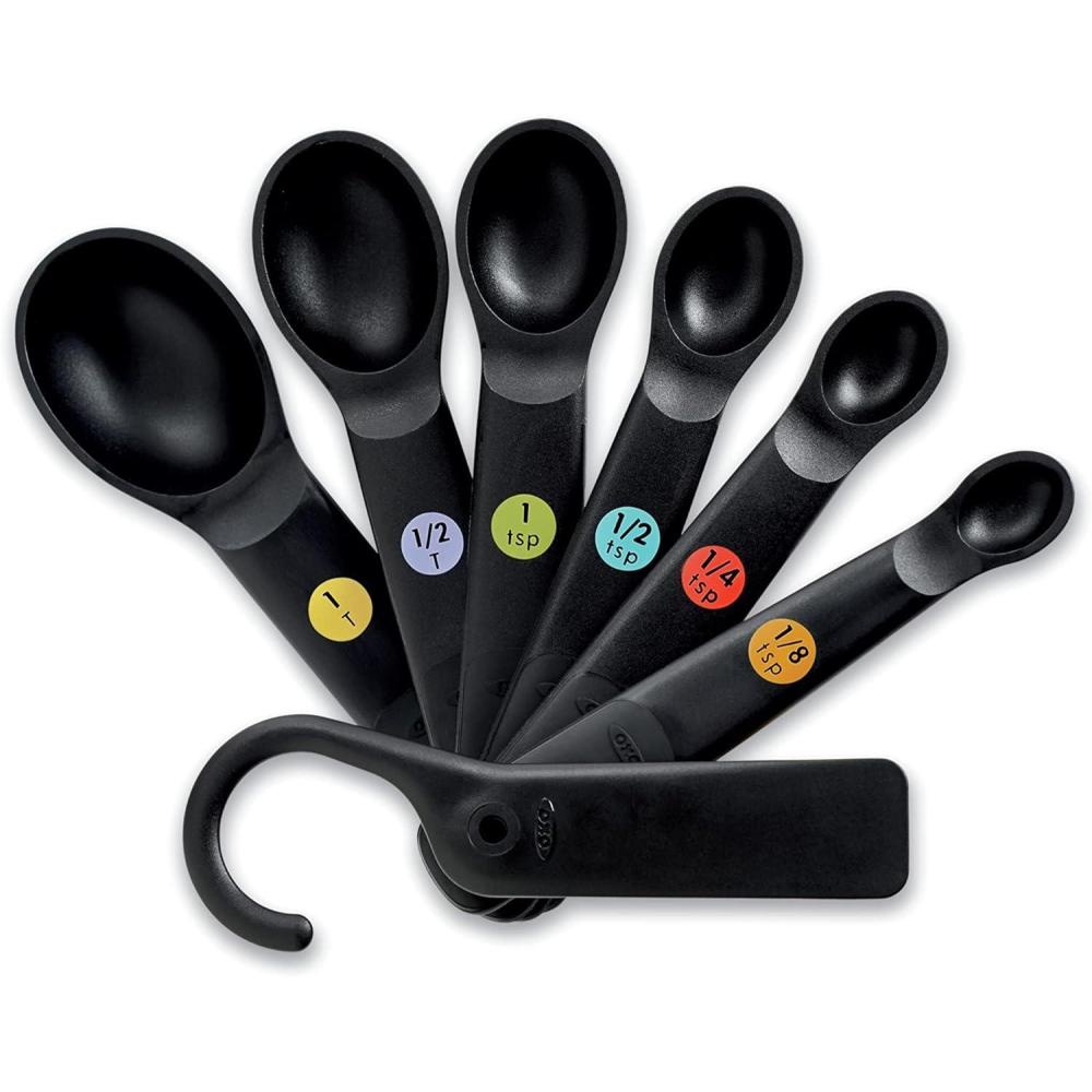 The OXO Good Grips 7 Piece Measuring Spoons Set makes finding the right Spoon a snap. The unique snapping feature that keeps the Spoons together for storage also allows you to fan the Spoons out, so you can find the size you need on the first try. This feature also allows you to take out just the Spoon or Spoons you need, leaving the rest neatly snapped together. The Spoon handles have soft, comfortable, non-slip grips and color-coded, easy-to-read measurement markings. The Spoons also rest flat on the counter to prevent tipping and spilling. The Set includes a scraper that can be used to level ingredients, which also has a hook on it for hanging storage when needed. This dishwasher safe set includes a scraper, 1/8 tsp, 1/4 tsp, 1/2 tsp, 1 tsp, 1/2 T, 1 T Measuring Spoons.