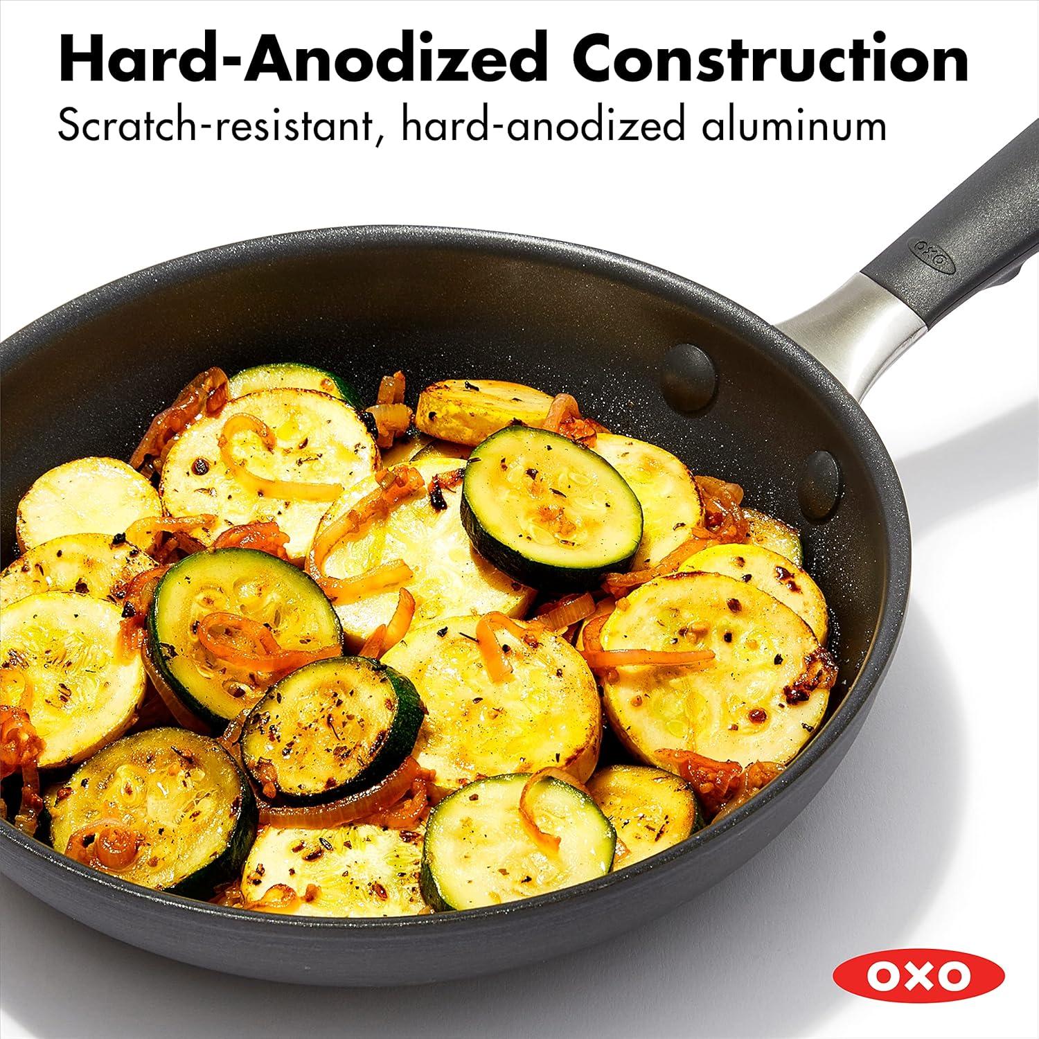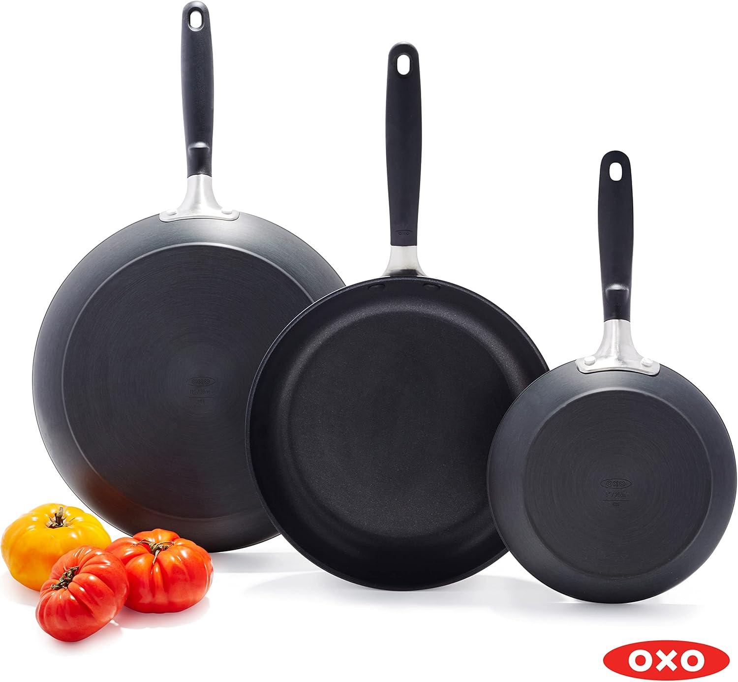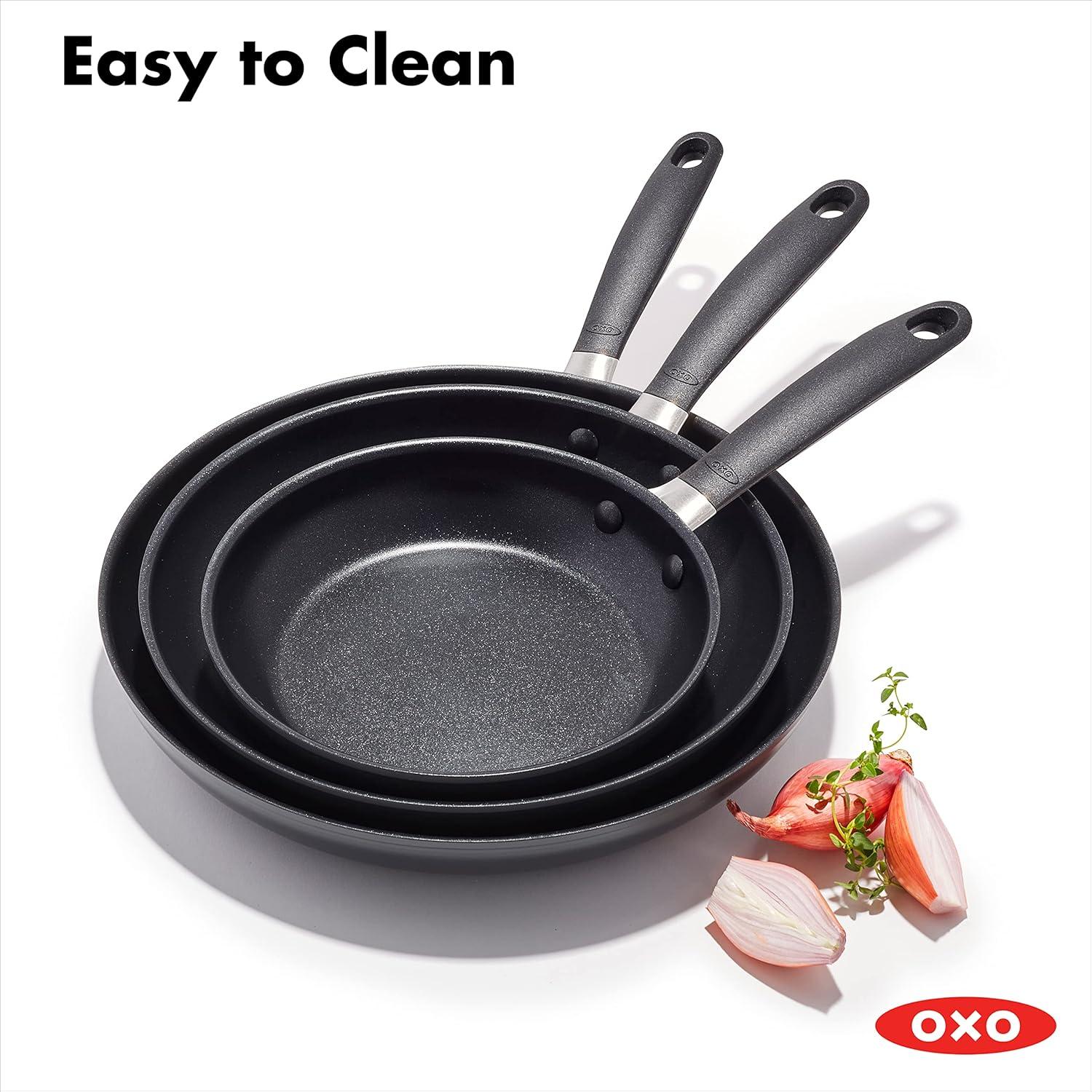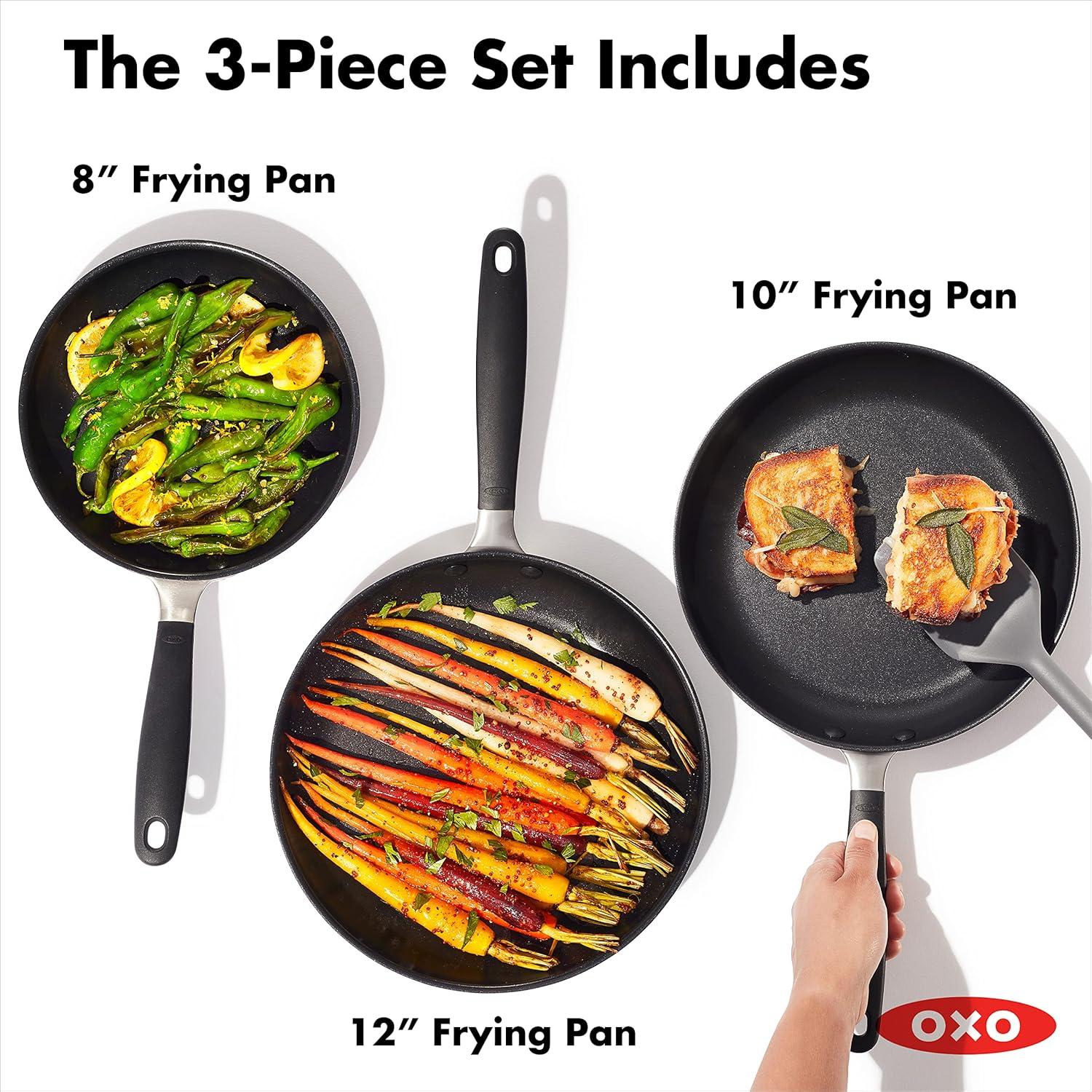 Build a better kitchen with the OXO Good Grips Non-Stick Frying Pan Set. The 8-in frying pan is your go-to for eggs and grilled cheese, the 10-in pan is ideal for sautéing veggies and cooking fish, and the 12-in makes family-sized meals easy. The pans feature a three-layer, German-engineered non-stick coating that provides effortless performance while using less oil and delivers quick and easy cleanup. The set’s scratch-resistant, hard-anodized bodies heat faster and more evenly than traditional aluminum, and the silicone-wrapped stainless steel handle helps keep cooking comfortable. Hand wash. Oven safe up to 390°F/200°C.