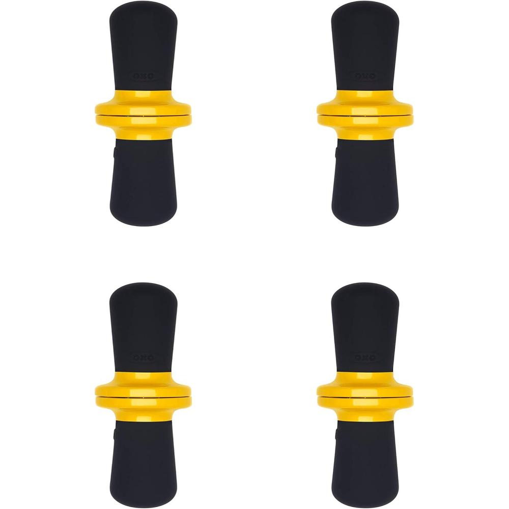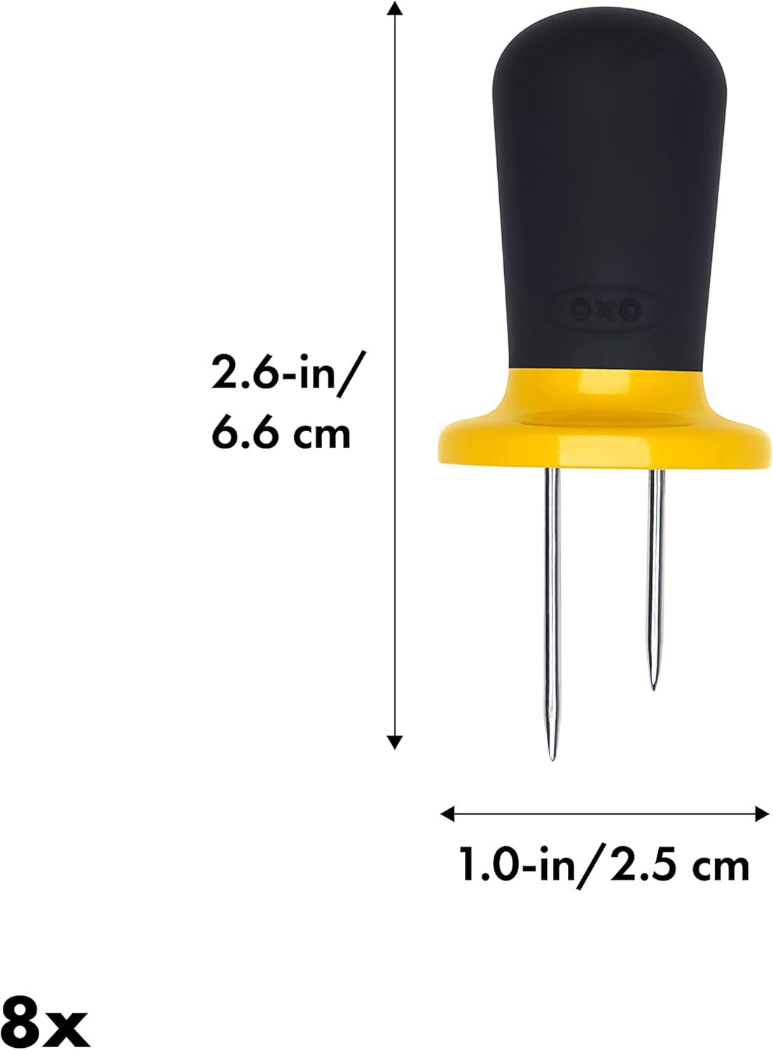 The OXO Good Grips 8-Piece Corn Holder Set lets you handle hot, buttery corn with ease. Strong, stainless steel pins remain firmly in hot cobs, and the flared barrier keeps you from having butter fingers. Non-slip handles provide control when serving, eating or rolling in toppings. Each set interlocks for safe and compact storage. Dishwasher safe.