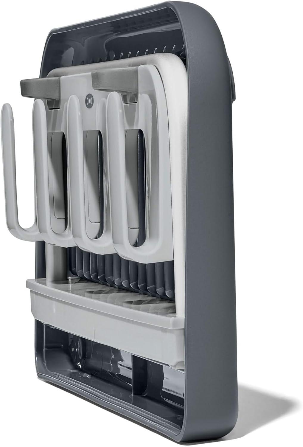 Keep your reusable water bottles and travel mugs clean and dry with the OXO Good Grips Water Bottle Drying Rack. The Rack’s innovative design holds four water bottles and four lids, and the unique straw holders keep up to four reusable straws elevated for sanitary and efficient drying. The Rack’s raised edges keep lids and caps from rolling off so you can find your bottles and accessories when they’re ready for use. The Rack comes apart and neatly snaps into the base for easy, compact storage when not in use.