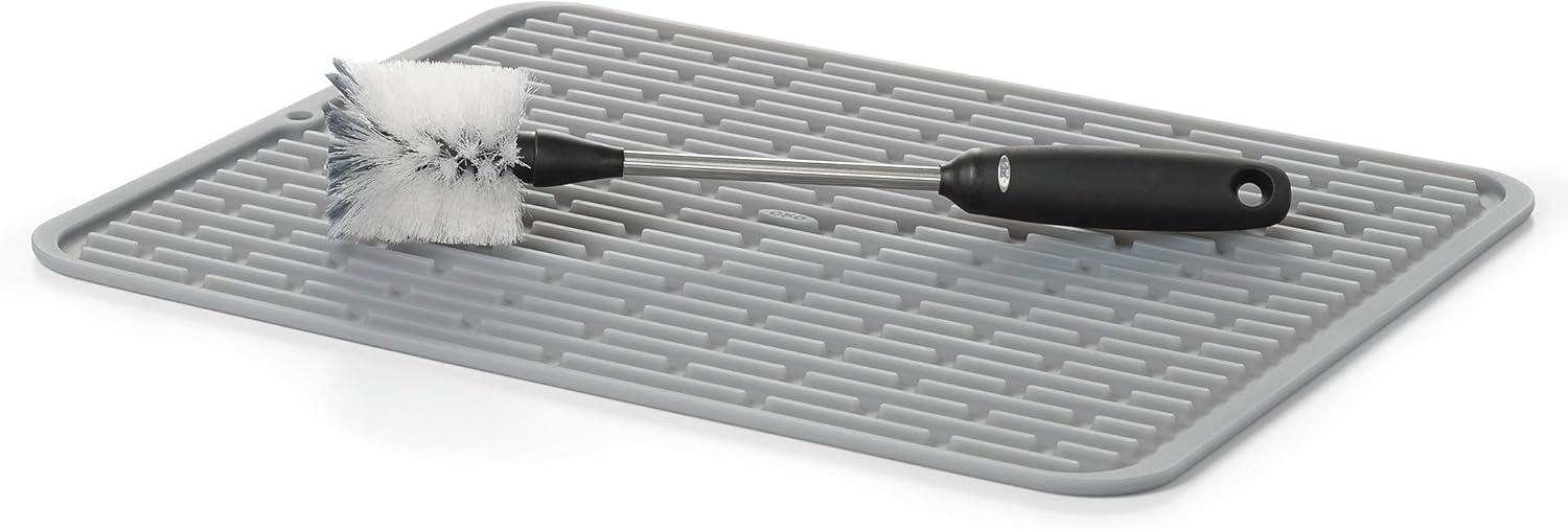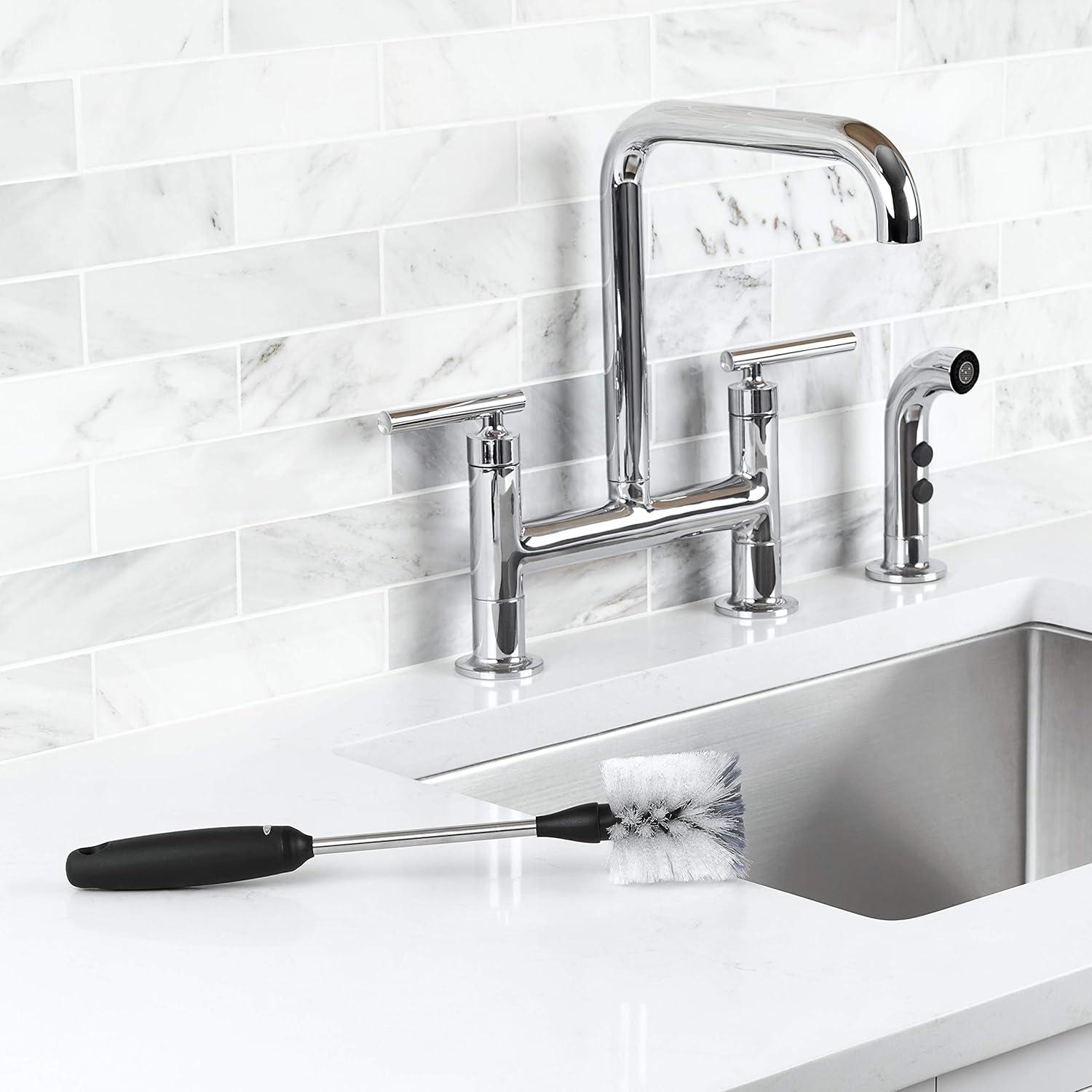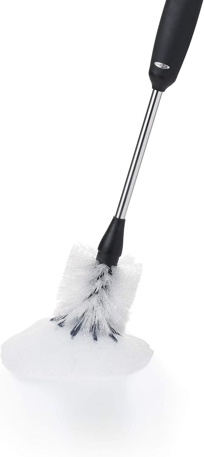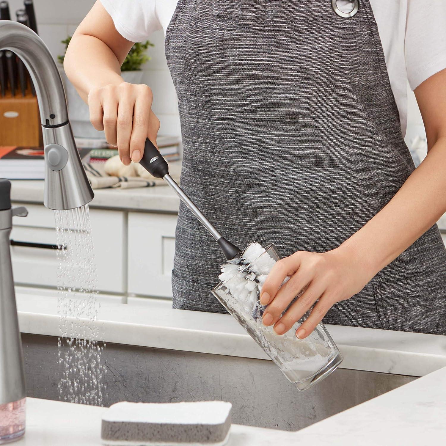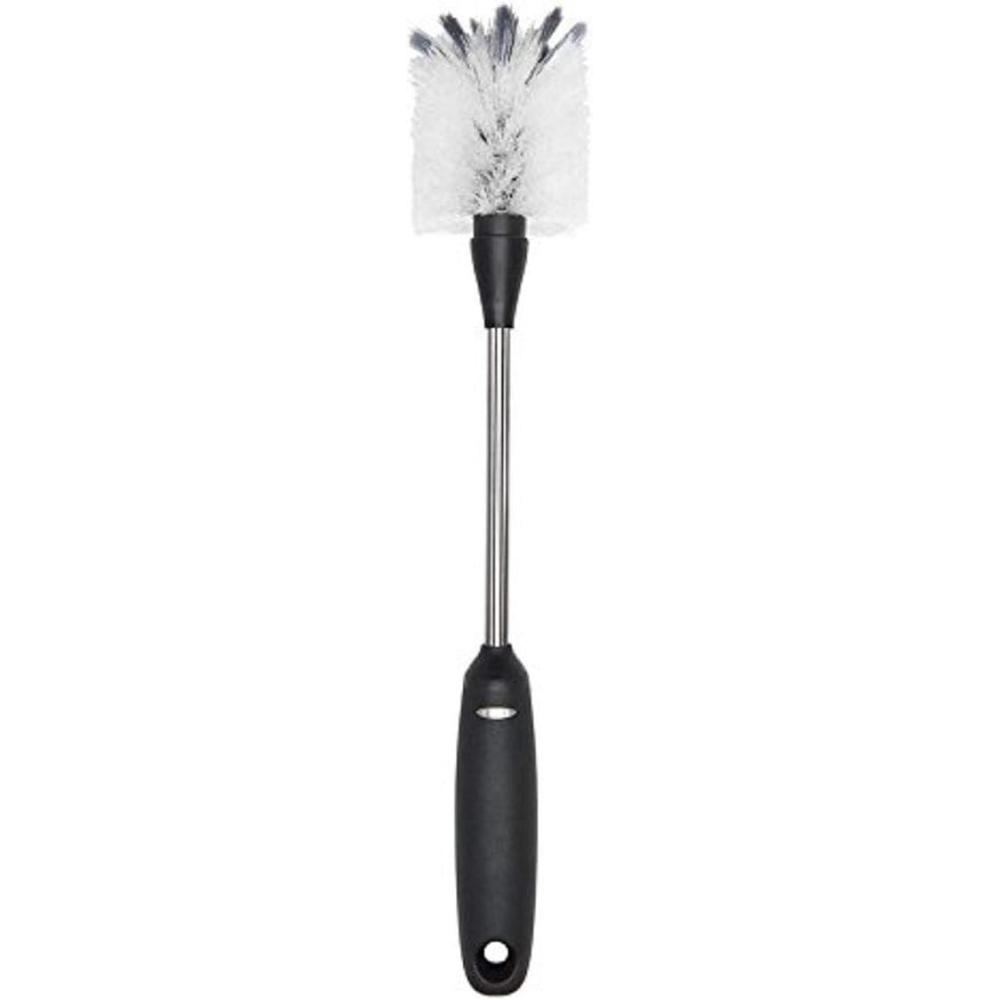 With a dual-function bristle head designed for gentle cleaning and serious scrubbing, and a long neck flexes with ease, reaching those tough-to-get areas inside bottles, pitchers and carafes. The OXO Good Grips Bottle Brush is more than your average kitchen scrubber. The handle provides a soft non-slip grip, even when wet. Dishwasher safe, store it in your sink caddy or hang it from a hook. Safe for pots and pans, stemware, baby bottles and other delicate containers.