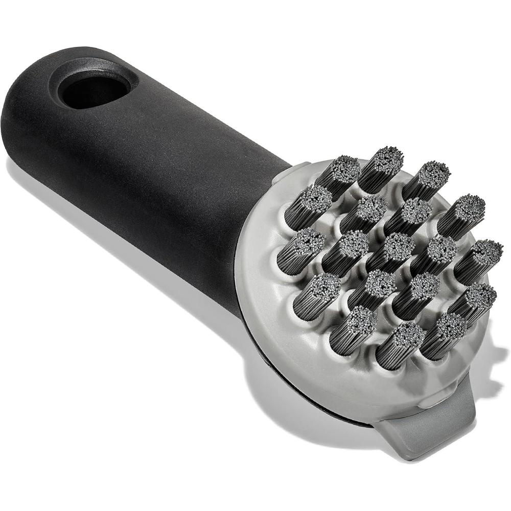 Our OXO Outdoor Cast Iron Brush is tough enough to tackle cast iron and carbon steel cookware, yet gentle enough for cleaning all your non-stick pots and pan. No need for soap or detergent so you can feel confident the seasoned surface of your cast iron and carbon steel will be protected. This specialty brush has a thoughtful bristle pattern designed to clean flat and ridged cookware, while the angled bristle design adds leverage so you can clean tough-to-reach grooves. A tough scraper helps get rid of those stubborn, greasy messes, while a compact, non-slip handle provides a comfortable grip. Dishwasher safe. Not suited for use with hot grills.