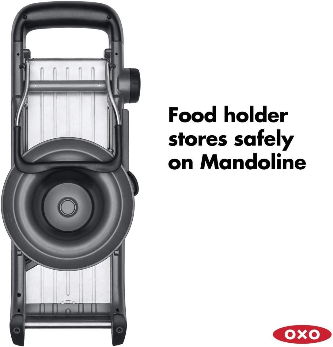 Spring-loaded food holder features a wide rim to protect fingers and stores on underside of mandolin