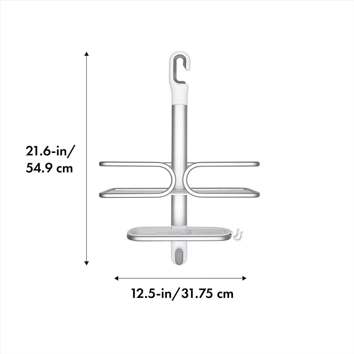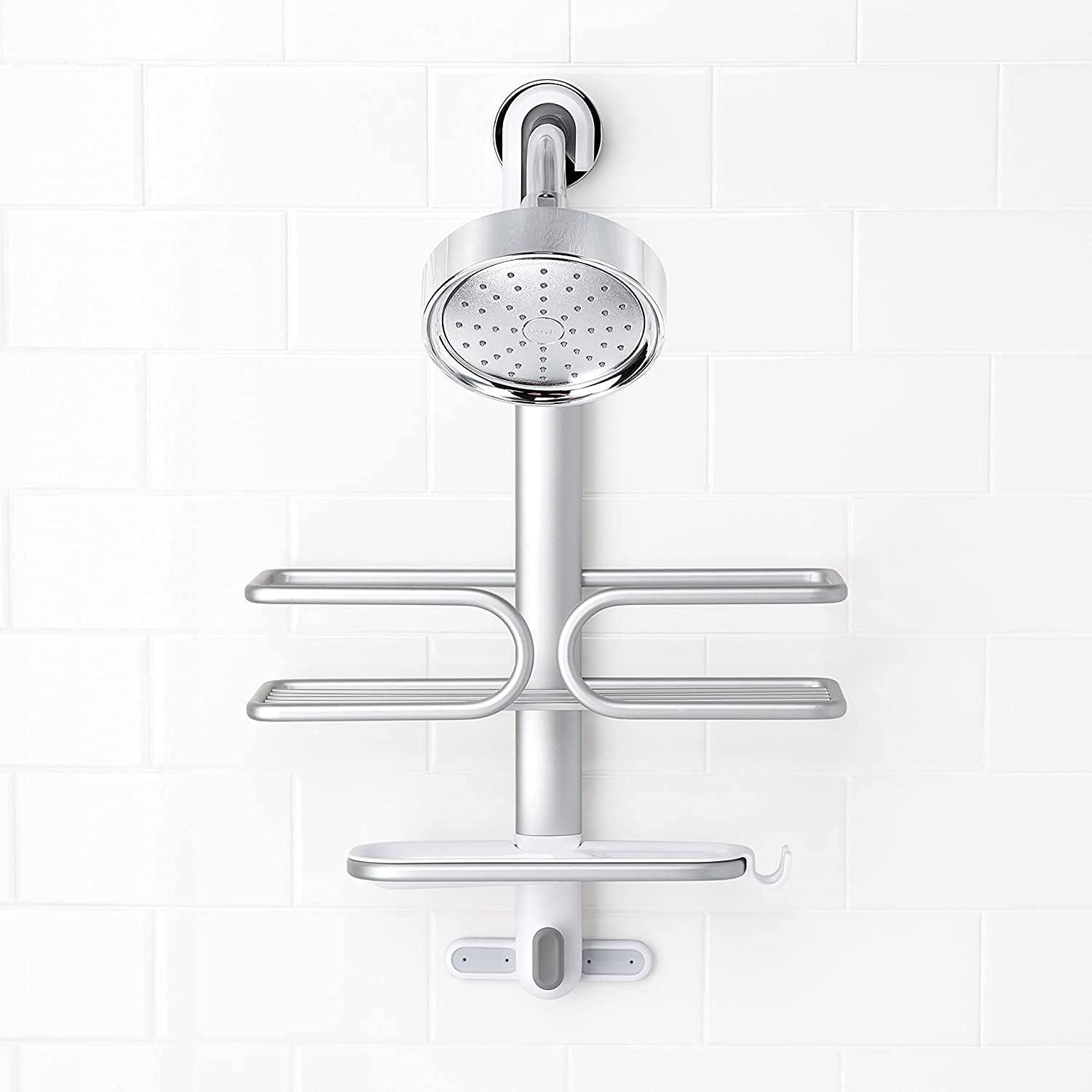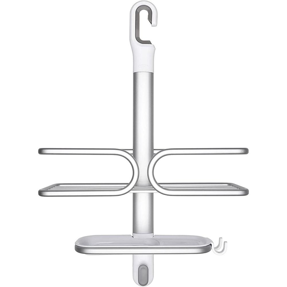 Maximize shower storage in tight spaces with the rustproof (really!) OXO Good Grips Aluminum Compact Shower Caddy. The anodized aluminum frame and shelf provide structure and keep even deluxe-sized shower essentials contained without bending. Tool-free installation is simple, just place the non-slip hook over your shower head pipe and pull down, then use the suction cups to secure the Caddy to the wall for extra stability. With thoughtful details like a large soap dish with removable tray, built-in razor holder and hook to hold loofahs, mesh scrubbies and more, this Shower Caddy will keep you – and your shower – squeaky clean and super neat.