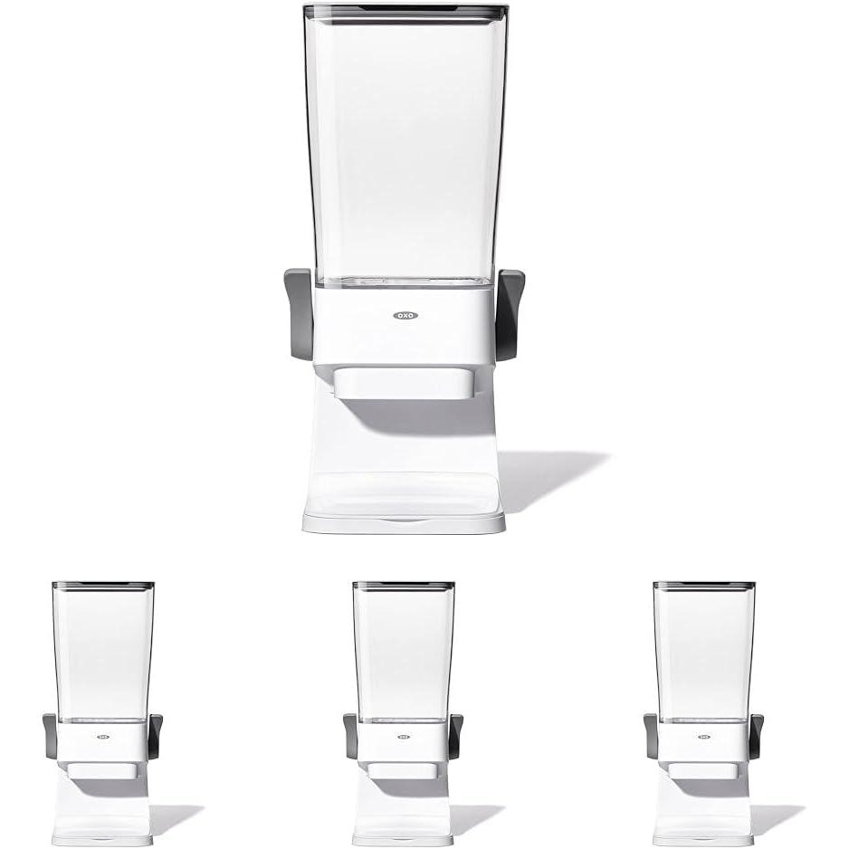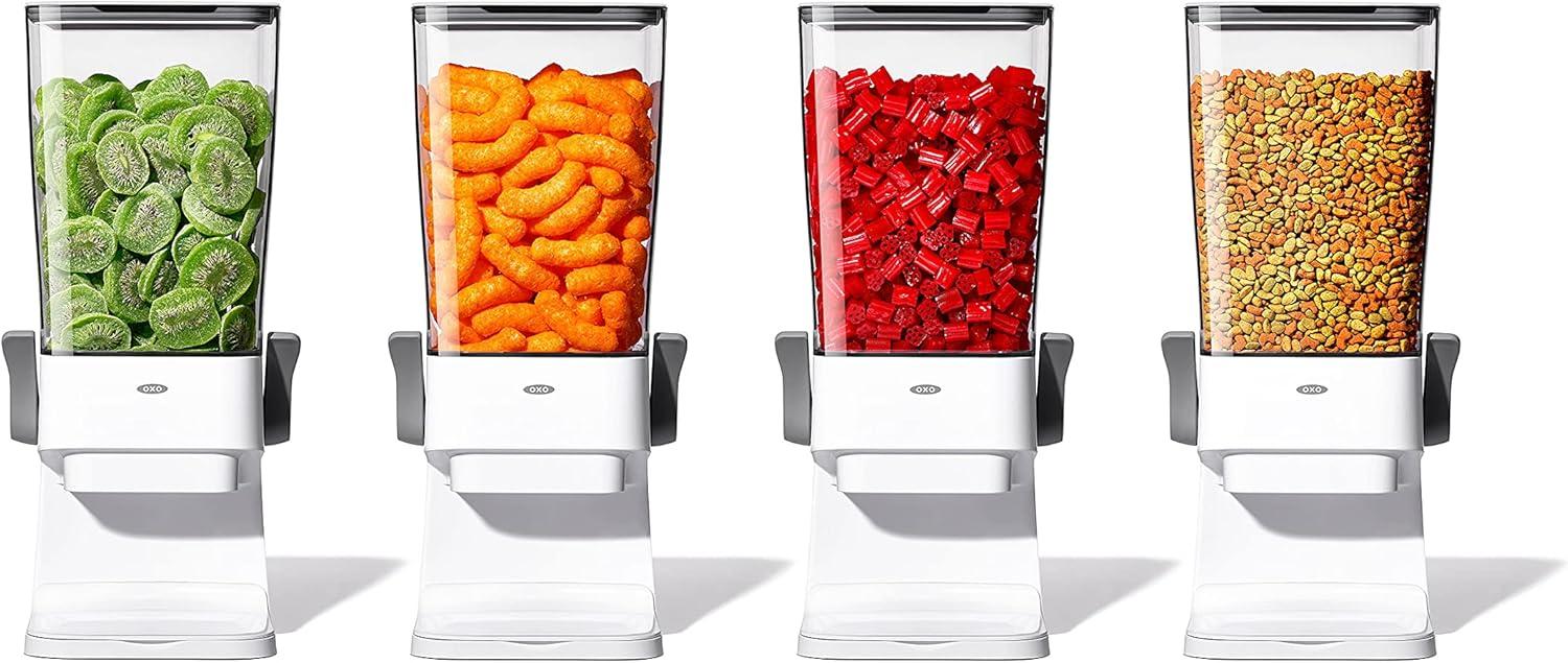 Conveniently store and dispense your favorite cereal with the OXO Good Grips Countertop Cereal Dispenser. The chute-design opening won't crush cereal as it is dispensed and the spring-loaded, non-slip levers allow for controlled, one-handed dispensing. The levers are on either side of the Dispenser to accommodate right- and left-handed users. Two silicone seals on Canister lid and inside Dispenser help keep cereal fresh and the removable tray keeps countertops clean. The BPA-free, large-capacity container locks into place and can be removed for easy cleaning. The Countertop Cereal Dispenser holds up to 5.5 quarts of cereal, granola, oatmeal or your favorite snack and is sized to fit neatly on countertops.
