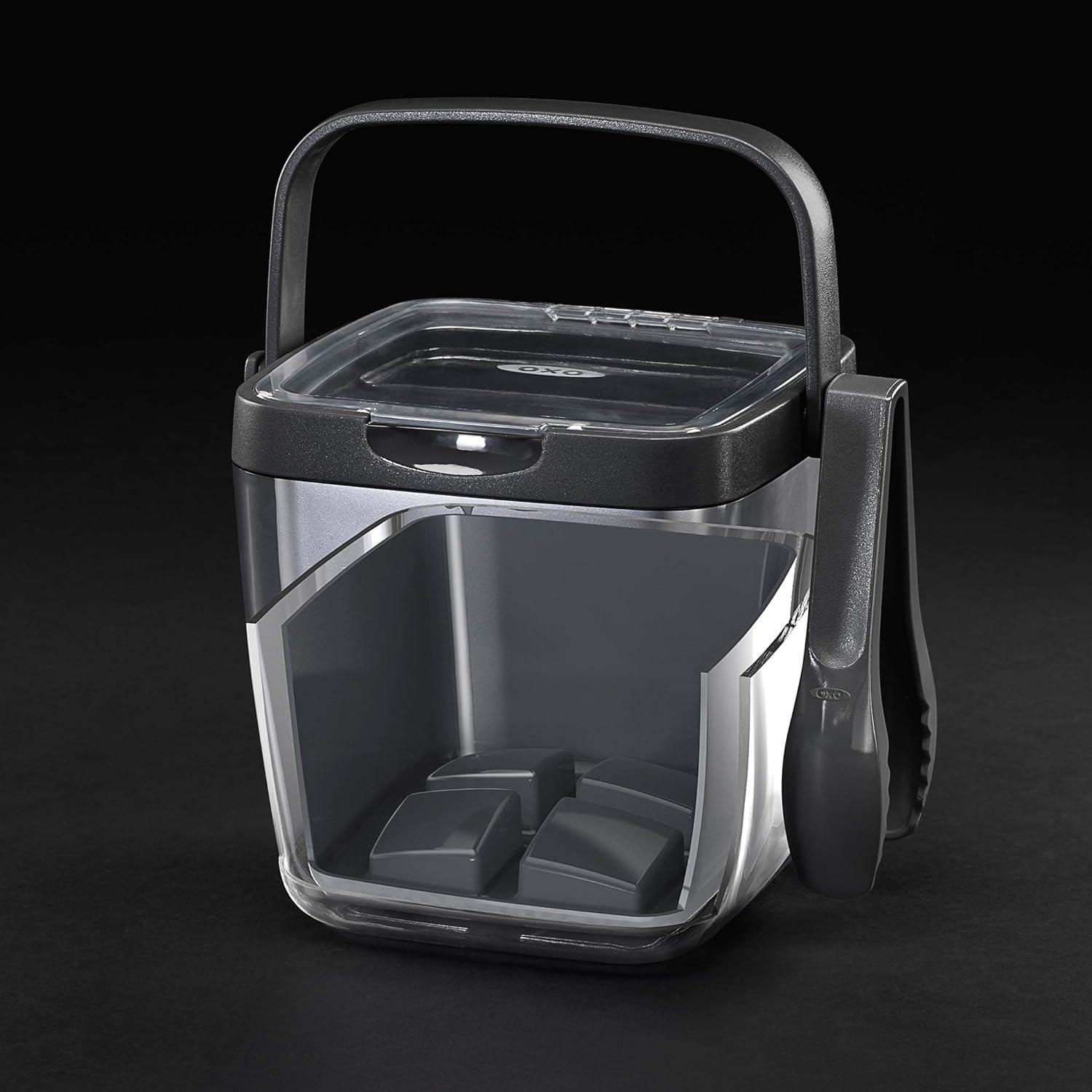 Be prepared for any party, inside or out, with this insulated Ice Bucket. Includes nylon tongs that hang conveniently from either side and a removable tray that holds drink garnishes. The carrying handle stays out of the way when not in use and the meltwater reservoir keeps meltwater away from cubes.