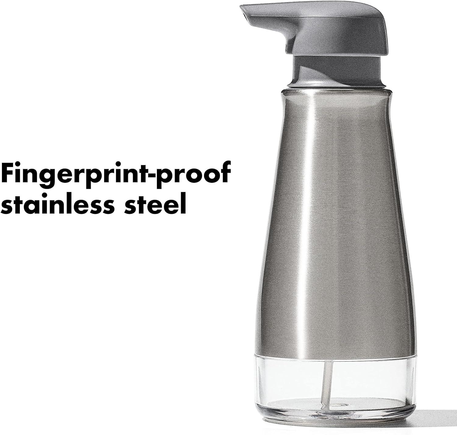 The OXO Good Grips Stainless Steel Foaming Soap Dispenser is designed to save on soap and time. Its generous, soft pump and non-slip base ensure stability for reliable, one-handed dispensing. The spout is optimally angled for pumping soap onto a sponge or into your hands or sink. The wide mouth and MAX fill line make it easy to fill—and the clear window shows you when it’s time to replenish. The fingerprint-proof brushed stainless steel construction keeps the Dispenser looking sleek. Dispenser is easy to fill with soap sold for foaming dispensers. Or, mix one part liquid soap and five parts water; mix vigorously for 30 seconds.