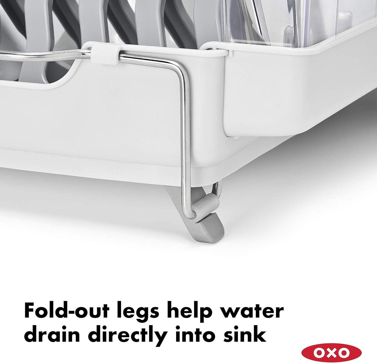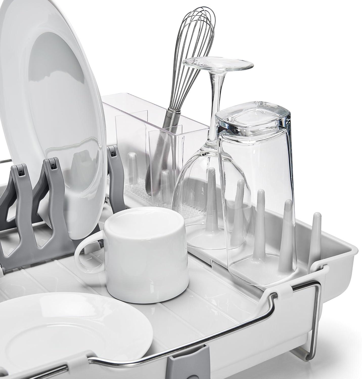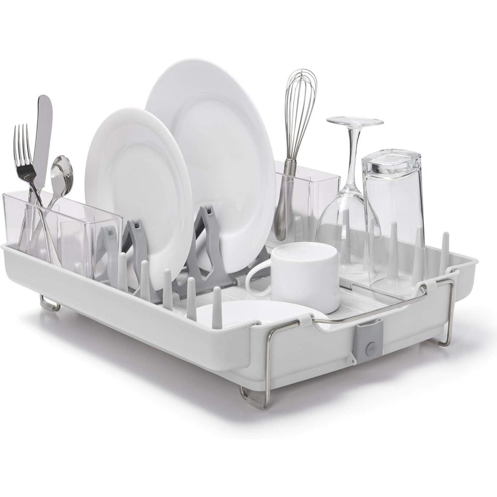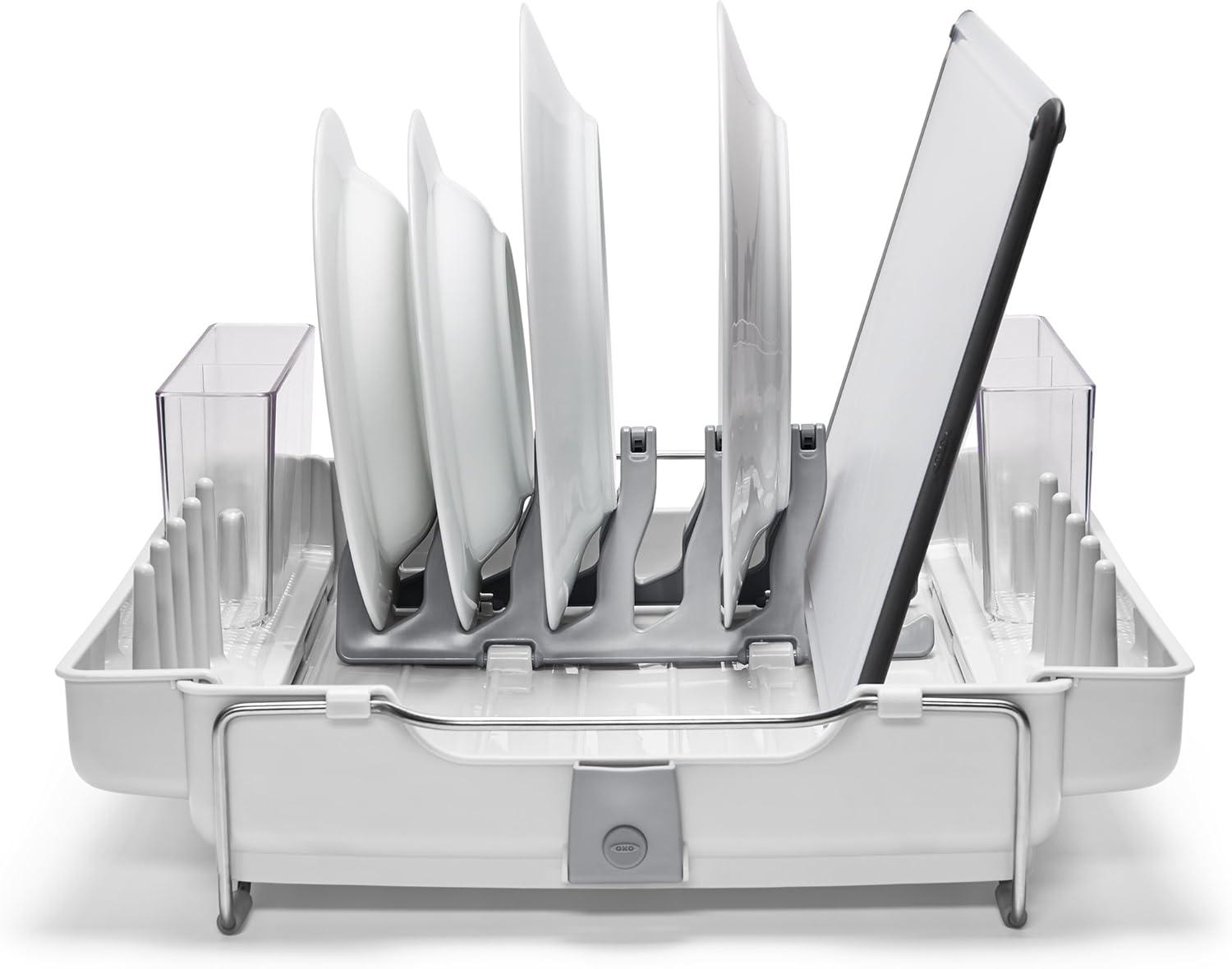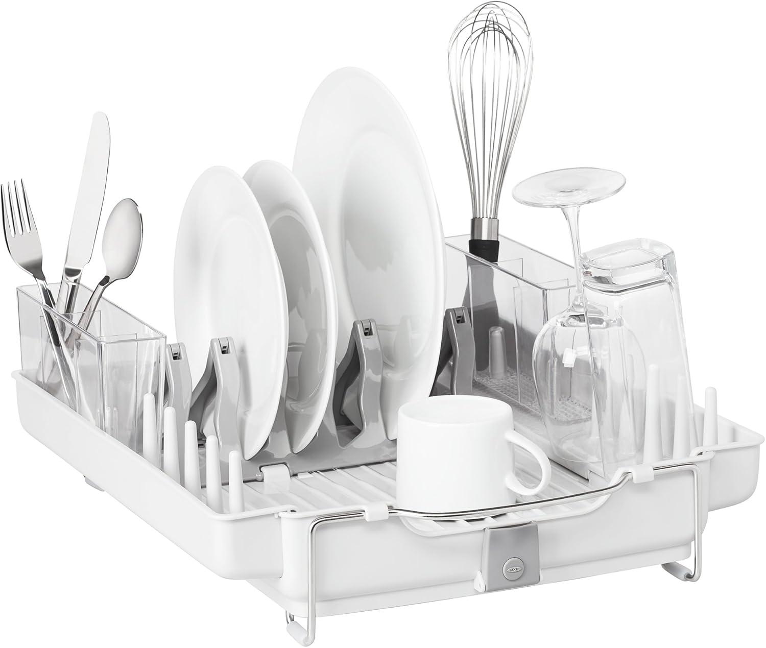 The OXO good grips foldaway dish rack is convertible, convenient and compact. It features a plate rack that holds plates or bowls neat and upright, and is safe for fine china and delicate dishware. When the plate rack is folded down, it leaves the middle of the dish rack open to accommodate large bowls, cookware, and more. The convenient cup racks hold cups, mugs or wine glasses inside rack to prevent dripping on the counter. Divided utensil holders have a generous capacity and are removable for easy unloading. To drain directly into the sink, simply fold out the feet and snap open the pour spout. The side walls, feet and spout of the foldaway dish rack all fold for compact storage.