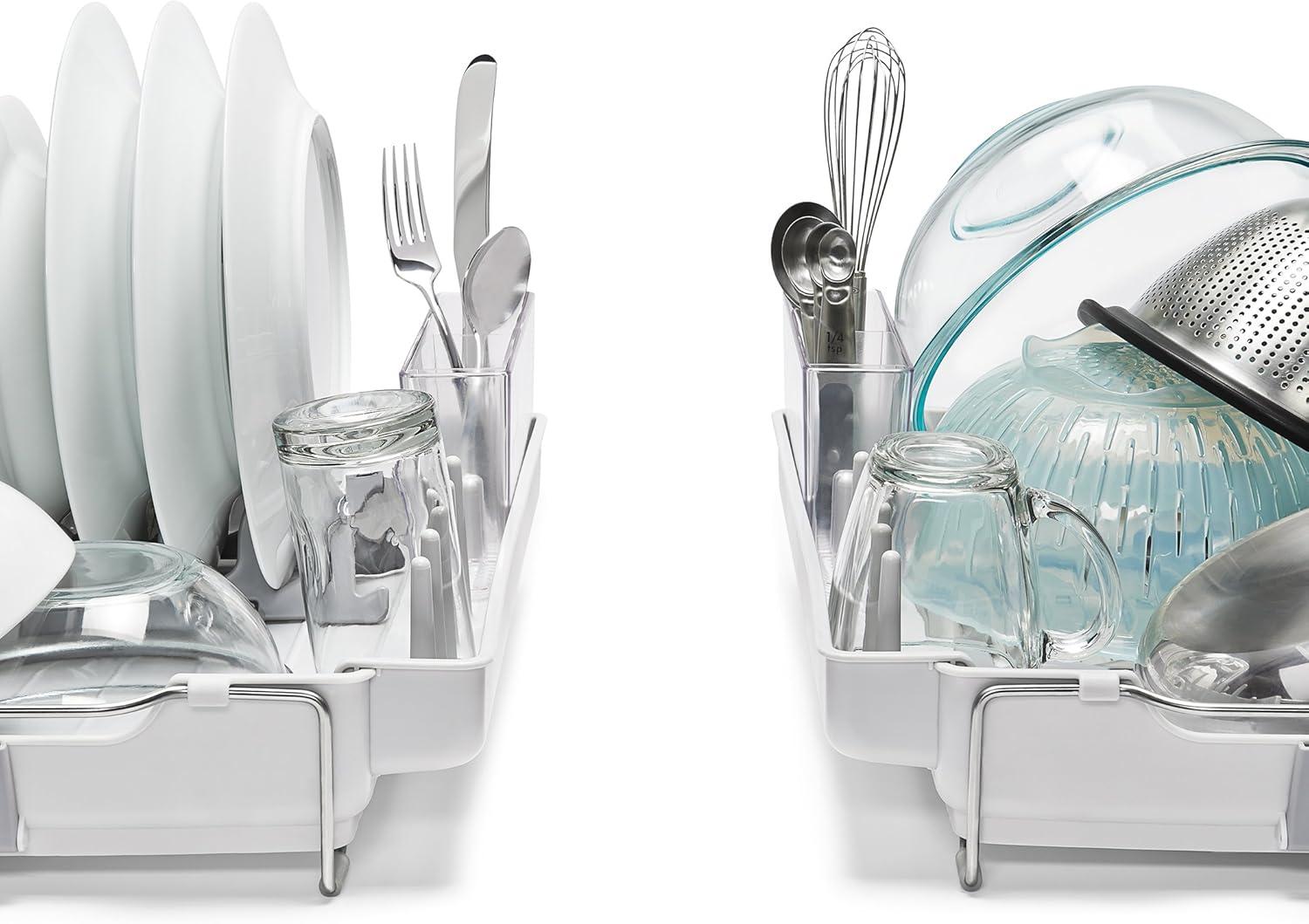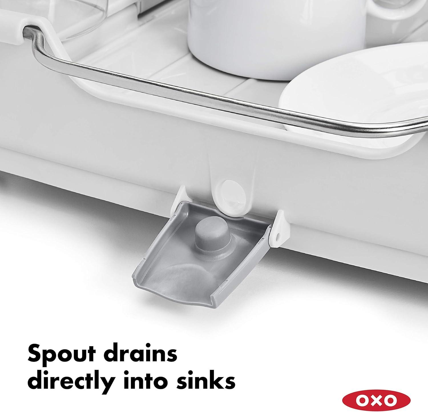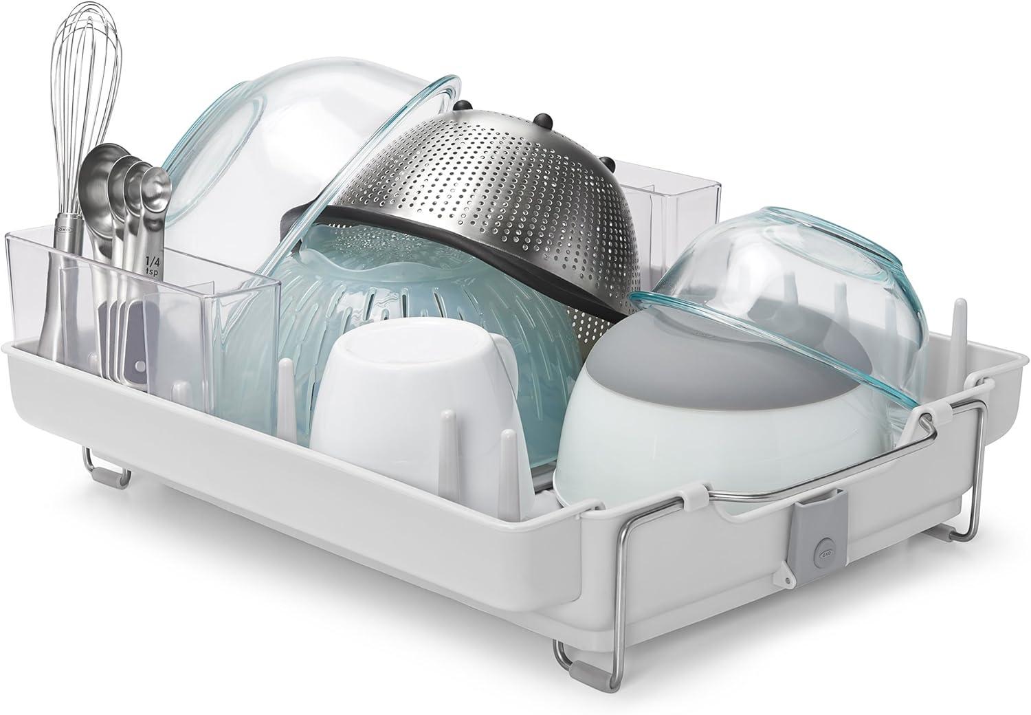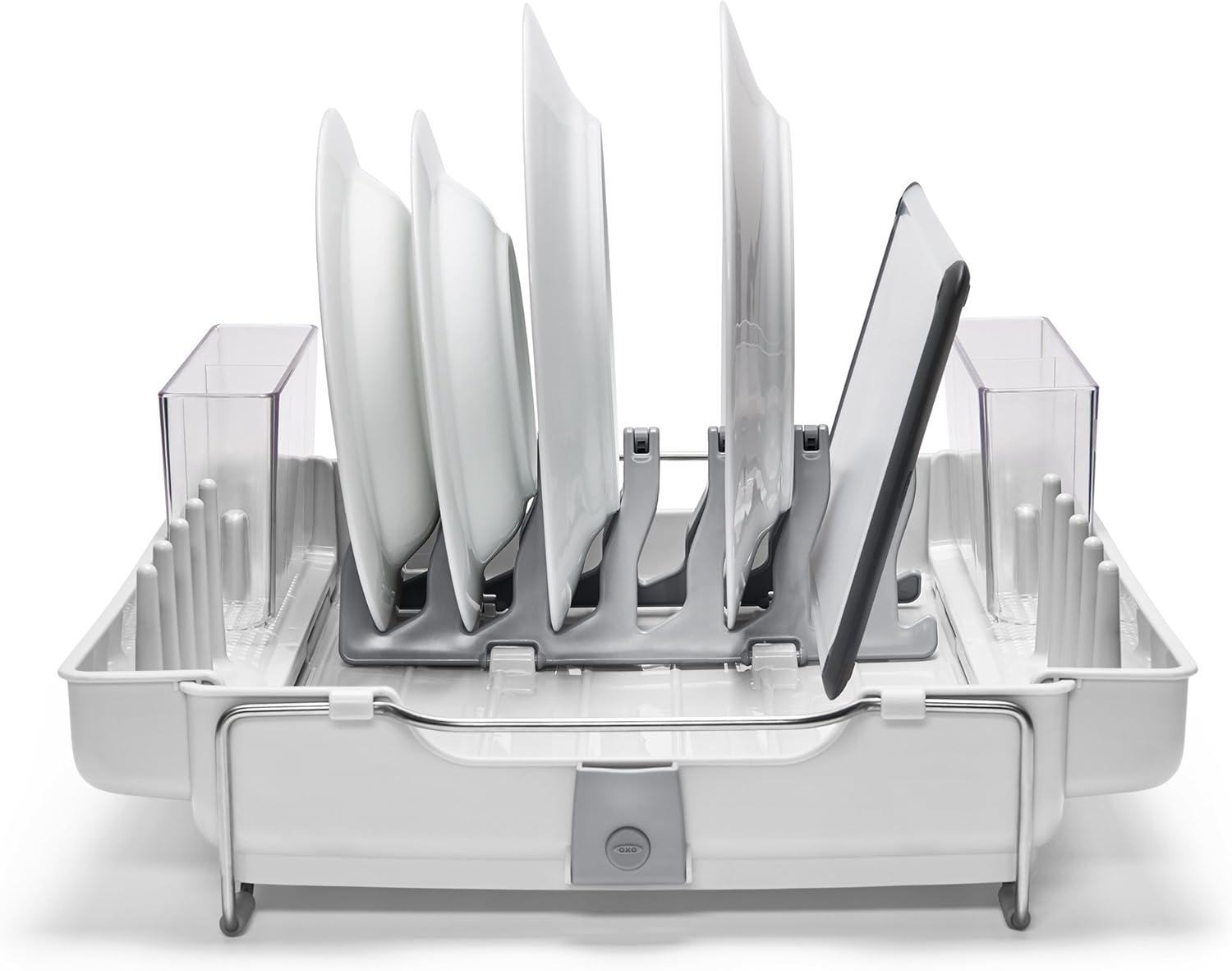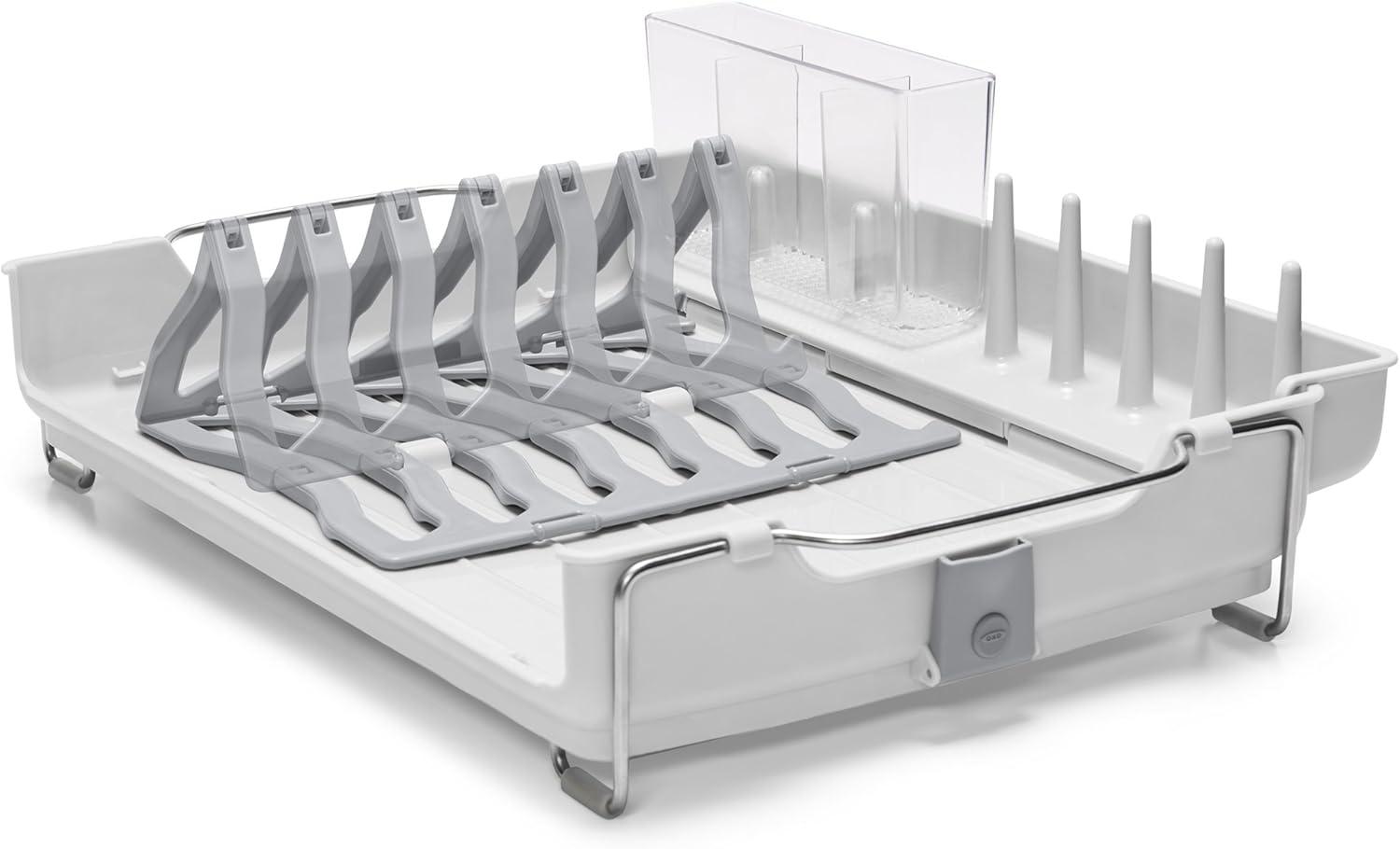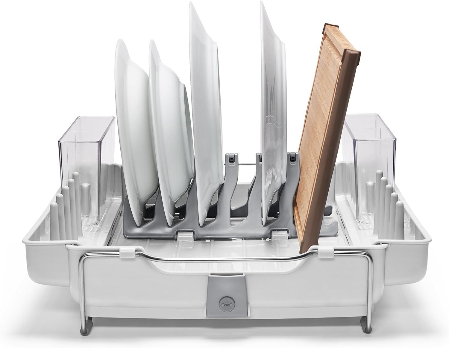 The OXO good grips foldaway dish rack is convertible, convenient and compact. It features a plate rack that holds plates or bowls neat and upright, and is safe for fine china and delicate dishware. When the plate rack is folded down, it leaves the middle of the dish rack open to accommodate large bowls, cookware, and more. The convenient cup racks hold cups, mugs or wine glasses inside rack to prevent dripping on the counter. Divided utensil holders have a generous capacity and are removable for easy unloading. To drain directly into the sink, simply fold out the feet and snap open the pour spout. The side walls, feet and spout of the foldaway dish rack all fold for compact storage.