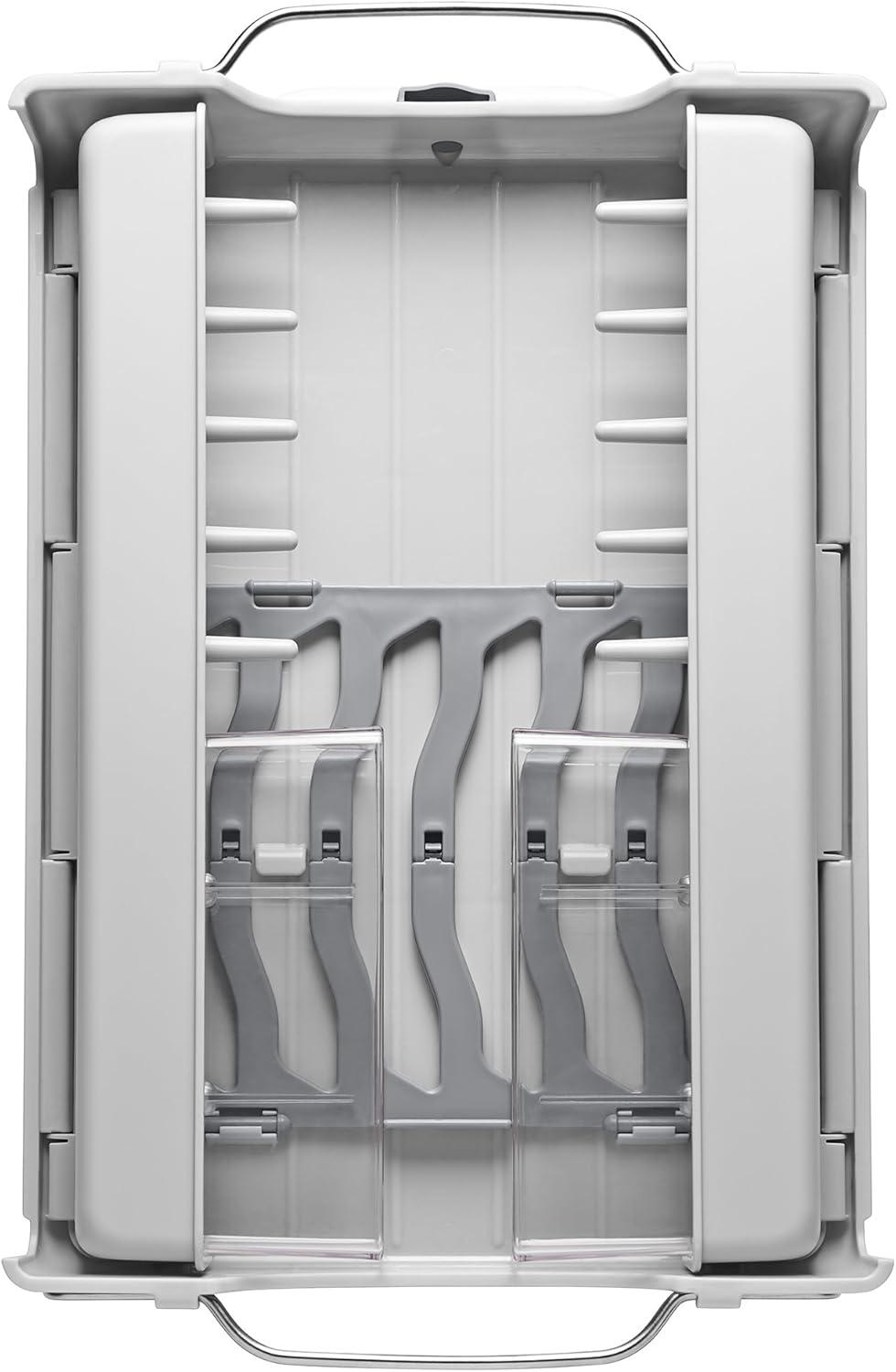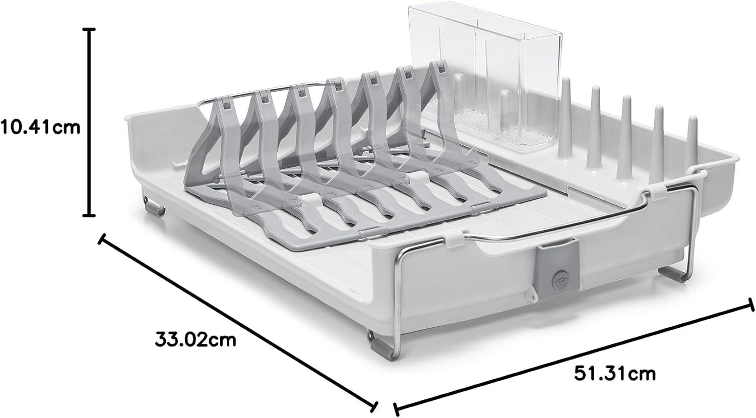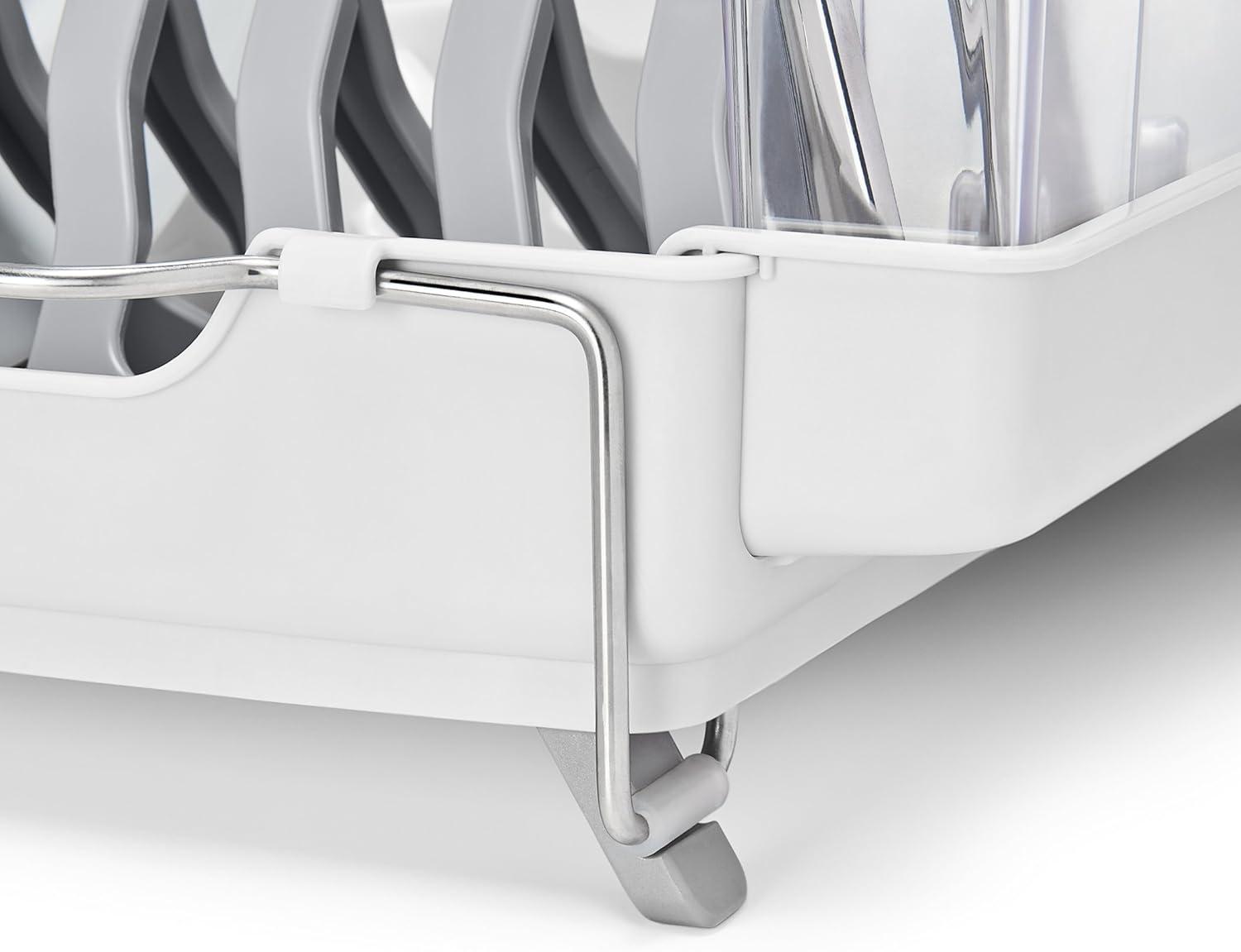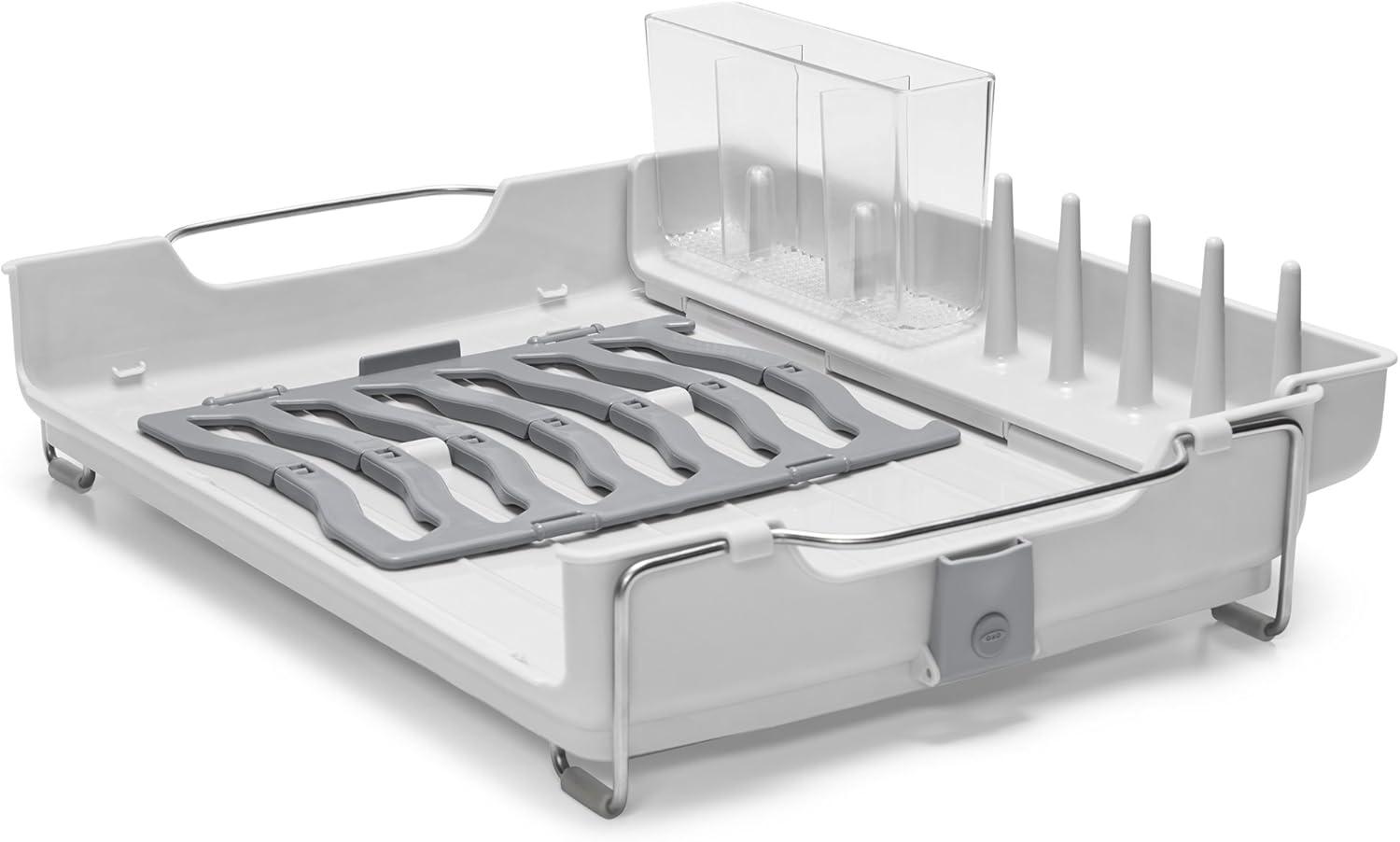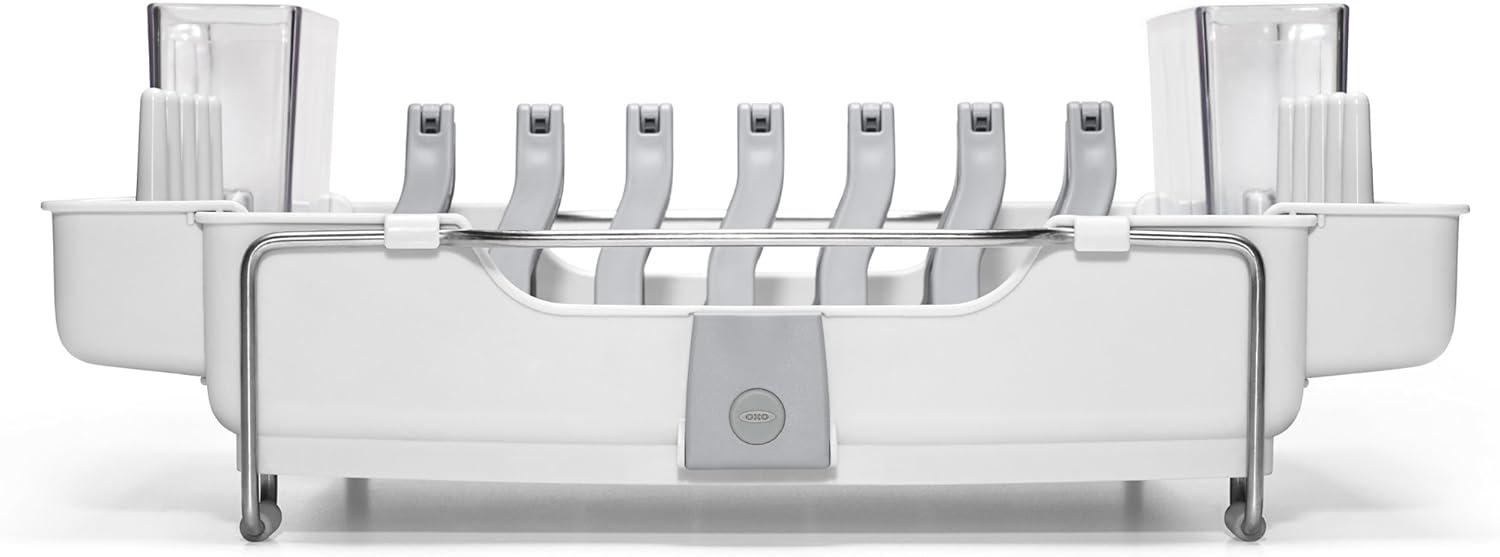 The OXO good grips foldaway dish rack is convertible, convenient and compact. It features a plate rack that holds plates or bowls neat and upright, and is safe for fine china and delicate dishware. When the plate rack is folded down, it leaves the middle of the dish rack open to accommodate large bowls, cookware, and more. The convenient cup racks hold cups, mugs or wine glasses inside rack to prevent dripping on the counter. Divided utensil holders have a generous capacity and are removable for easy unloading. To drain directly into the sink, simply fold out the feet and snap open the pour spout. The side walls, feet and spout of the foldaway dish rack all fold for compact storage.