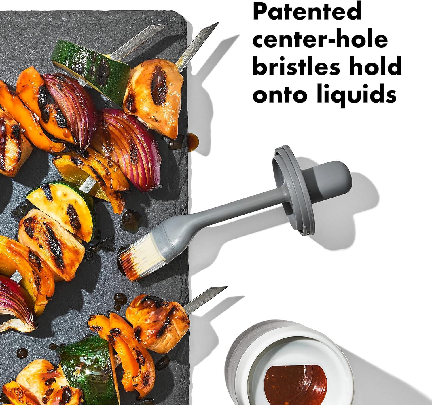 Multiple layers of silicone bristles feature gaps in center to hold liquids better as they are transferred from bowl to food