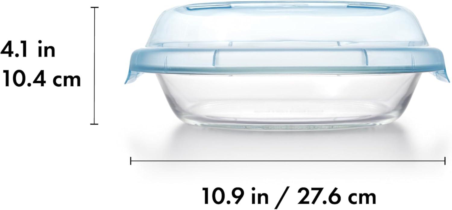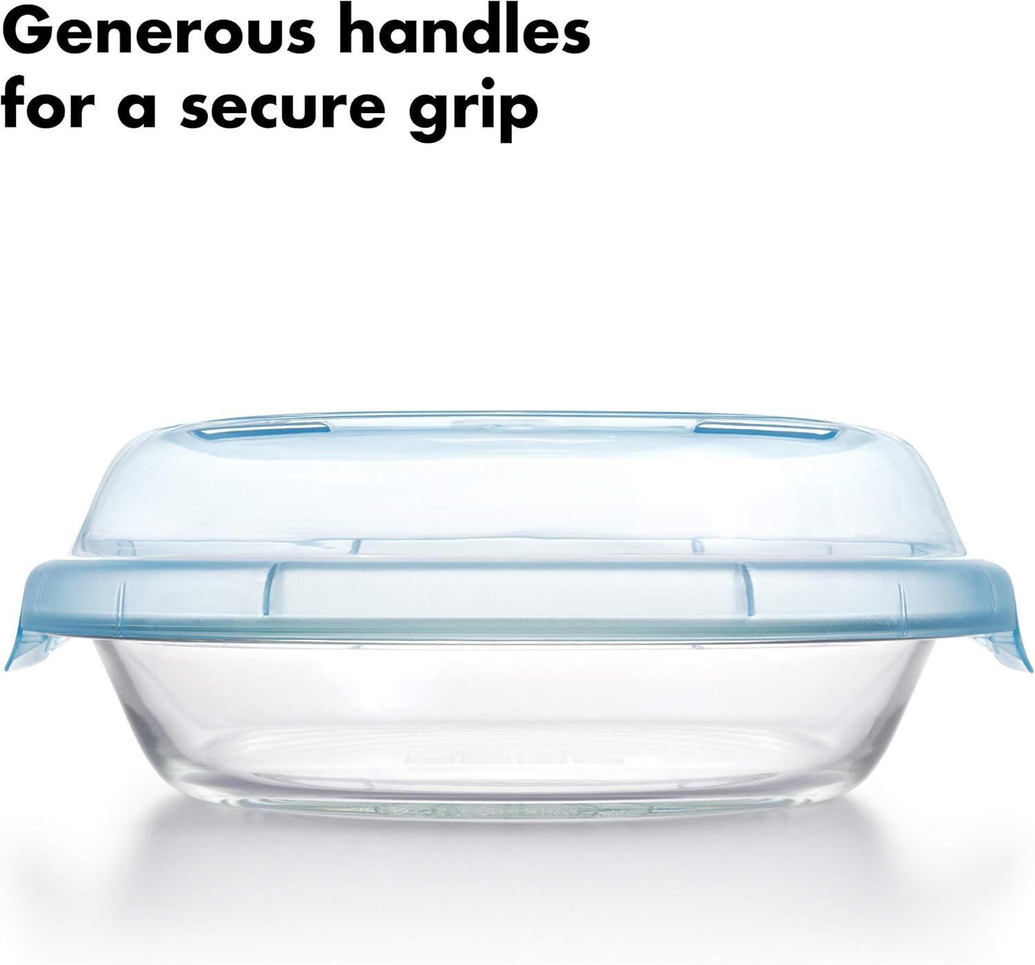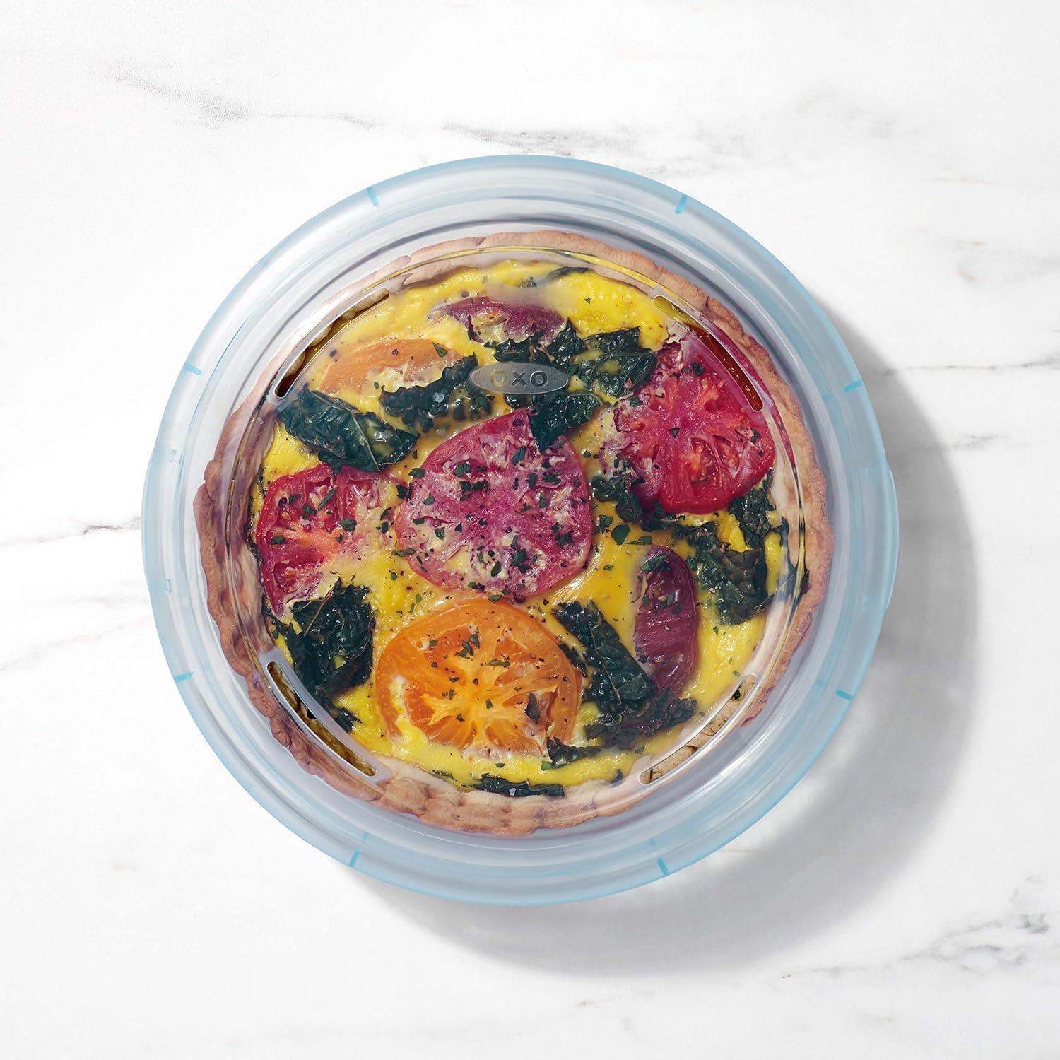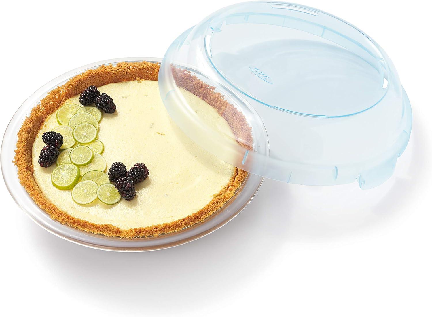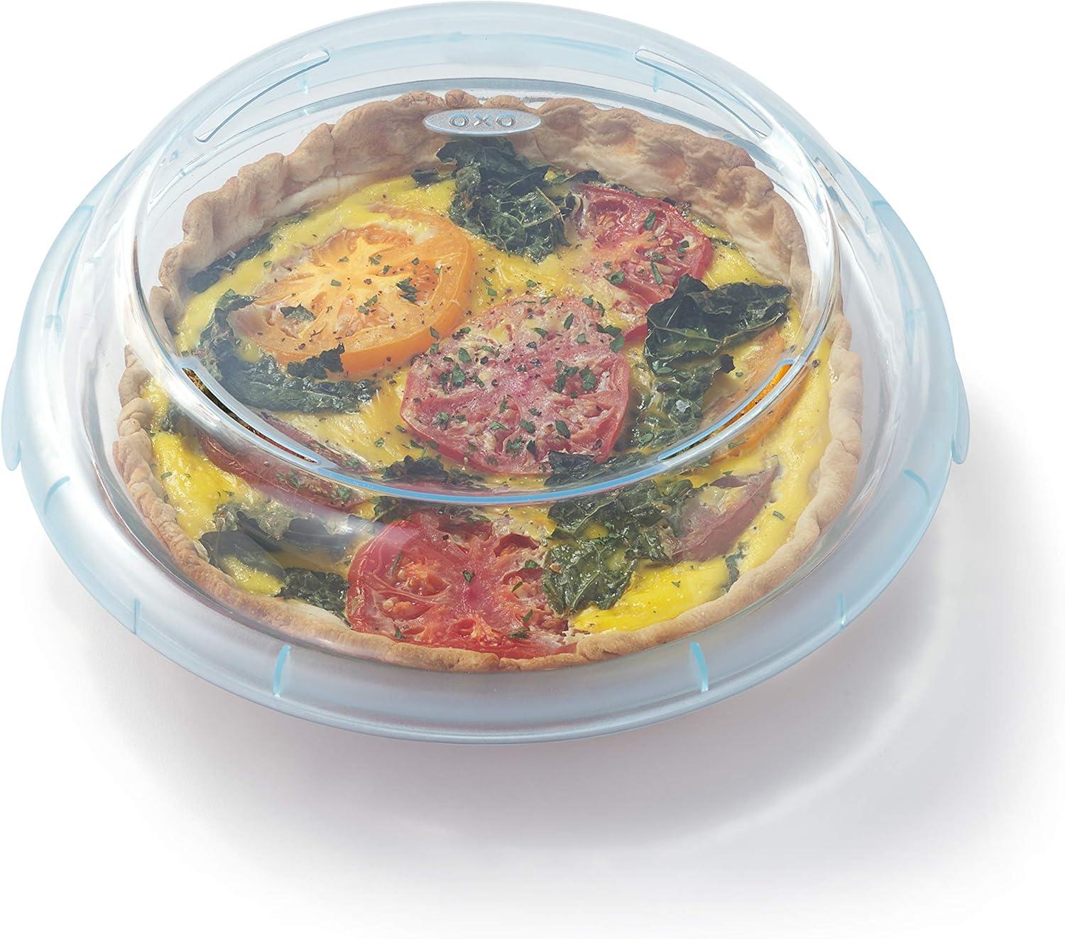 The OXO Good Grips Covered Pie Dish is made of borosilicate glass to allow transferring from oven or microwave to freezer. Comes complete with a translucent, BPA-free lid to help protect contents and prevent spilling when storing or on-the-go.