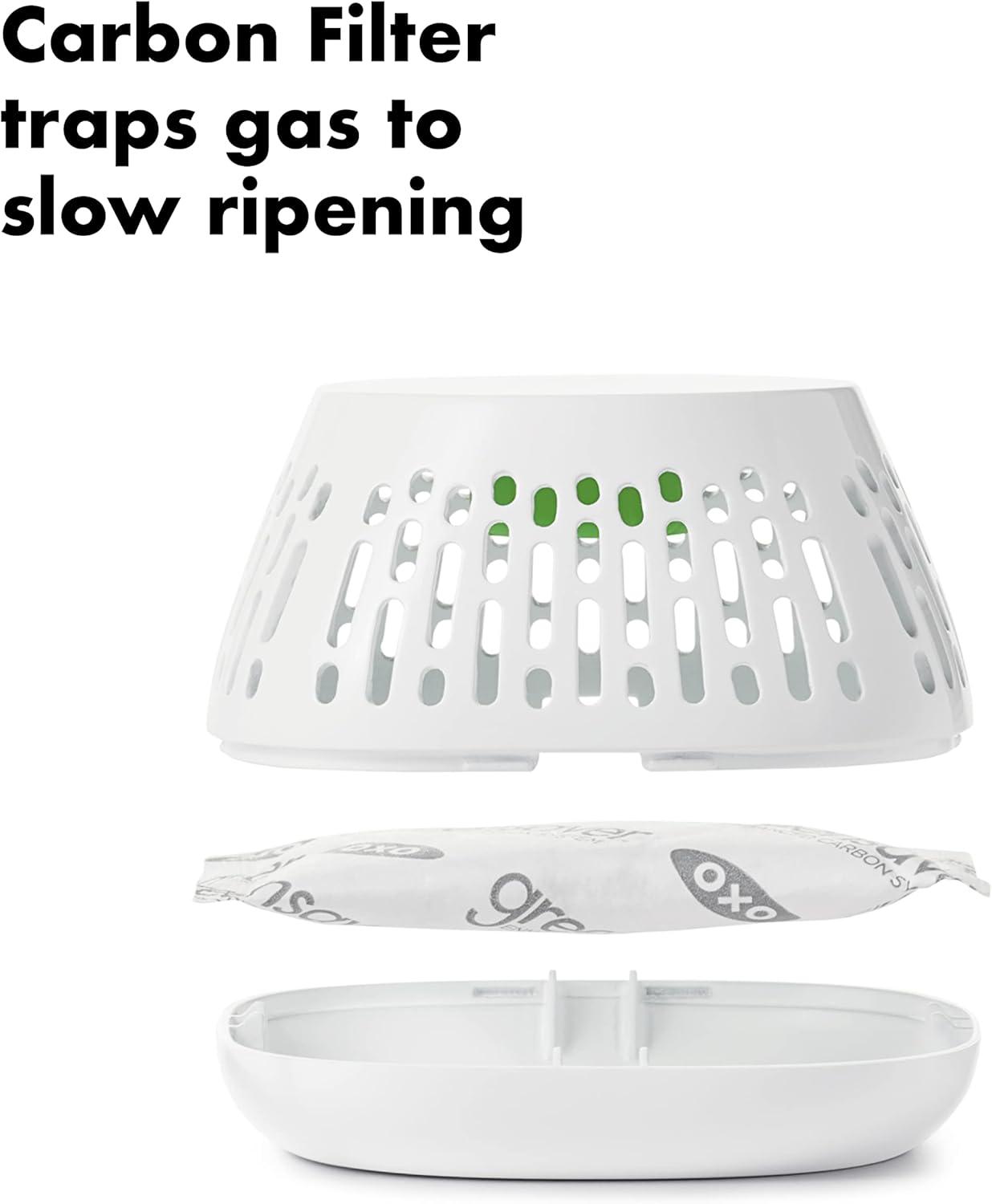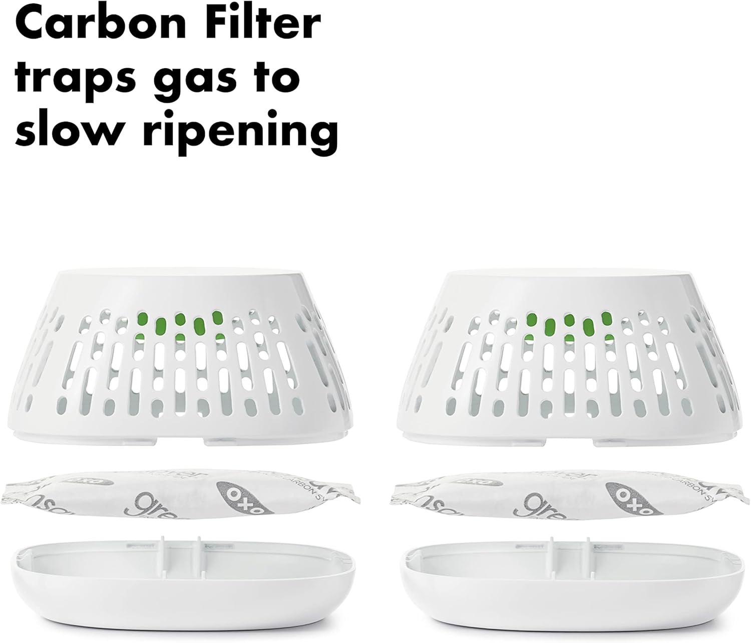 Reduce food waste with the OXO Good Grips Greensaver™ Standing Crisper Insert, which prolongs the life of fruits and vegetables so that you can enjoy more and buy less. An enhanced Carbon Filter inside the Insert helps prevent food from spoiling by absorbing ethylene, a gas that makes produce ripen. A 360° hole pattern allows the Filter to efficiently trap the gas. The pyramid shape ensures exposure and airflow, even in crowded crisper drawers. Pack includes 2 Standing Crisper Inserts and 2 Carbon Filters. Each Filter should be replaced about every 90 days, when it will no longer have the capacity to absorb more ethylene. A built-in date indicator keeps track of when it’s time to replace the Carbon Filter.