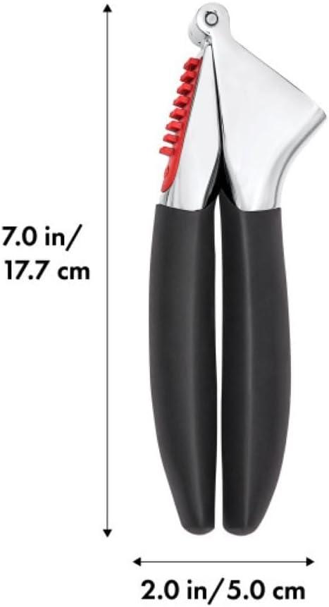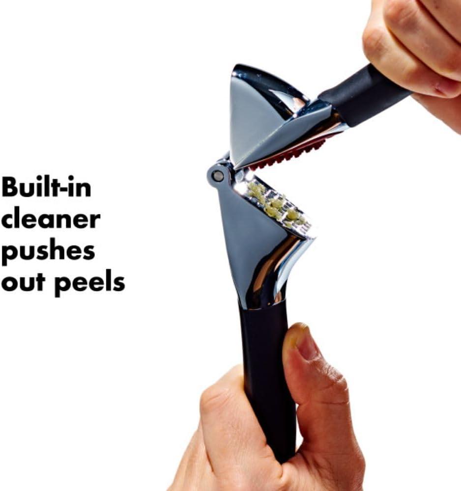 Say good-bye to sticky, garlicky fingers: The OXO Good Grips Garlic Press lets you prep garlic quickly—no mincing required. Our sturdy, die-cast zinc Press has a large chamber for pressing multiple cloves at once. It’s designed with an efficient hole pattern that easily crushes garlic and pushes it through, leaving the skins behind. The soft, comfortable handles provide a non-slip grip and absorb pressure to reduce strain when squeezing. Flip the top handle over to use the built-in cleaner to push out leftover pulp and skins, then rinse clean or toss in the dishwasher.