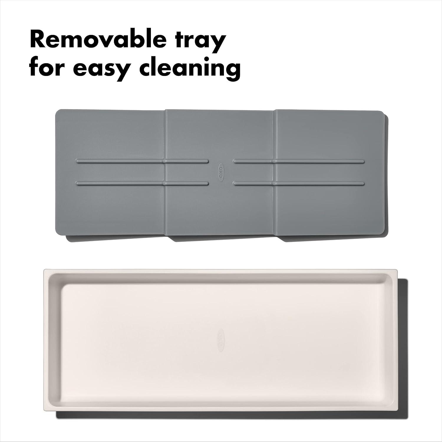 The OXO Good Grips Expandable Utensil Drawer Organizer helps you declutter any size drawer. The utensil caddies save space by keeping utensils neatly stacked, and the large, undivided area is ideal for irregular-shaped kitchen tools, like can openers. The Organizer even includes a removable cup for small, hard-to-store gadgets, like wine stoppers and corn holders. The non-slip feet keep the Organizer in place when you open and close the drawer. The space-maximizing design features square corners to eliminate gaps and deliver a clean, custom look in your drawers. The trays are removable for thorough cleaning and for ease when setting the table.