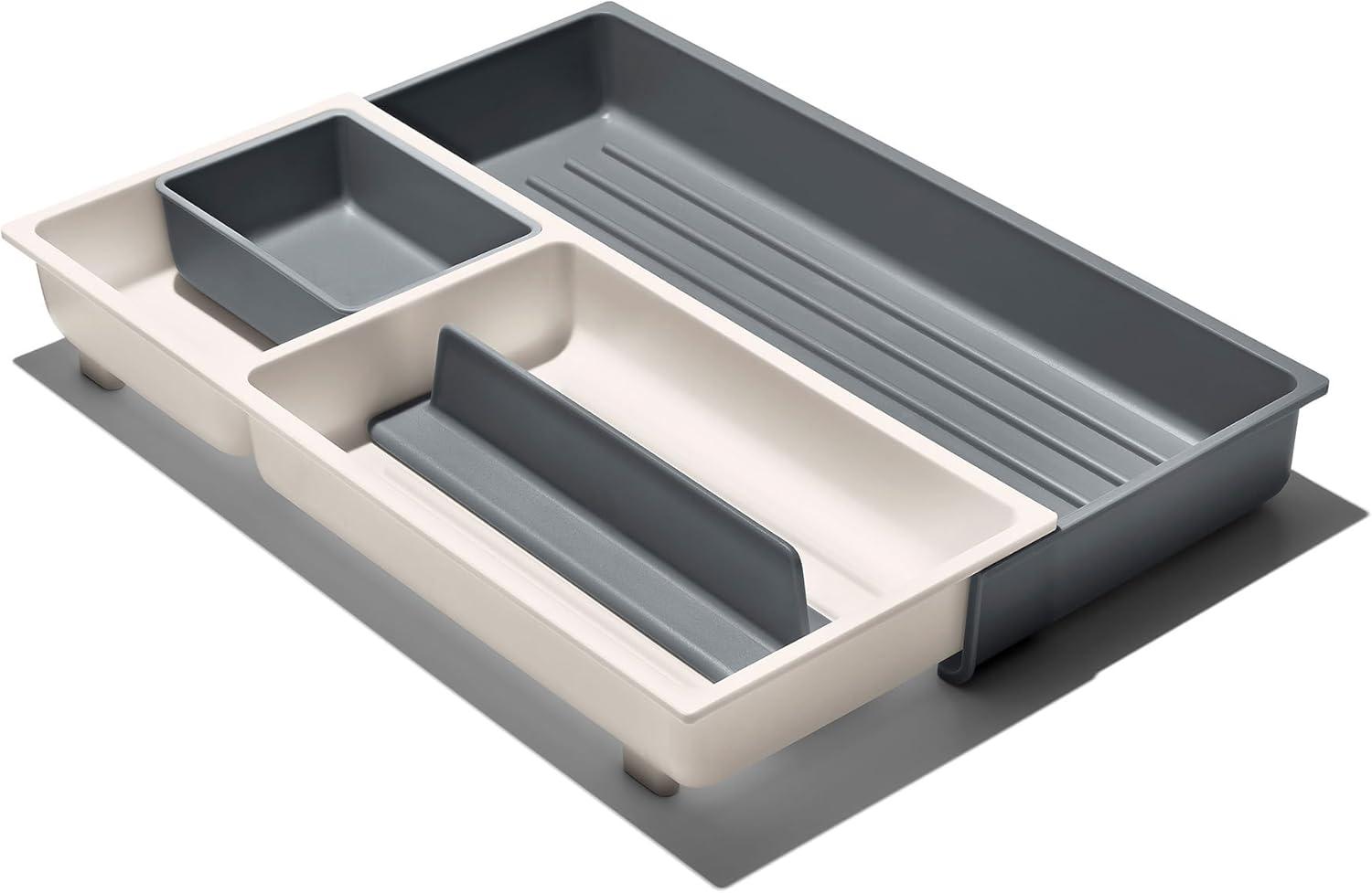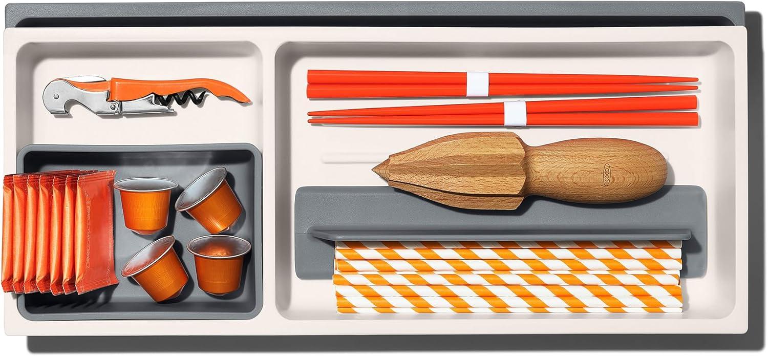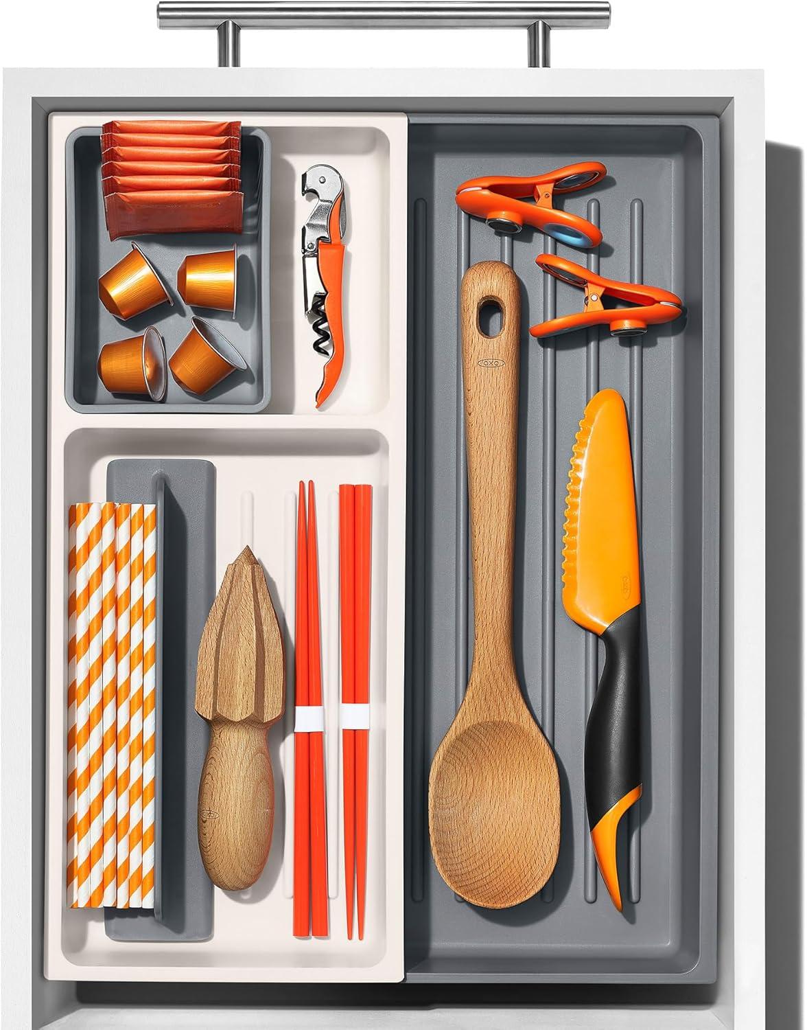 The OXO Good Grips Expandable Utensil Drawer Organizer helps you declutter any size drawer. The utensil caddies save space by keeping utensils neatly stacked, and the large, undivided area is ideal for irregular-shaped kitchen tools, like can openers. The Organizer even includes a removable cup for small, hard-to-store gadgets, like wine stoppers and corn holders. The non-slip feet keep the Organizer in place when you open and close the drawer. The space-maximizing design features square corners to eliminate gaps and deliver a clean, custom look in your drawers. The trays are removable for thorough cleaning and for ease when setting the table.