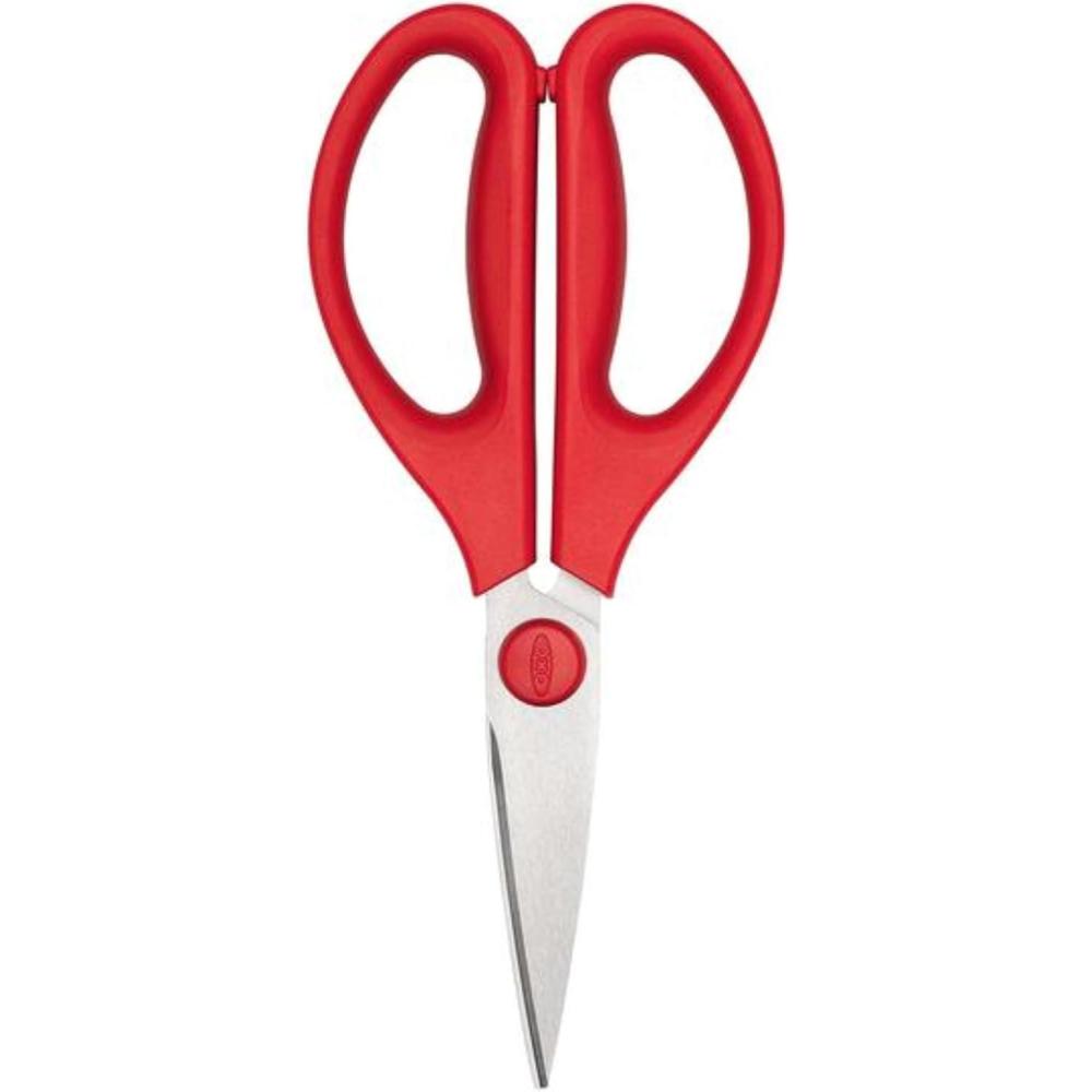 The OXO Good Grips Kitchen Shears easily cut through twine, cardboard, vegetables, meat, herbs and more. The durable stainless steel blades have a micro-serrated design that grips items securely and prevents slipping. The comfortable, non-slip handles absorb pressure when cutting and separate for through cleaning. Hand wash only.