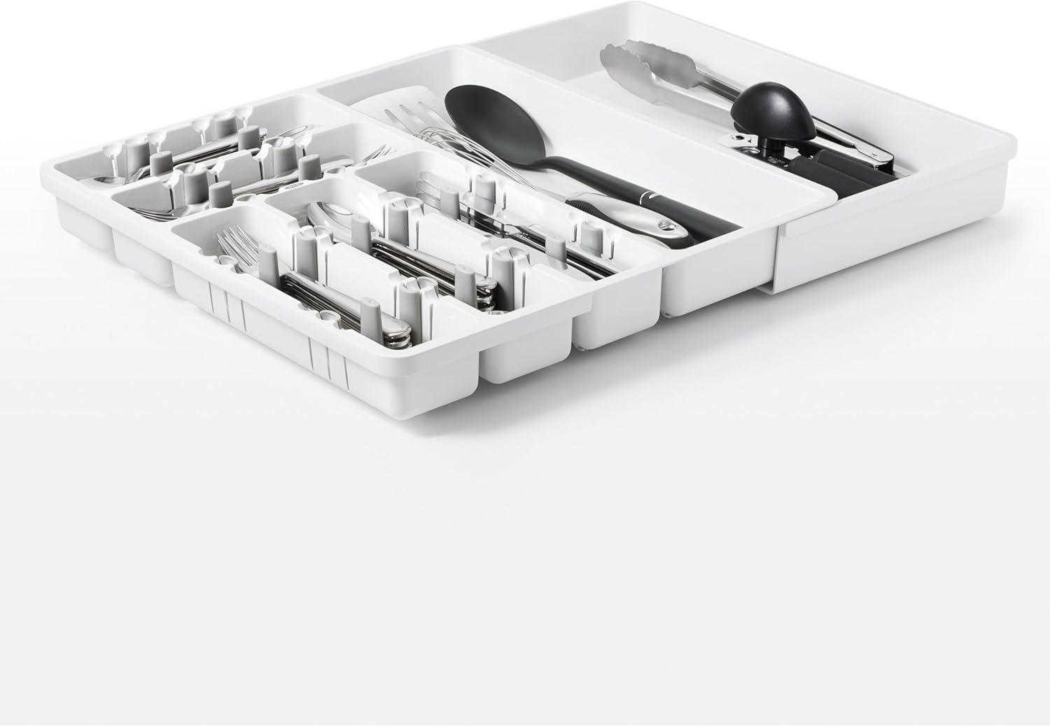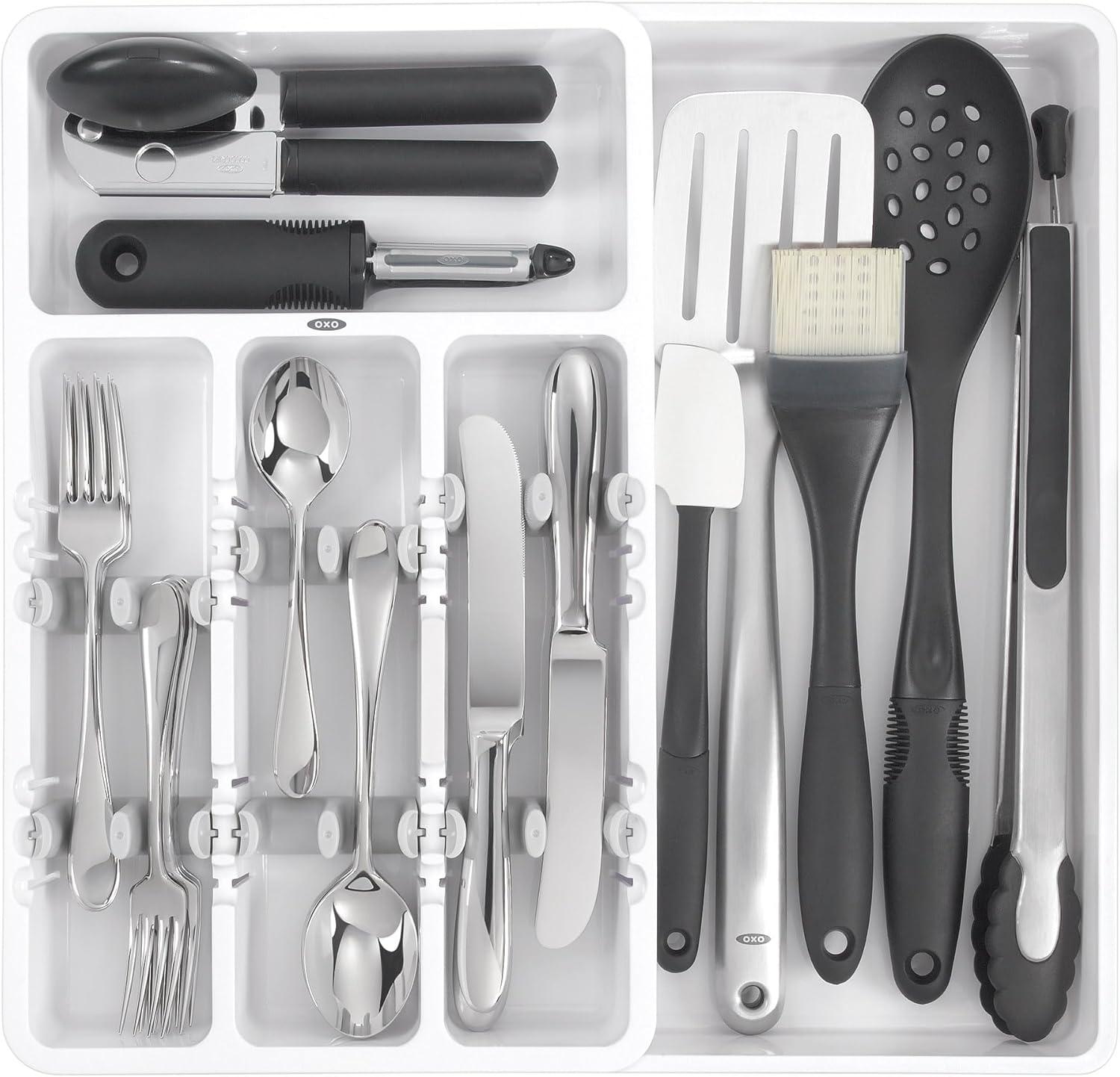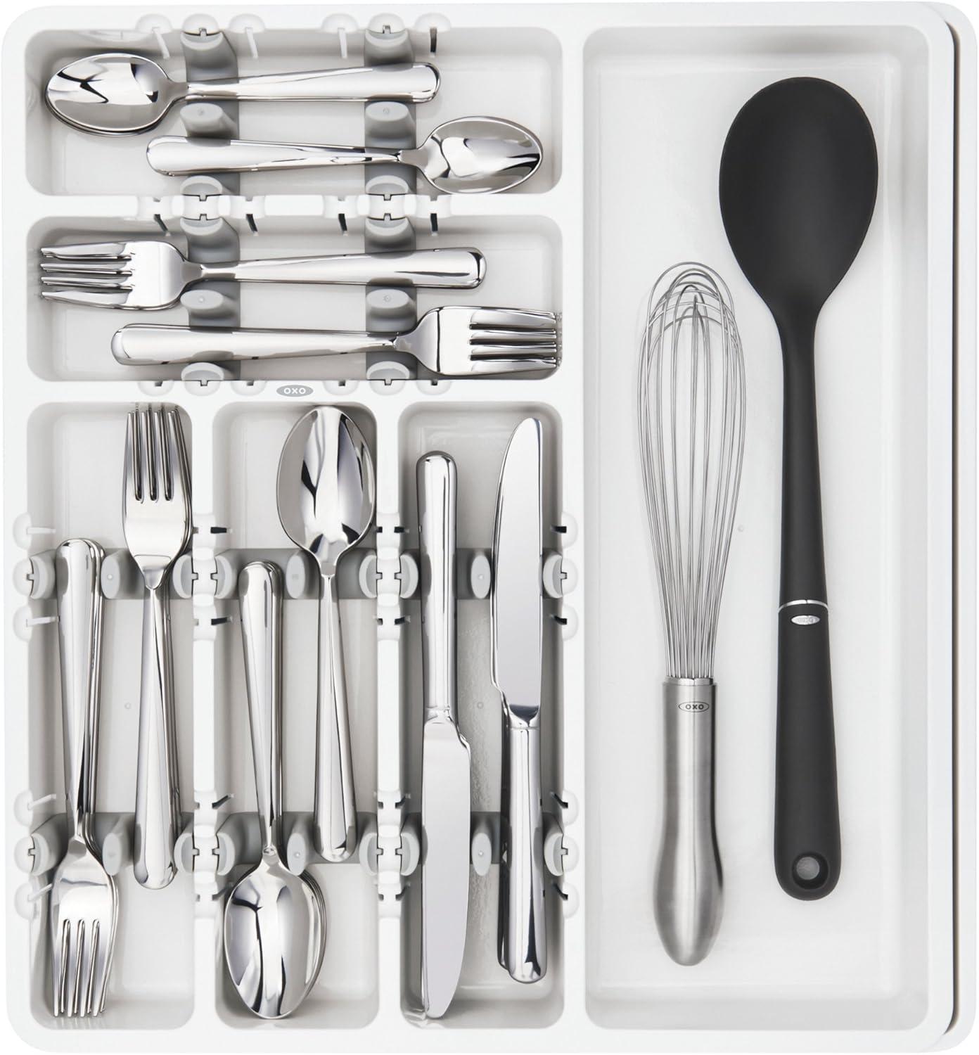 Our expandable utensil organizer's adjustable dividers hold more utensils by letting you stack them in opposite directions. The expanded space holds longer items for added storage. To adjust dividers, simply pinch the side walls and slide in or out. Non-Slip feet keep the organizer in place.