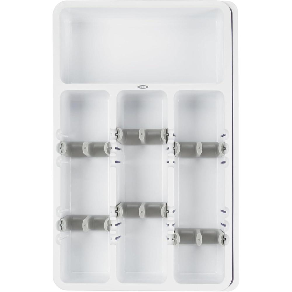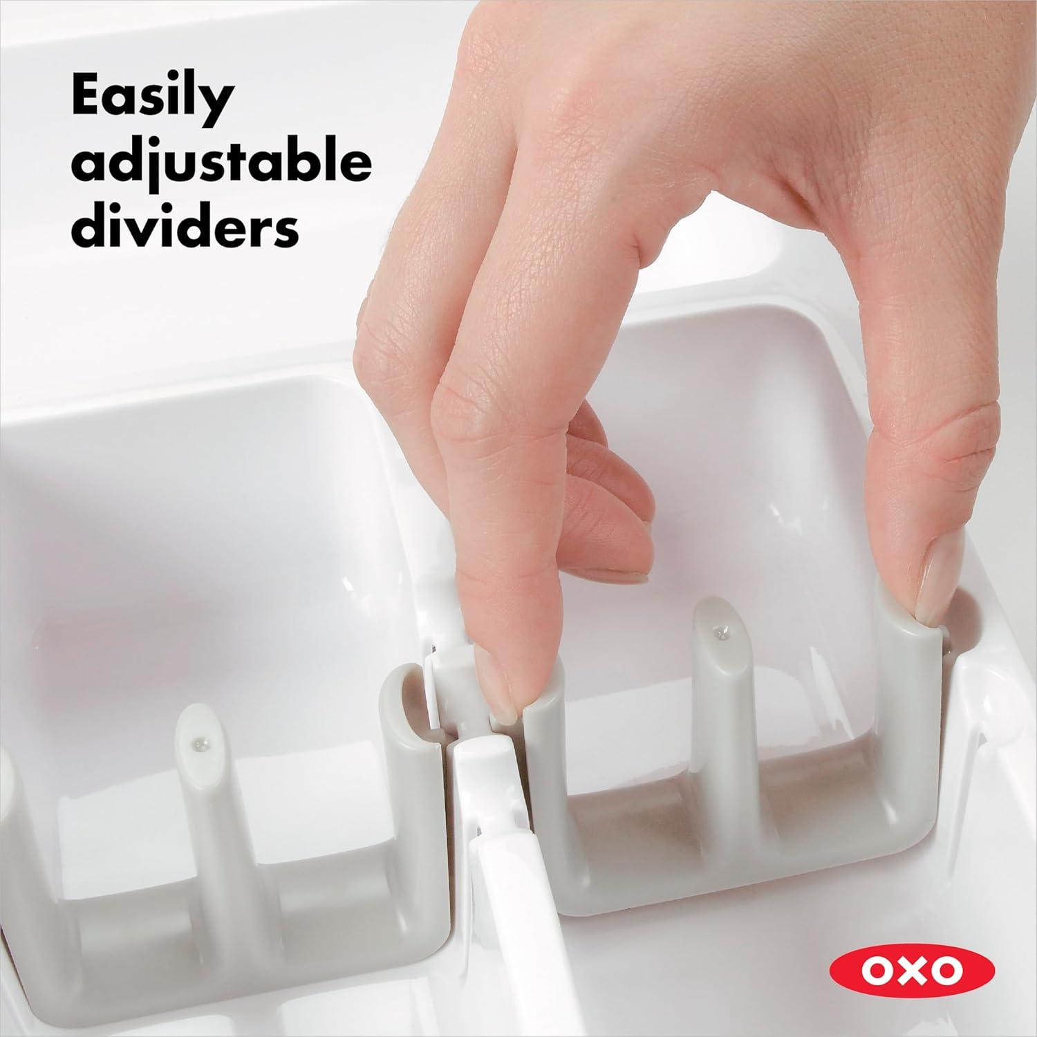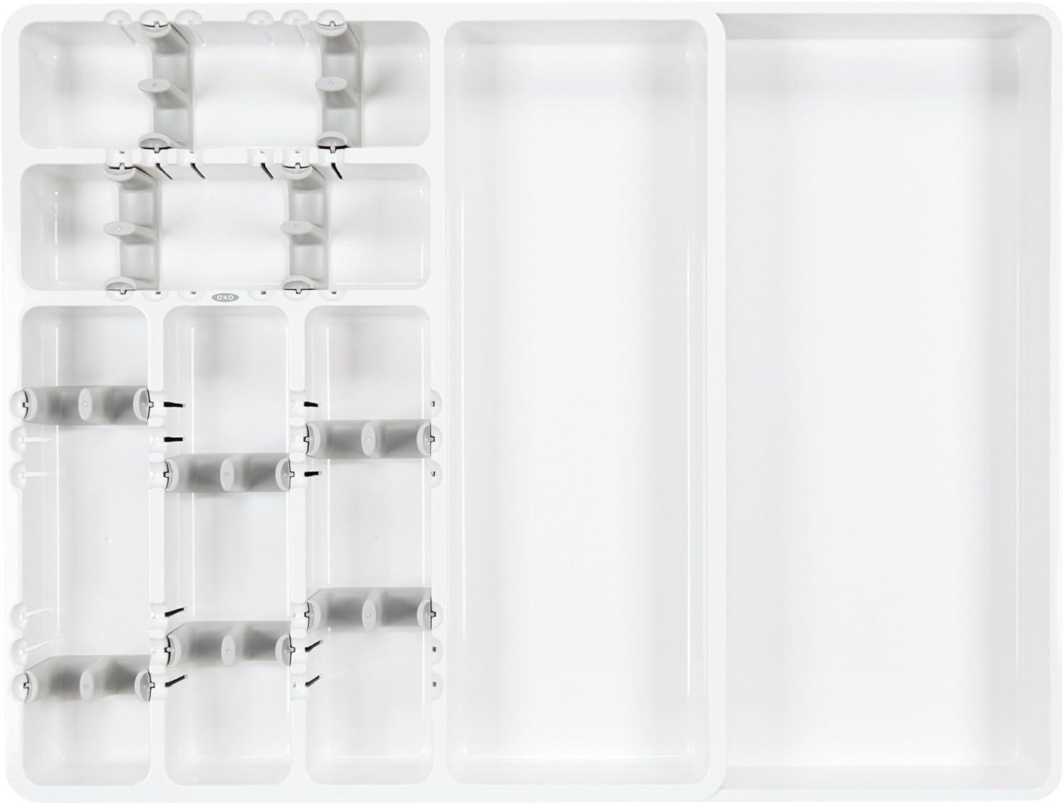 Our expandable utensil organizer's adjustable dividers hold more utensils by letting you stack them in opposite directions. The expanded space holds longer items for added storage. To adjust dividers, simply pinch the side walls and slide in or out. Non-Slip feet keep the organizer in place.