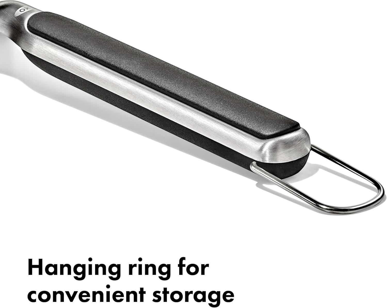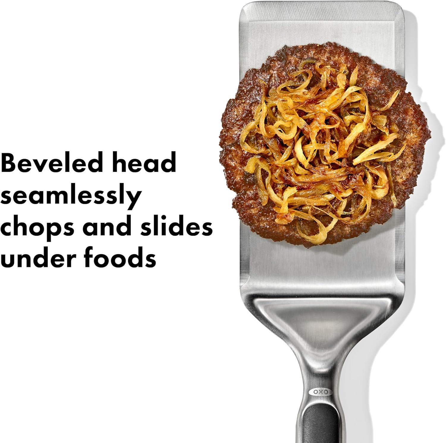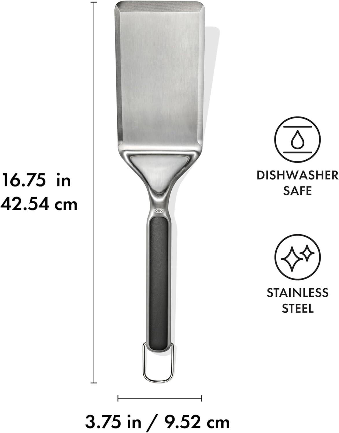 The OXO Good Grips Large Griddle Turner is flipping awesome! It’s an essential tool for indoor or outdoor griddle cooking. Cook, flip and serve your griddled meals with this turner – whether you’re making pancakes, burgers, bacon or eggs. It’s made of high-quality, durable stainless steel. One of the best features of this turner is the weight of it – it’s got a nice heft to it, so you can feel confident when you’re flipping your food on the griddle. Easily chop up meat on your griddle with the large, beveled head on this turner, then slide the turner under foods seamlessly for flipping or serving. The handle on this turner features a nonslip grip, offering a secure and comfortable hold on the turner while you’re cooking on the griddle. Easily access this griddle accessory with the ring on the end of the handle – perfect for hanging up the griddle turner on your outdoor griddle or in your kitchen setup. This essential bbq accessory is easy to clean – just pop it in the dishwasher after each use so it’s ready to go for your next griddling session. Dishwasher safe.