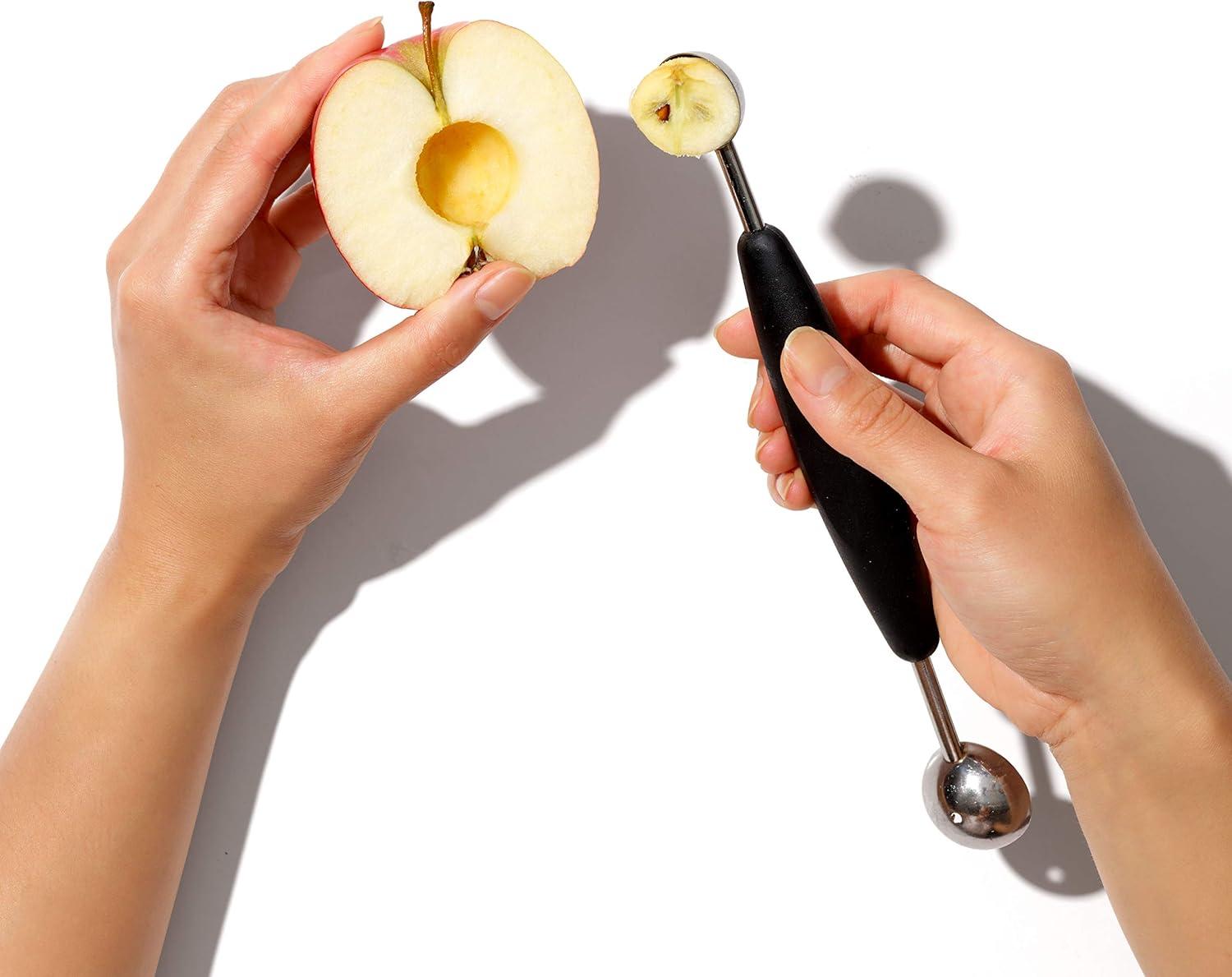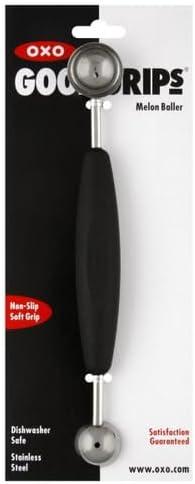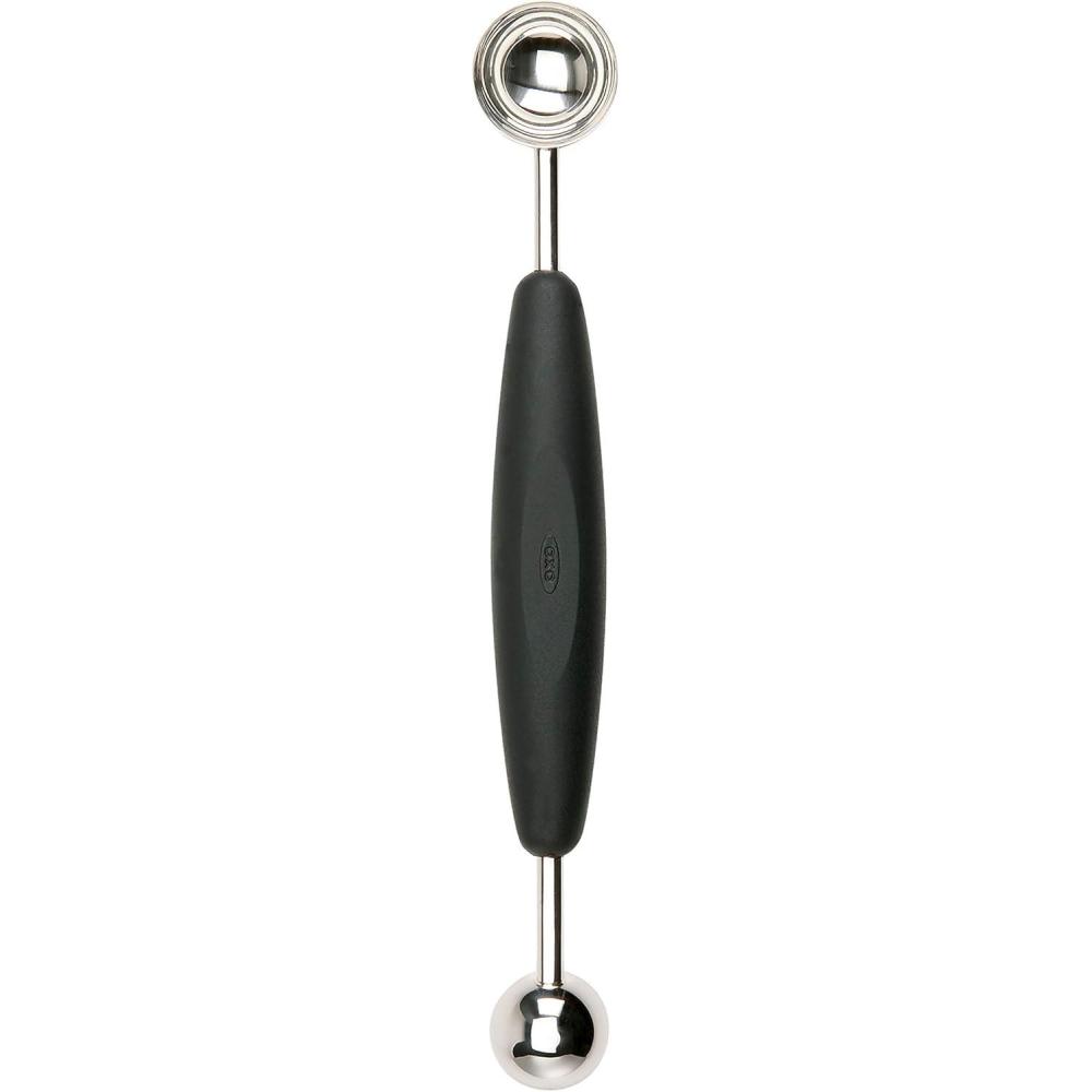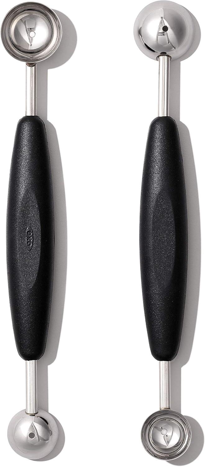 “The OXO Good Grips Double-Sided Melon Baller does more than make perfectly sized melon balls. Use it to prep a variety of fruit, veggies, sweet and savory items, too. The small-sized scoop cleanly removes seeds from vegetables like bell peppers, cucumbers and summer and winter squash; you can even use it to make homemade truffles. The big scoop is perfect for fruit salad, ice cream, drop cookies and more. Durable stainless steel edges are safe to the touch, but neatly scoop fruit without piercing the skin. The non-slip grip is comfortable to hold and stays secure even when things get messy. Dishwasher safe. “