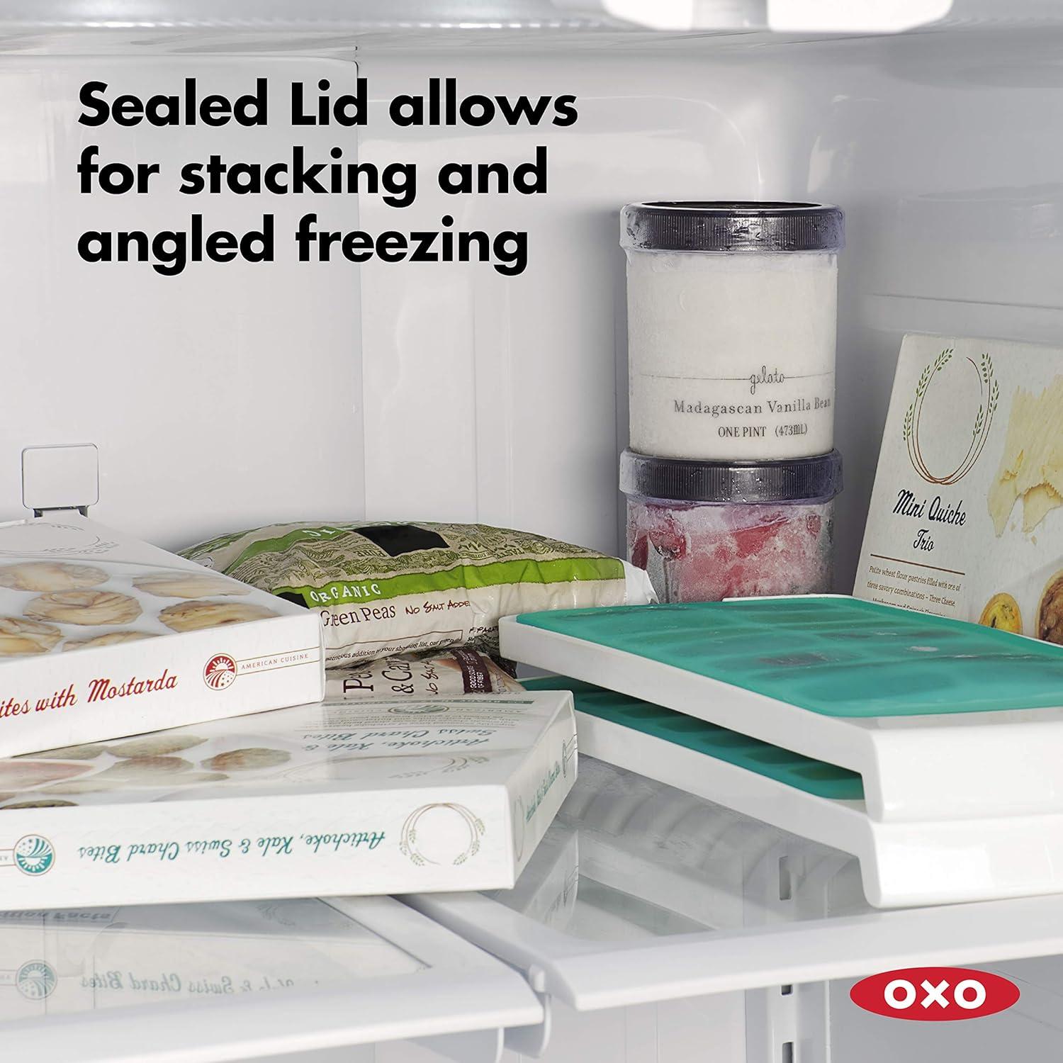 Sealed lid allows for stacking and angled storage in freezer