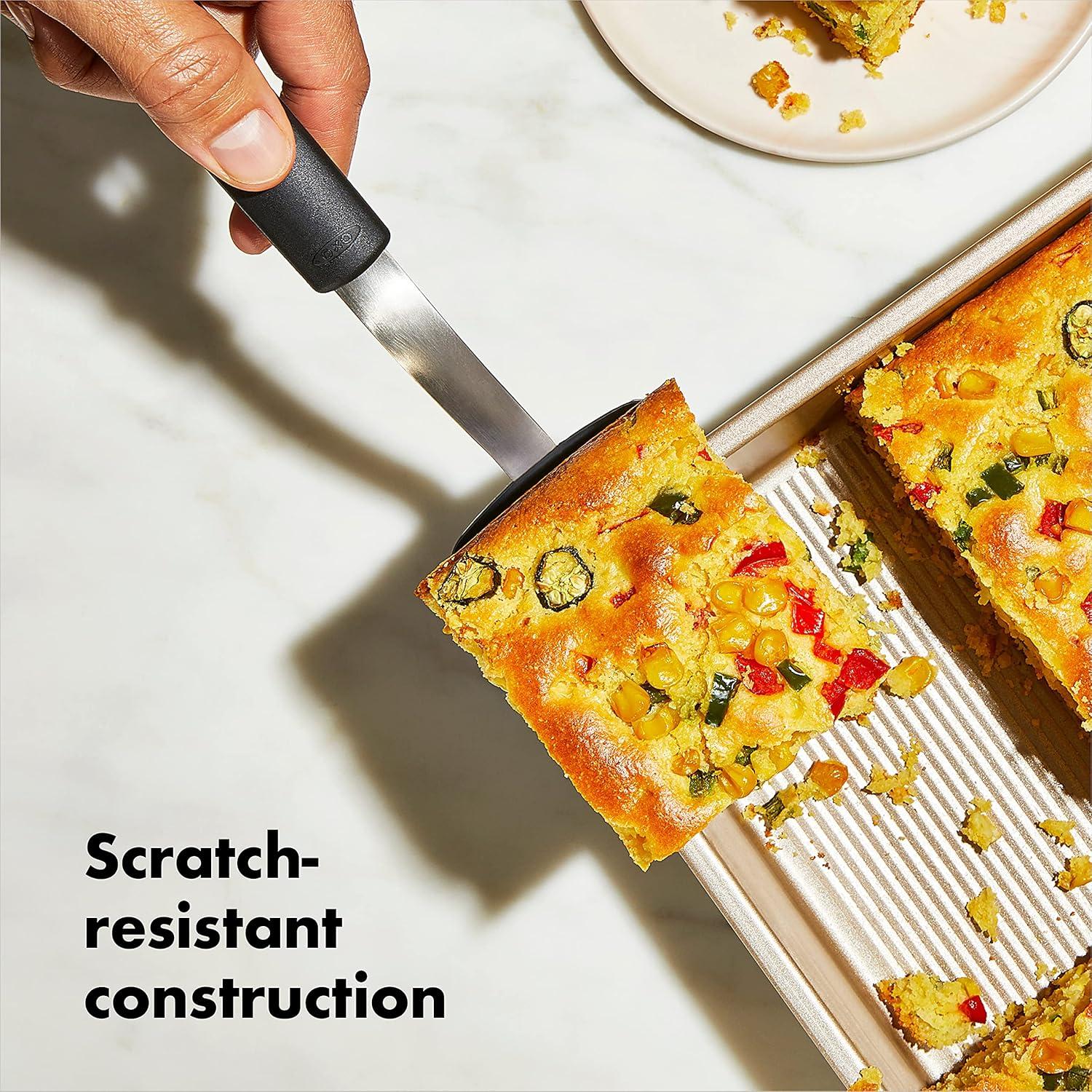 OXO Good Grips Bakeware combines precise engineering with all the thoughtful touches that go into OXO products. Non-Stick Pro Bakeware is made from durable, heavy grade aluminized steel that promotes even heat distribution. Each piece features a commercial grade, double layer, ceramic-reinforced PTFE coating that protects against scratching, staining, corrosion and abrasion. This dual function coating is ideal for both savory and sweet treats. The Nonstick line also utilizes a micro textured pattern to promote airflow and minimize surface contact for even baking. All OXO Good Grips Nonstick Pro Bakeware pieces feature square-rolled edges for a secure grip, and are dishwasher safe.