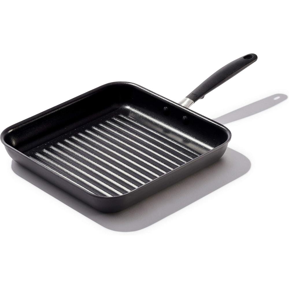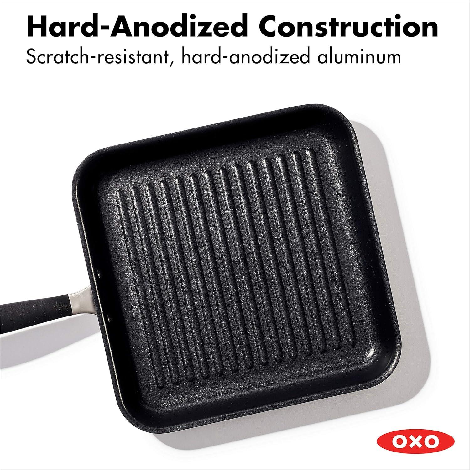 Bring grilling indoors with the 11-in OXO Good Grips Non-Stick Grill Pan. The pan delivers the same results as an outdoor grill but with less fuss and quick, easy cleanup. The pan features a three-layer, German-engineered non-stick coating for effortless performance while using less oil. Our pan’s scratch-resistant, hard-anodized body heats faster and more evenly than traditional aluminum, and the silicone-wrapped stainless steel handle helps keep cooking comfortable. Hand wash. Oven safe up to 390°F/200°C. 10-year limited warranty.