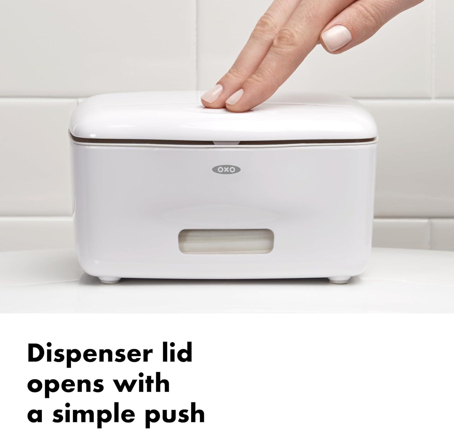 The OXO Good Grips Flushable Wipes Dispenser is the perfect way to keep flushable wipes fresh, accessible and discreet. The silicone gasket in the lid keeps wipes fresh and keeps them from drying out. The lid opens with a simple, one-handed push and the internal weighted plate dispenses wipes one at a time. The non-slip feet keep the Wipes Dispenser in place and its compact size allows it to fit neatly on the back of the toilet. The clear indicator window on the front of the Wipes Dispenser shows how many wipes are left, so you'll know when it's time for a refill. The polished construction is easy to clean and the Dispenser fits up to 60 flushable wipes.