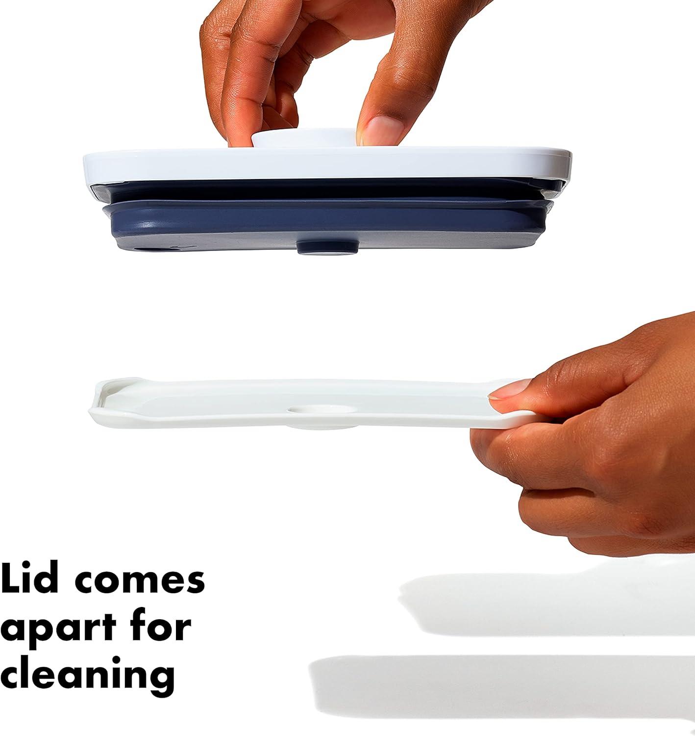 Instead of storing a bag of pet food in the garage (where pests can get to it) or the floor of your pantry (where pieces are bound to fall out and make a mess), consider the OXO 6.0 Qt/5.7 L Pet POP Container. It can easily hold up to 6.5 pounds of dog food or 4.5 pounds of cat food. The clear, square base makes for neat and streamlined storage, which means it’ll look nice on your counter or on a pantry shelf. And the lid creates an airtight seal, comes with a detachable ½ cup scoop for serving and can easily be taken apart for cleaning. For best results, always use the button to open and close. Do not carry POP Containers by the lid. Dishwasher safe.