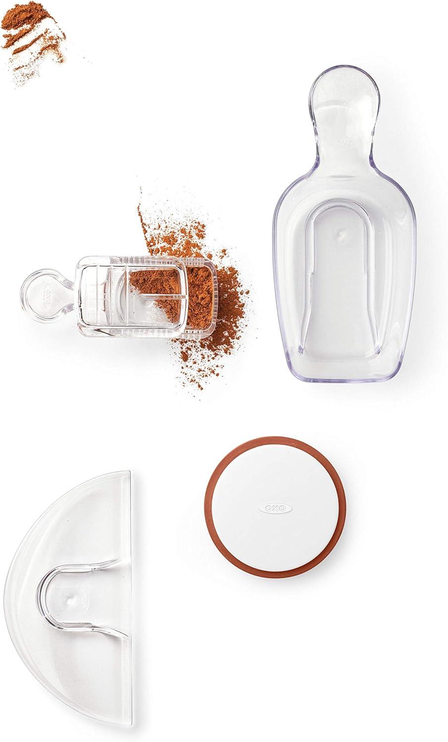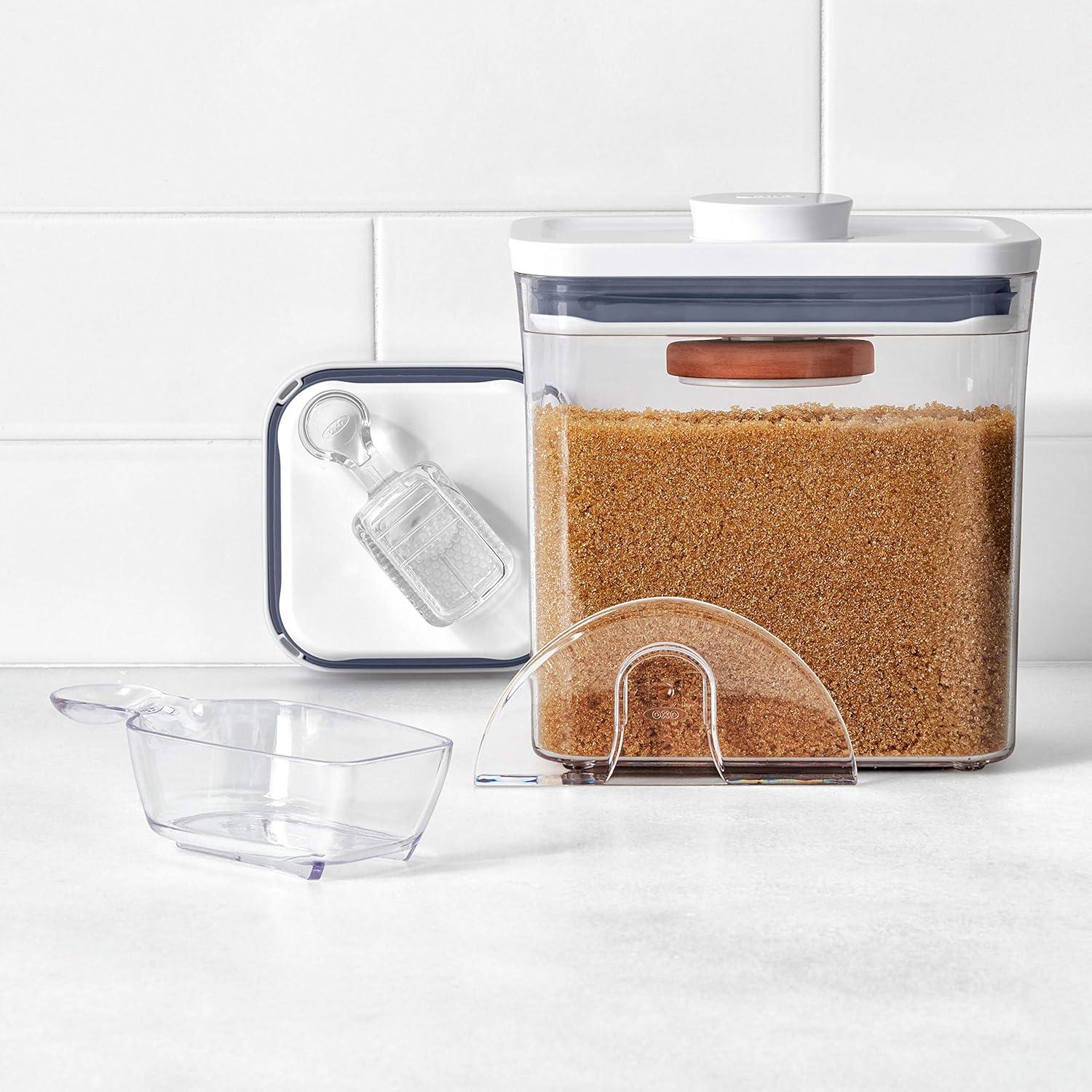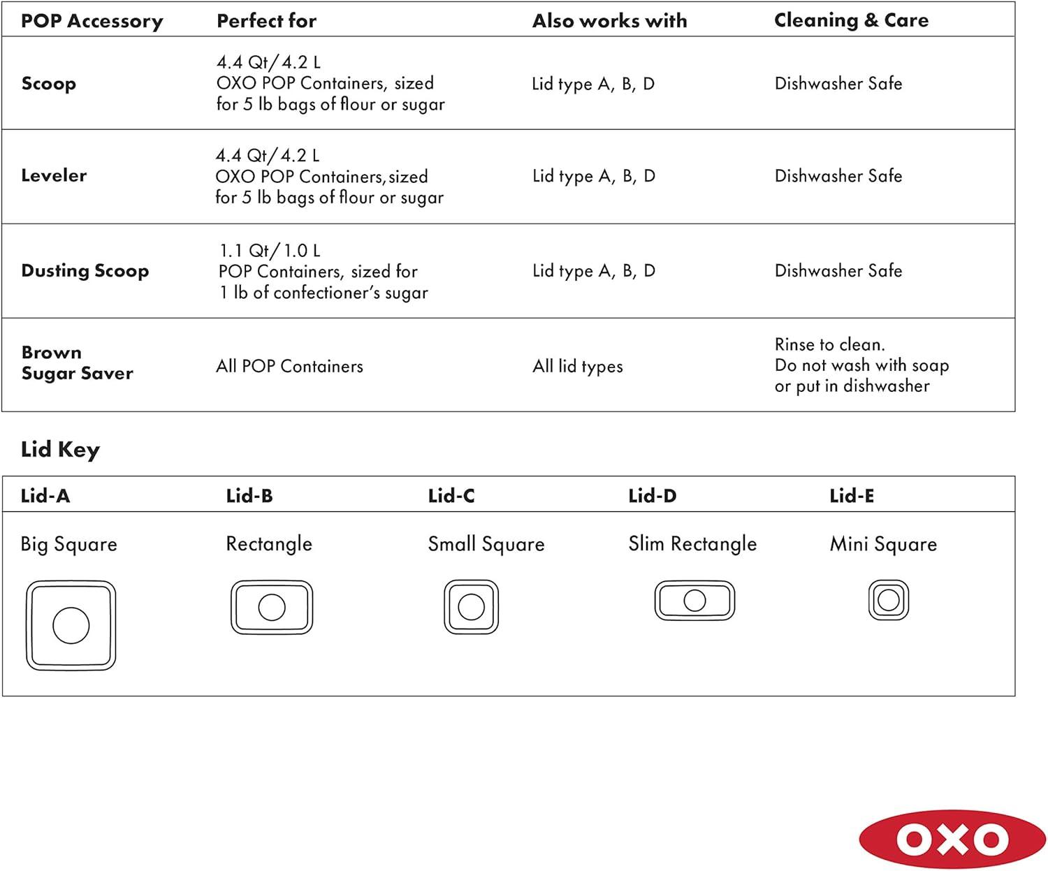 The pop accessories one-piece baking set is tailor-made for baking enthusiasts looking to make the most of their pop containers. Each BPA-free accessory is thoughtfully created for specific baking tasks and attaches neatly to the underside of pop container lids. The 1/2 cup/120 mL scoop is perfect for measuring or portioning dry ingredients like flour, sugar, oatmeal and more. The leveler is a multipurpose must-have: use it to level dry ingredients for recipes, as a bench scraper for portioning dough, to transfer ingredients or for quick cleanup. The brown sugar saver is a reusable terracotta disk that keeps Brown sugar soft, fresh and clump free. The dusting scoop helps you evenly flour work surfaces or decorate baked goods.