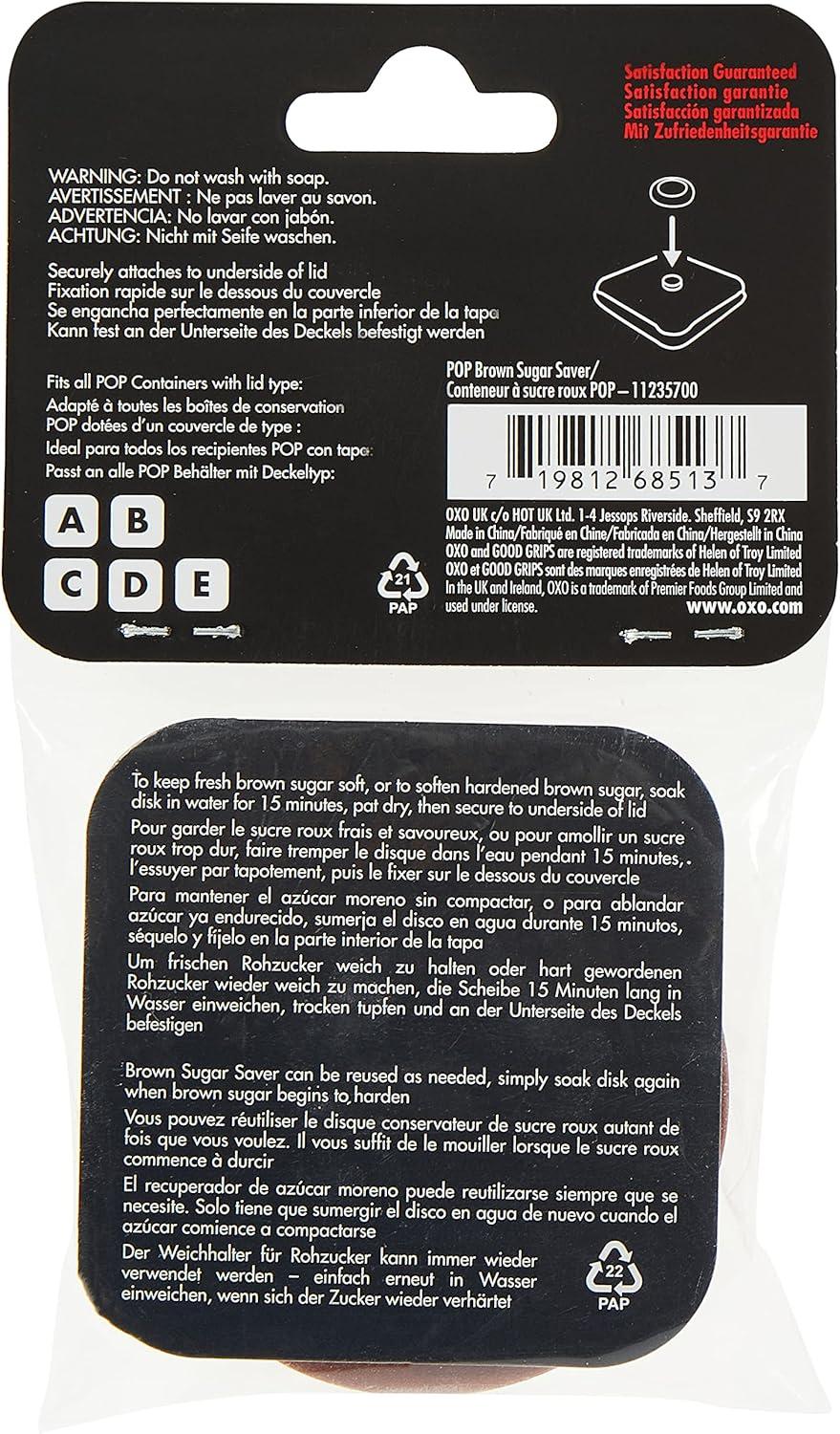 OXO Good Grips POP Accessories is a brand-new line of tools designed to help you make the most of POP. The OXO POP Brown Sugar Saver is a reusable terracotta disk that brings an end to rock-hard brown sugar by keeping it soft and fresh. To use: soak the Saver for 15 minutes, pat dry and then secure to the underside of the POP Container lid. Re-soak as necessary to keep things fresh. Do not wash with soap. Recommended for use with the 1.1 Qt / 1.0 L POP Container, sized for 1 lb of brown sugar, and the 1.7 Qt / 1.6 L POP Container, sized for 2 lbs of brown sugar; also fits POP Containers with lid type: A, B, C, D, E. BPA free.