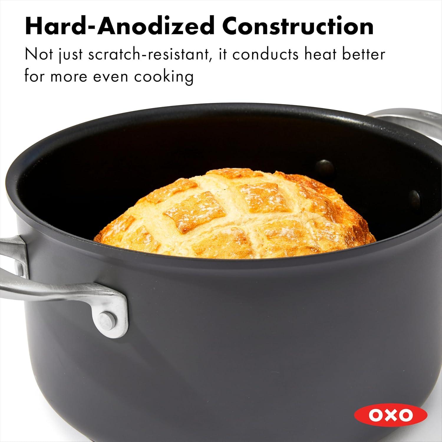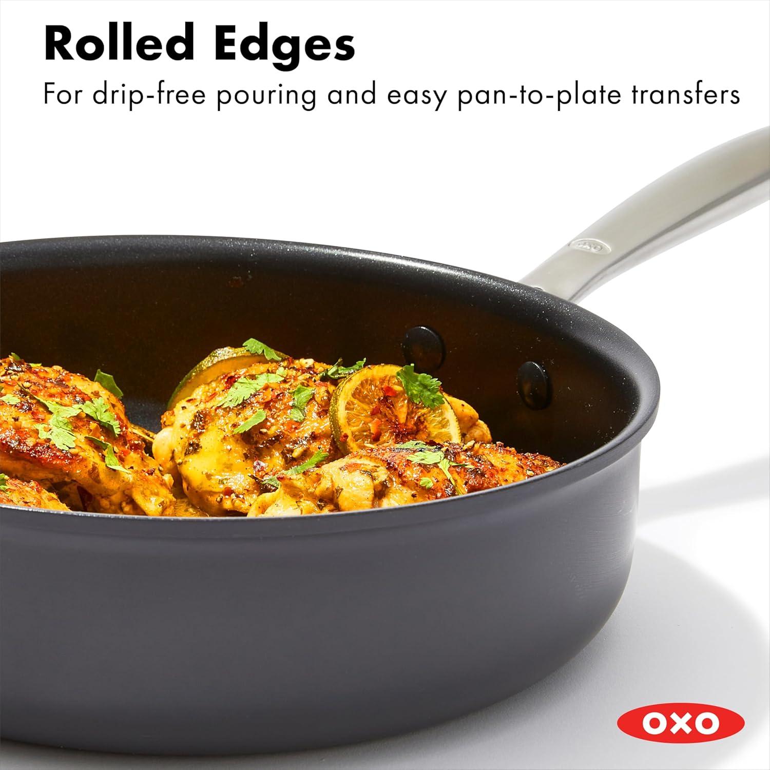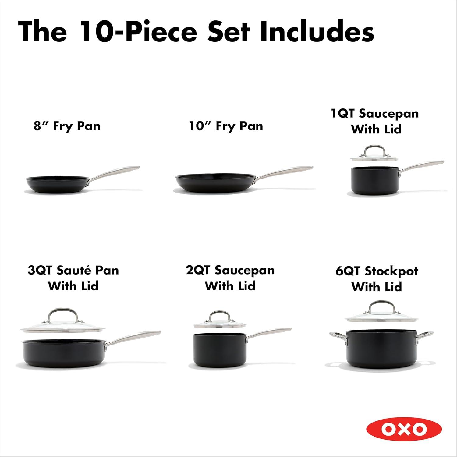 Cook like a pro with the OXO Good Grips Pro Non-Stick Saucepan Set. Both pans feature a three-layer, German-engineered non-stick coating that provides effortless performance while using less oil and delivers quick and easy cleanup. The scratch-resistant, hard-anodized bodies heat faster and more evenly than traditional aluminum, and stainless steel handles make these pans extra tough. Angled side walls help liquids evaporate quickly, and the rounded bottoms help with efficient stirring. The durable glass lids make it easy to check on your progress, whether you’re simmering stew or braising meat. Dishwasher safe. Oven safe up to 430°F/220°C. Set includes: 1 Qt/ 0.9 L and 2 Qt/1.9 L Saucepans with Lid. Limited lifetime warranty.