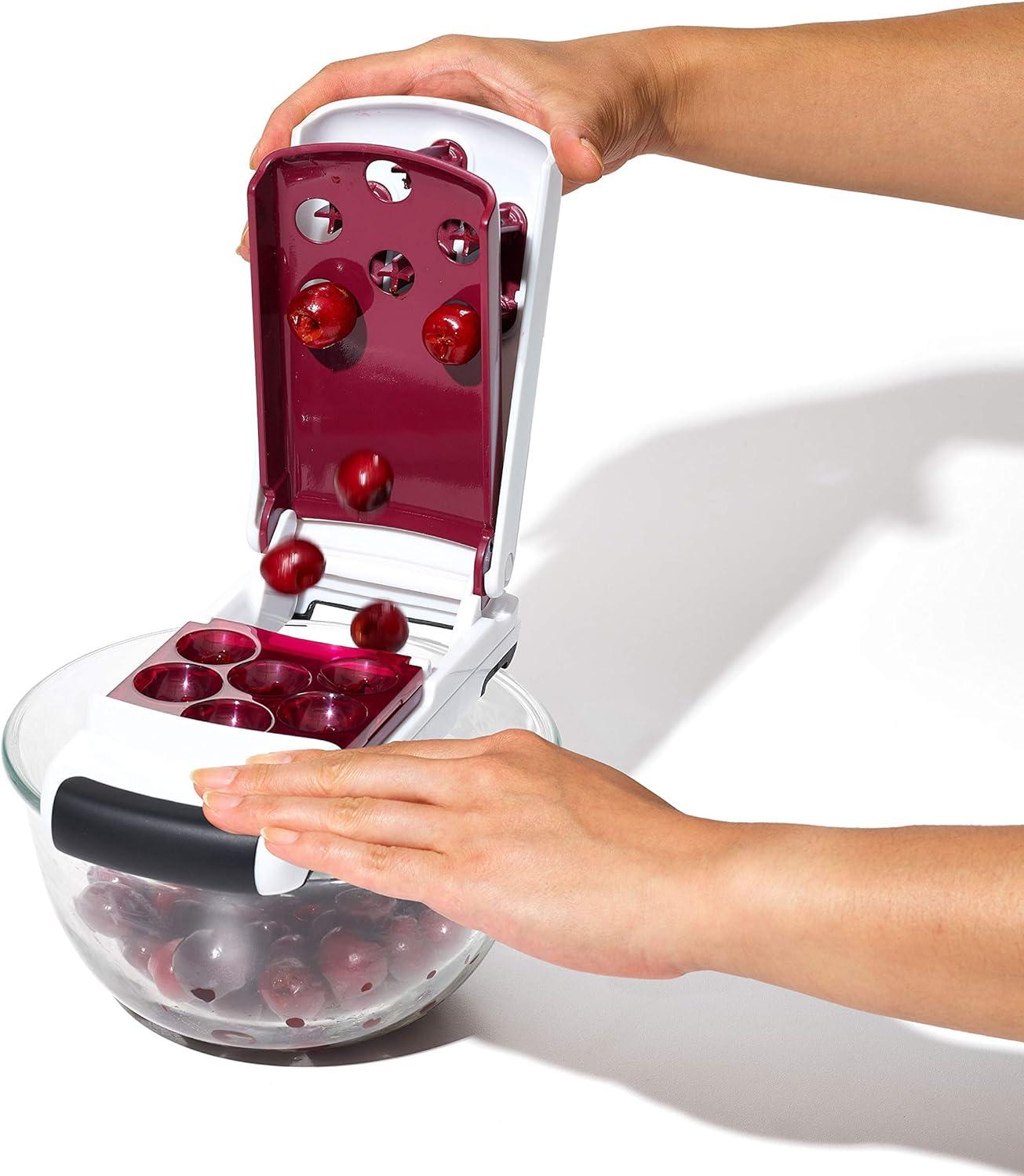 Make quick work of loads of cherries with the OXO Good Grips Quick-Release Multi-Cherry Pitter. This efficient pitter removes the stones from 6 cherries at a time and holds up to 1 pound of pits so you can prep pie, cobbler, clafoutis, fruit salad, or just a big bowl for snacking in a manner of minutes. The base adjusts to fit a wide range of bowls for pitting a little or a lot. Made for one-handed operation, there’s no need to remove the fruit after each round: When you lift the lid, the pitted cherries drop directly into the bowl while the pits are caught in an easy-to-access tray. The legs fold in for compact storage, and the pitter comes apart for thorough cleaning. Dishwasher safe.