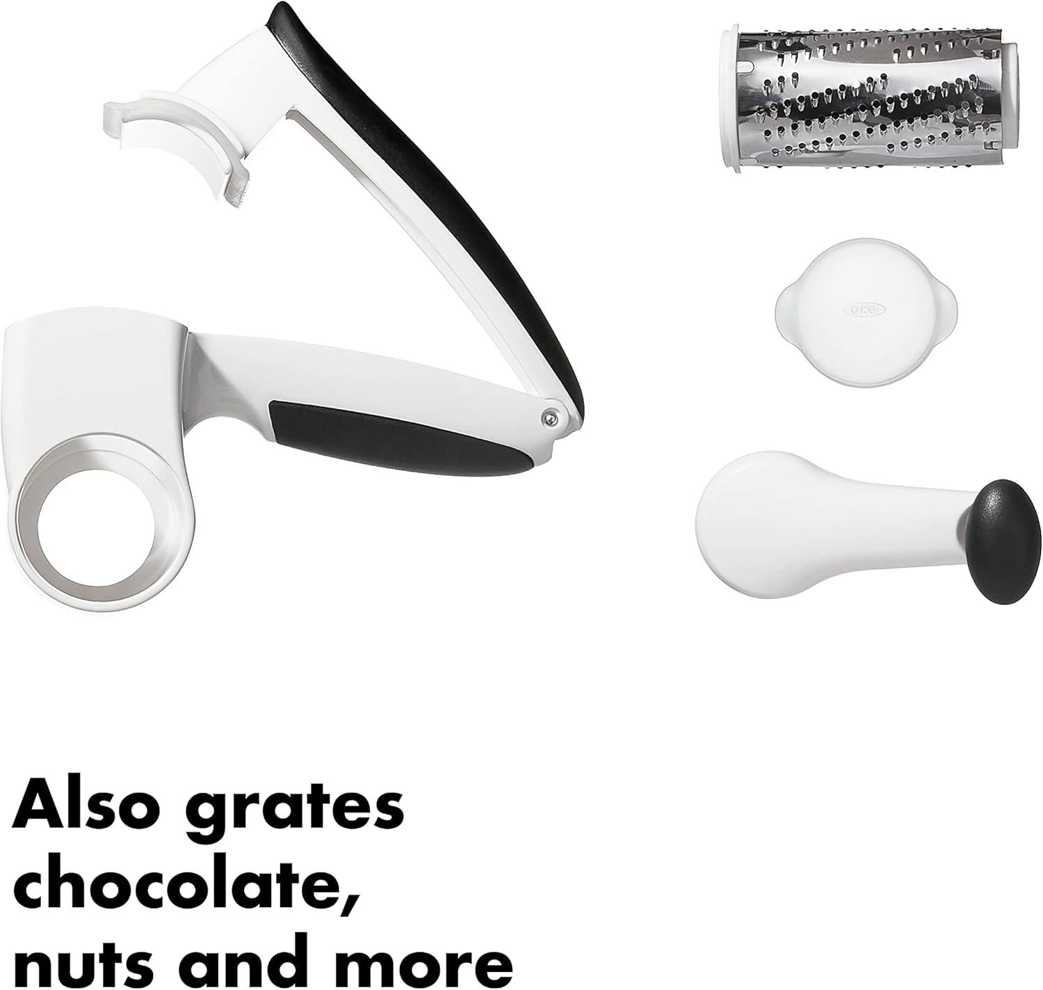 Now you can grate just the cheese you need and save the rest for later. The OXO Good Grips Seal & Store Rotary Grater provides a compartment for storing un-grated cheese right inside, with an interior silicone seal that ensures it won’t dry out. Grate with the cap on and window closed to collect cheese before serving, or slide the window open to grate the desired amount directly onto your dish. Stainless steel blades can also shred chocolate and nuts, and the soft, non-slip handle is comfortable for repetitive use. Dishwasher safe.